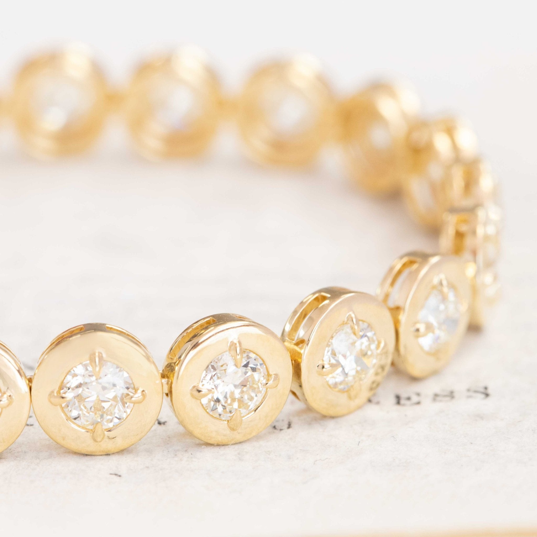 An original JbyG bracelet, set with Old European cut diamonds in buttery gold compass bezels. Inspired by a vintage riviere necklace we once had with similar settings, we felt that the Old Euros lent that delicious antique sparkle and charm, while also making for a classic piece of jewelry. The bezels add a bit more heft and presence to the bracelet, so she sits beautifully solo or stacked with your favorite curb link.