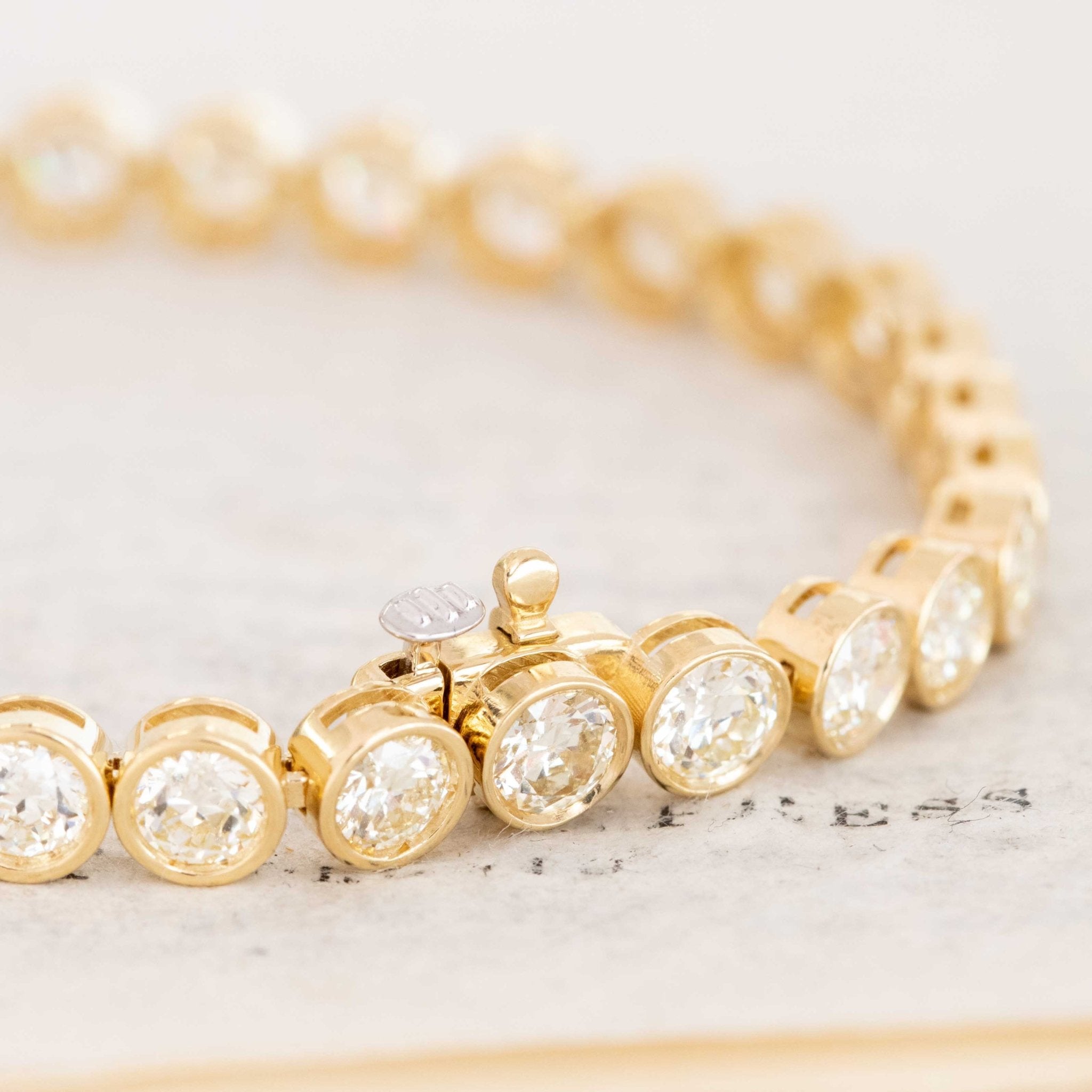 Nothing quite like a good ol' tennis bracelet to complete one's jewelry suite! This one is one of our own creation, set with juicy and delicious Old European cut diamonds in yellow gold bezels. Coming in at 8.37ctw total gem weight, we are big fans of the proportions on this baby. The diamonds are fiery and happy, with faceting we absolutely adore. Perfect solo, with a watch, with chain link bracelets - perfect all the darn time.
