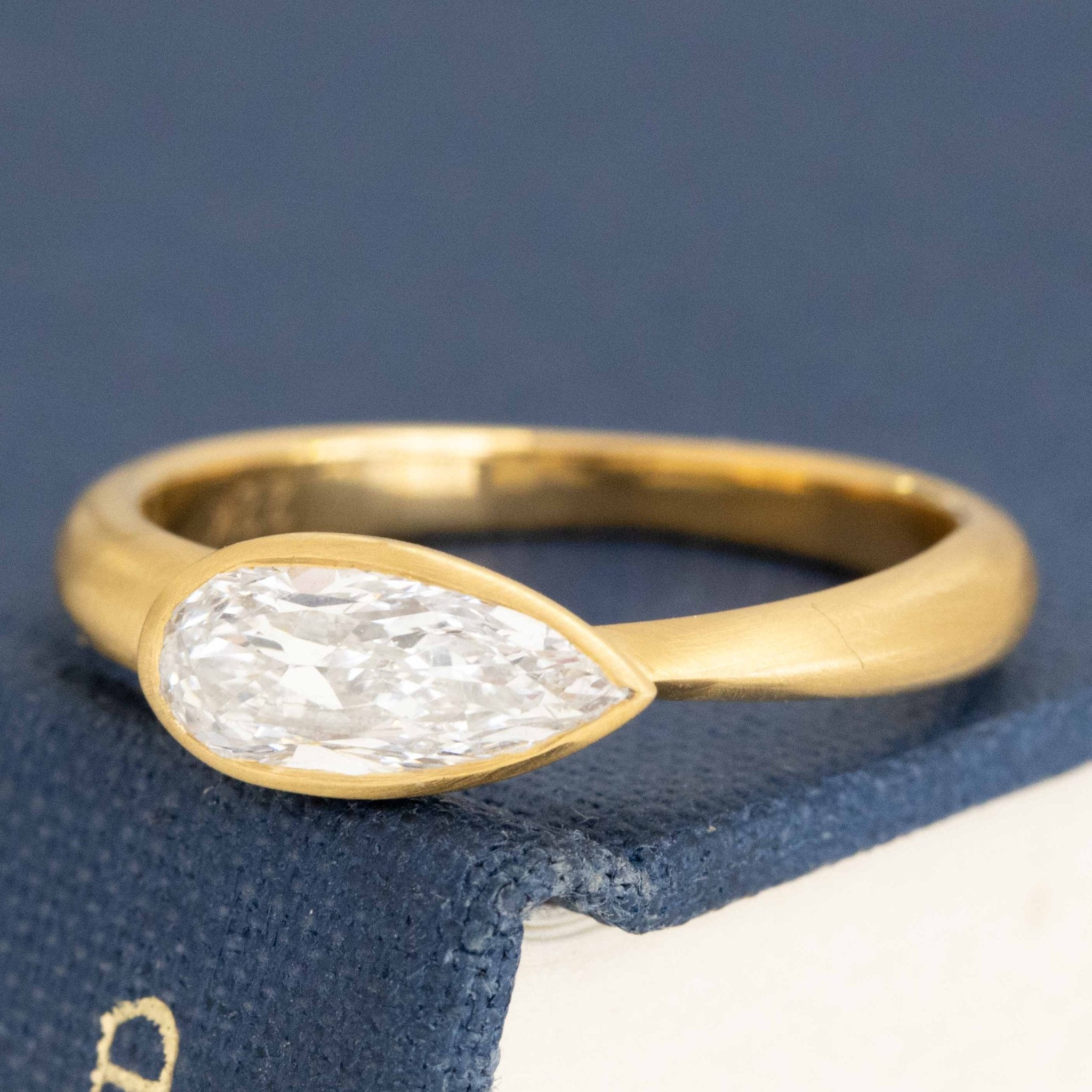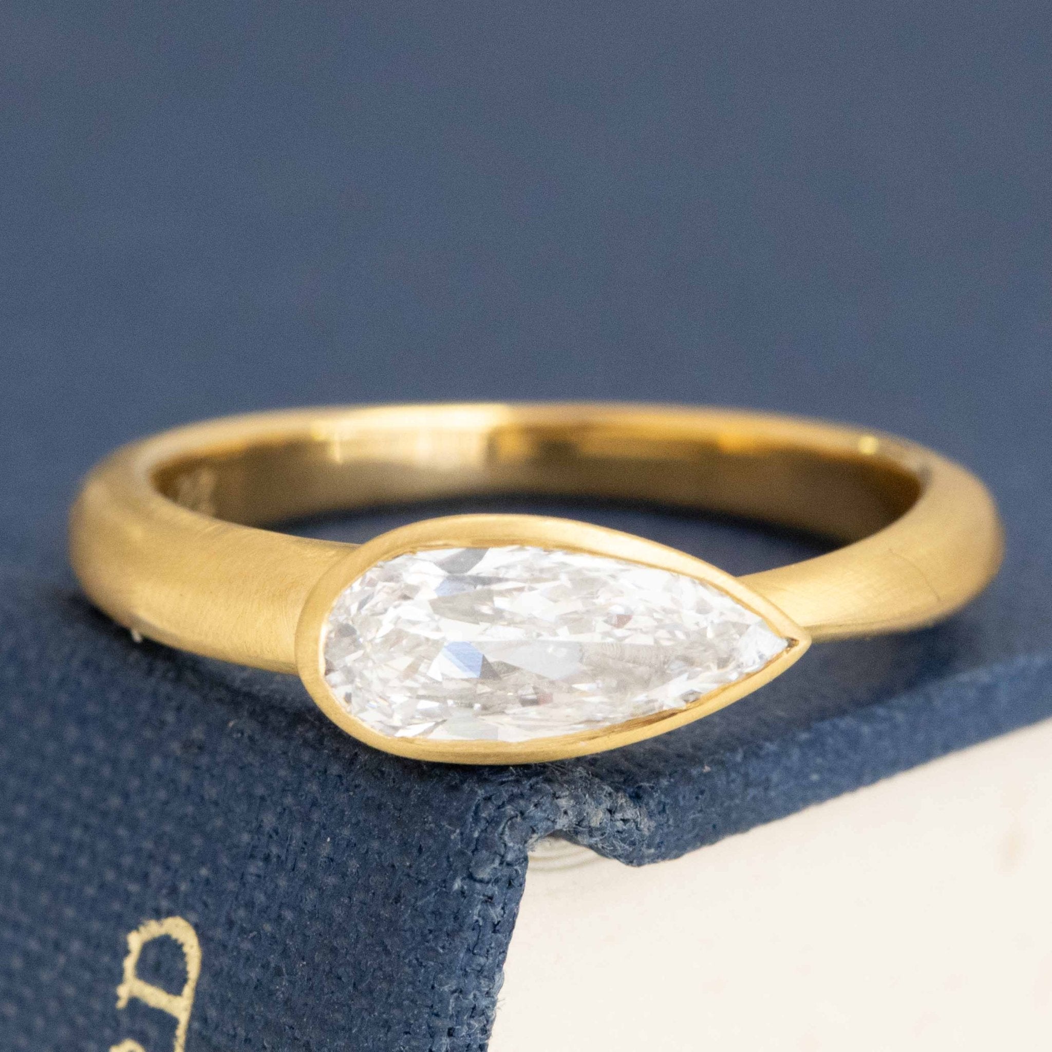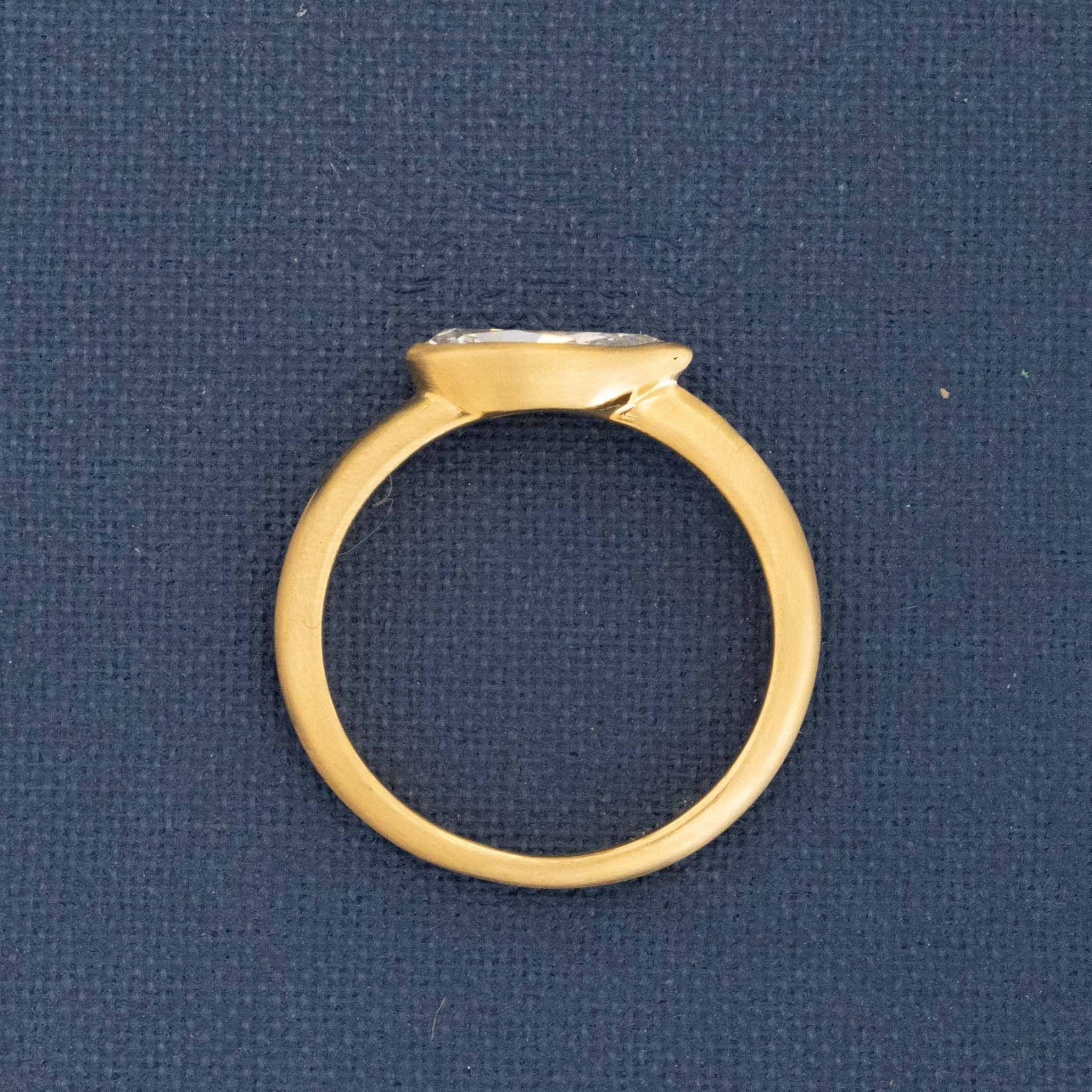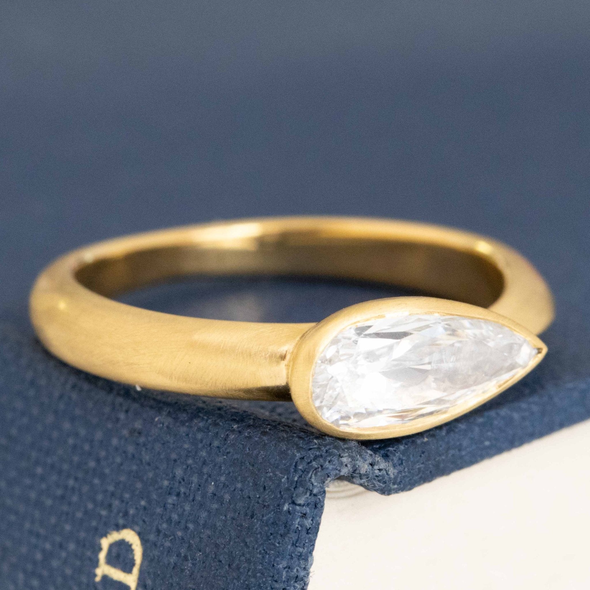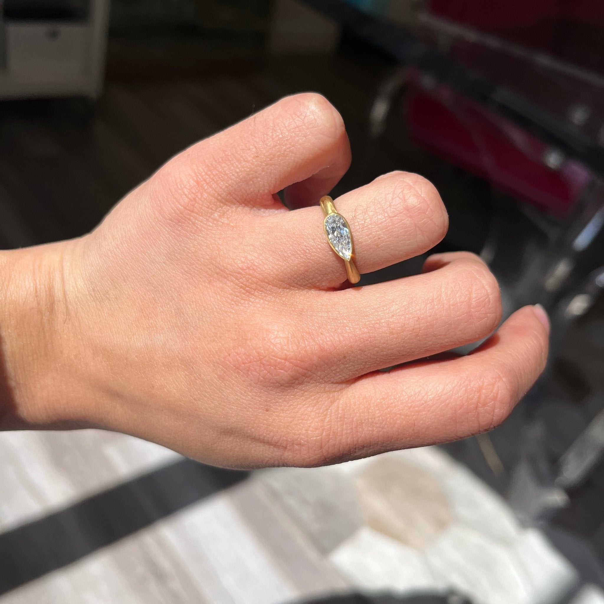 We set this sexy elongated pear shaped diamond into our high karat gold bezel setting and voila - she simply came alive! Sleek yet carrying some weight to her, the diamond s low set on the finger - the perfect modern with vintage leaning vibe. A light satin finish adds some richness and texture.