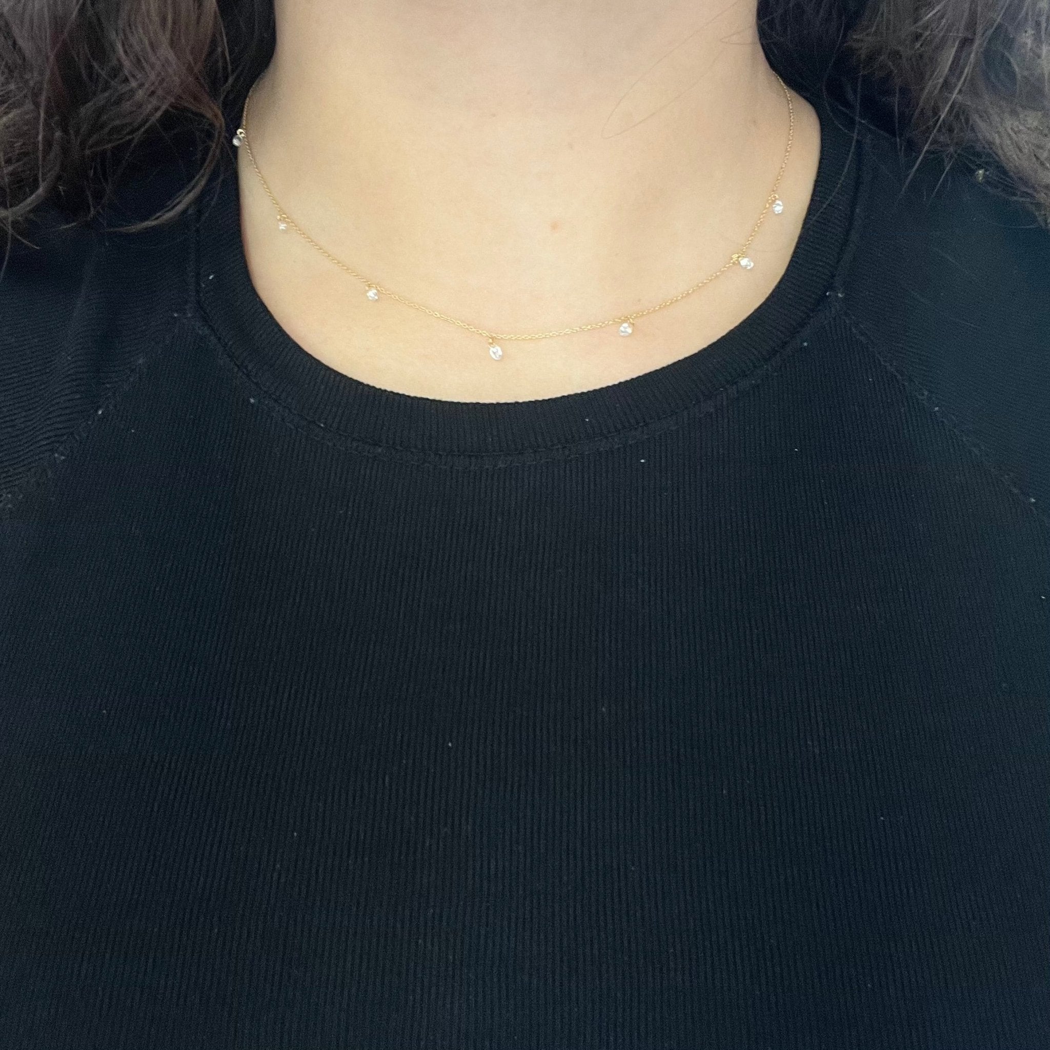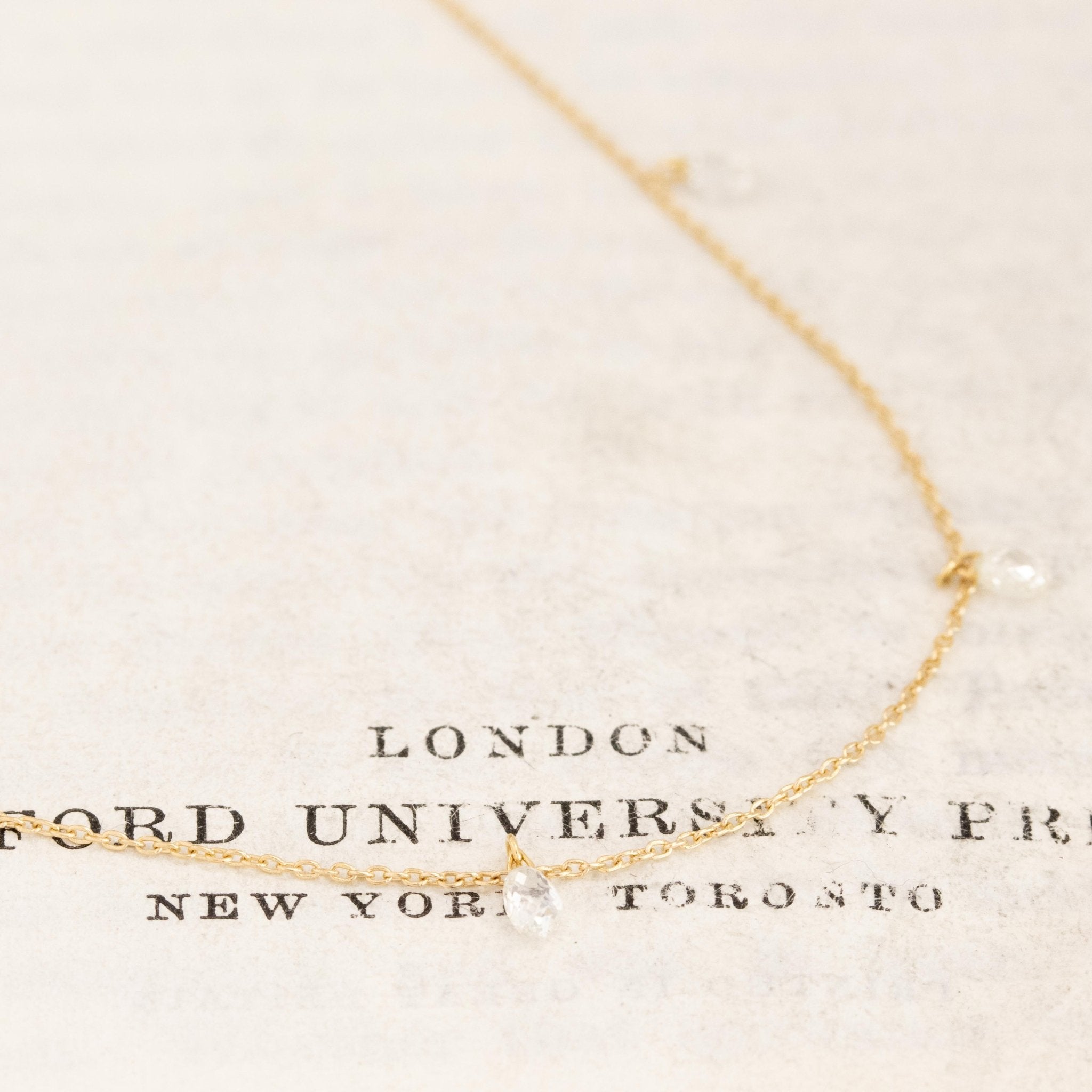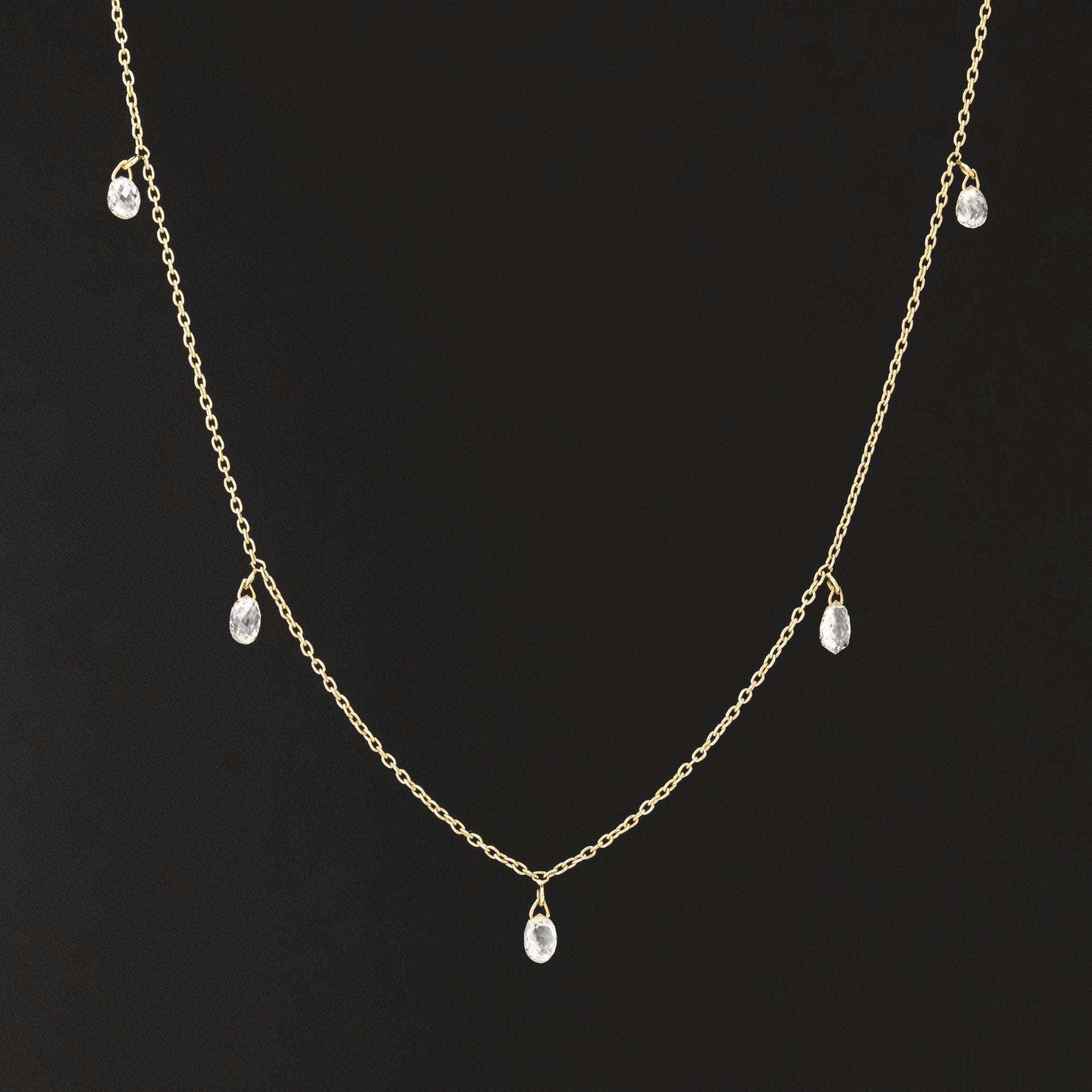 Dew drops on your decolletage! Five briolette diamonds are stationed on an 18kjt yellow gold chain, offering up subtle little "bloops" of sparkle.