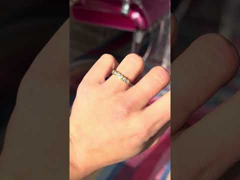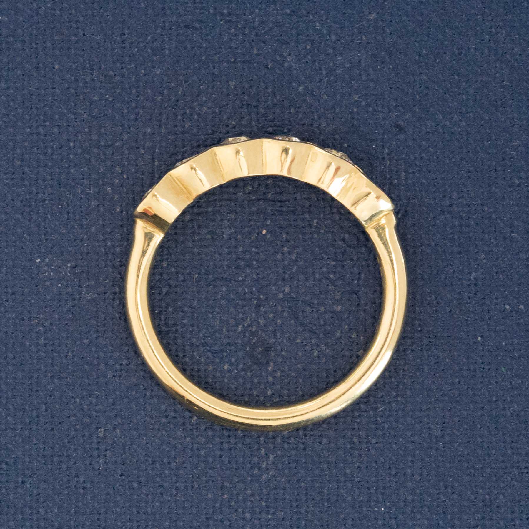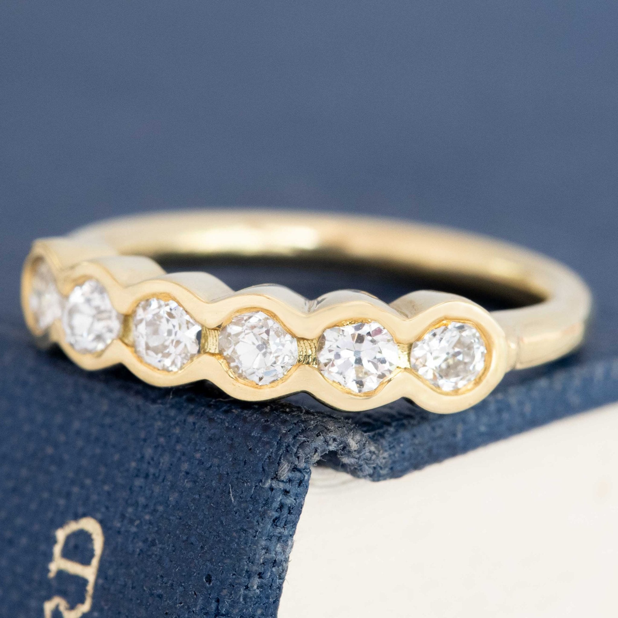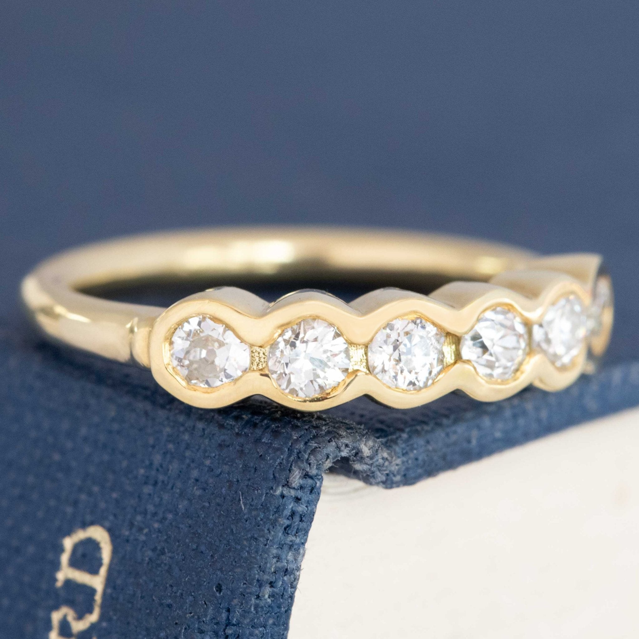 A diamond half hoop band with six bright and prismatic Old European cut diamonds, all wrapped together in chunky bezels. The stones themselves "kiss," meaning they touch side by side - we love the way the span across the finger and the stones sparkle like mad. An easy stacker or wedding band!