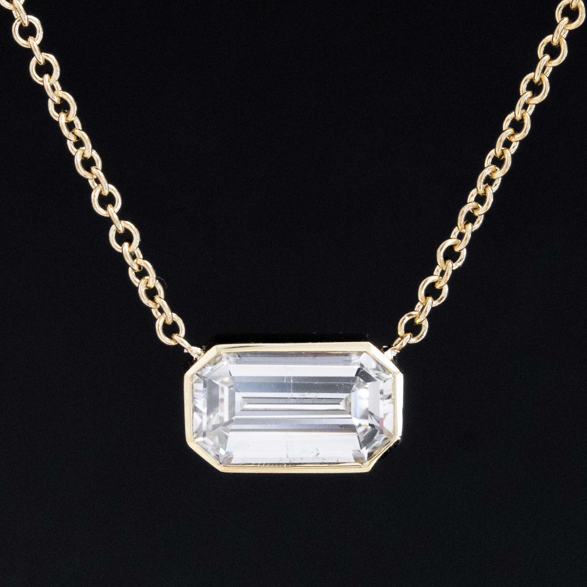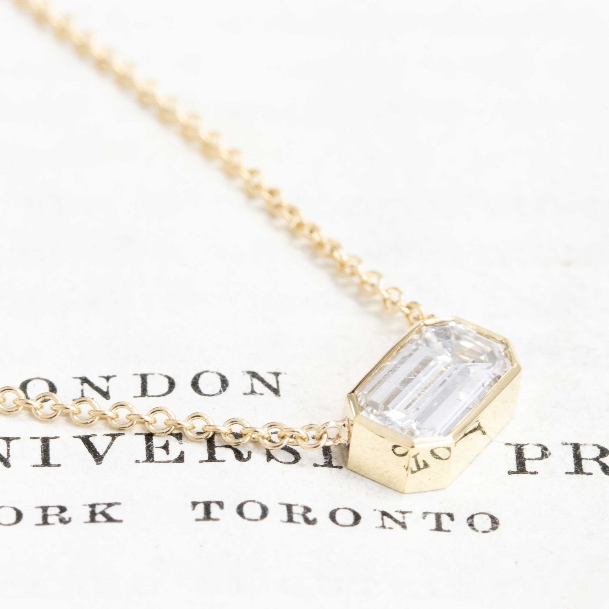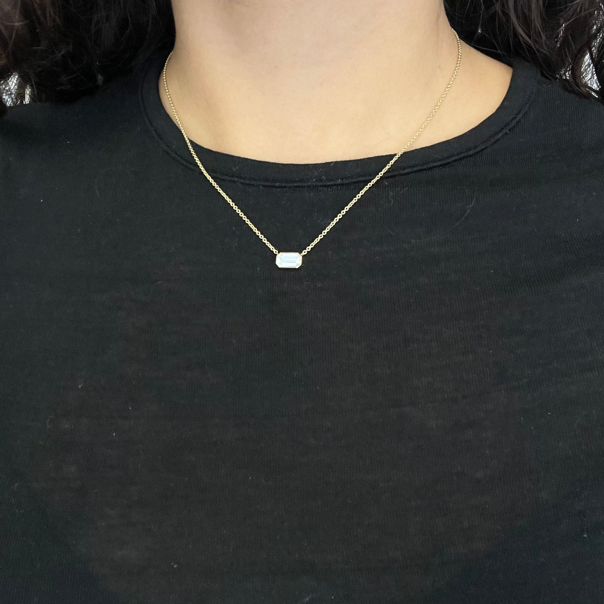 Elegant and timeless, this emerald cut bezel pendant is the perfect go-to piece for daily. She's perfect worn solo, or part of a layering stack.