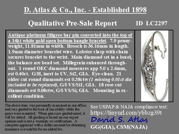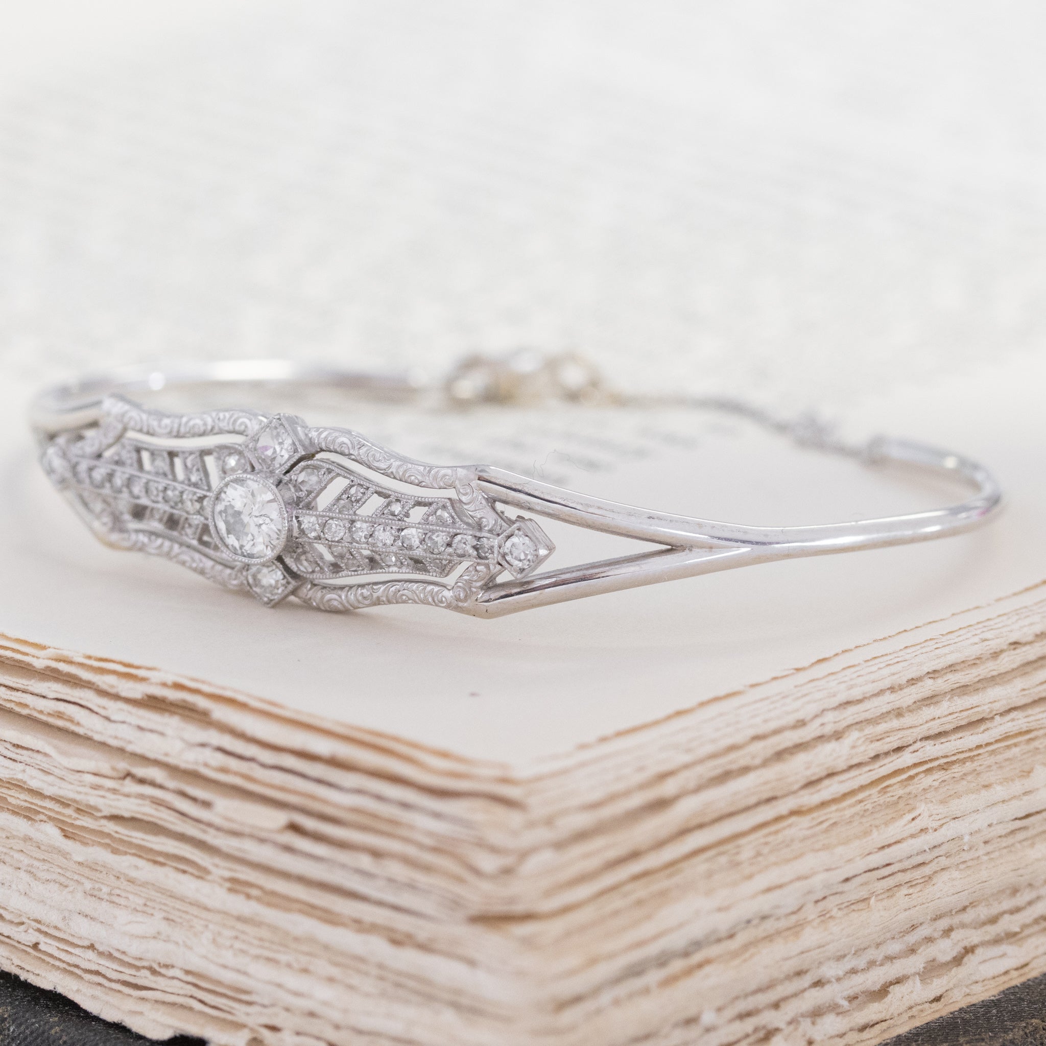 We love a good conversion moment here at JbyG - nothing is better than breathing new life into old treasures, making them wearable for decades to come! Such is the case for this Old Euro diamond bangle, which lived her former life as an antique brooch. This piece boasts all the classic features of antique jewelry - swoopy, elegant lines, delicate filigree, and masterful migraine details. Easy to wear every day, adding some antique glam to your wrist stack.