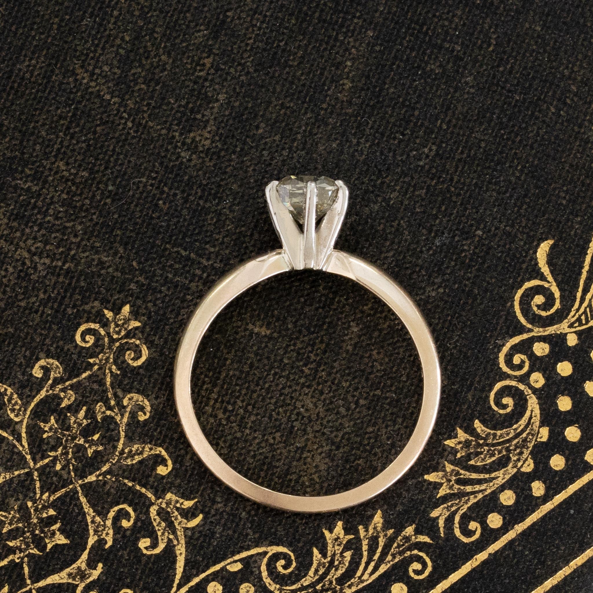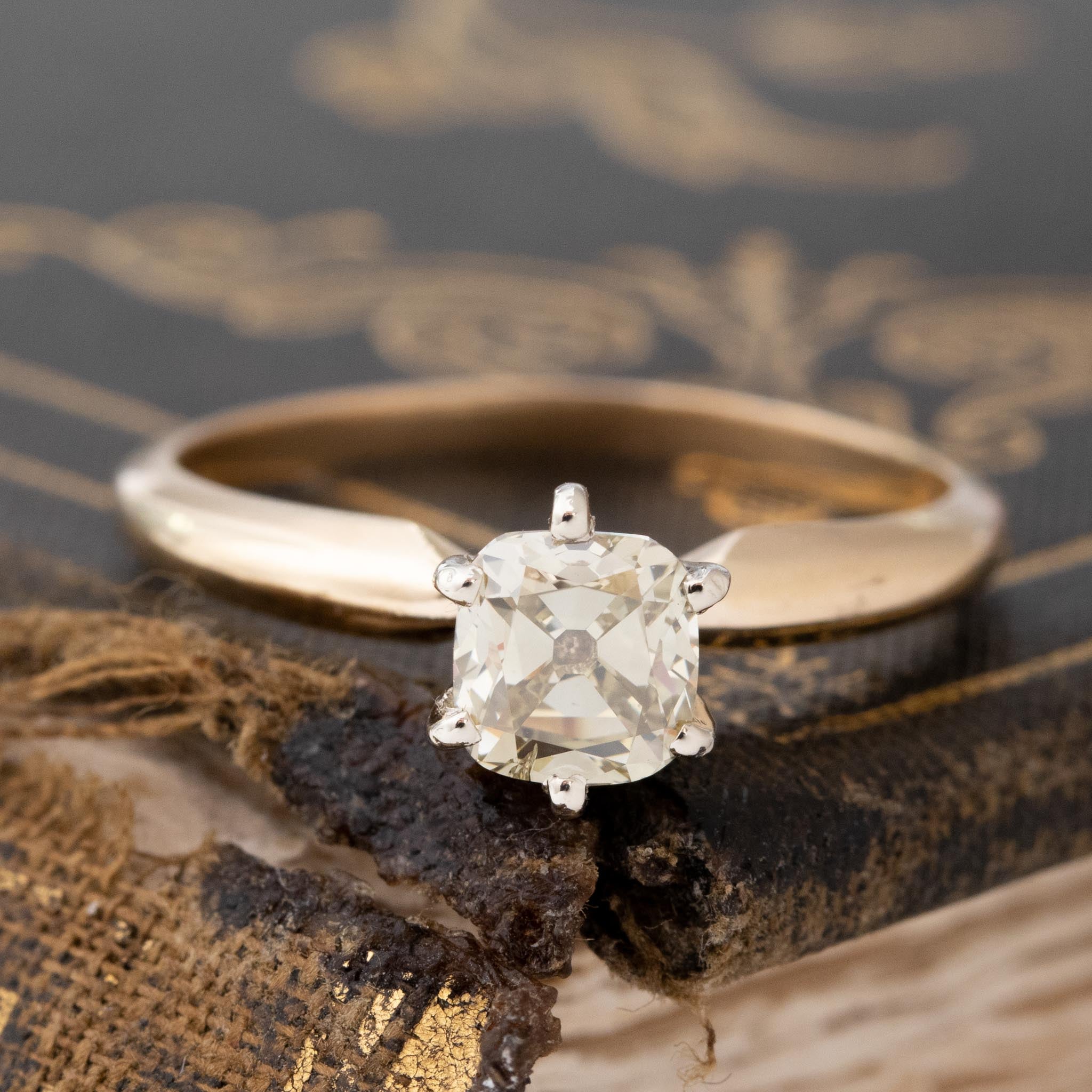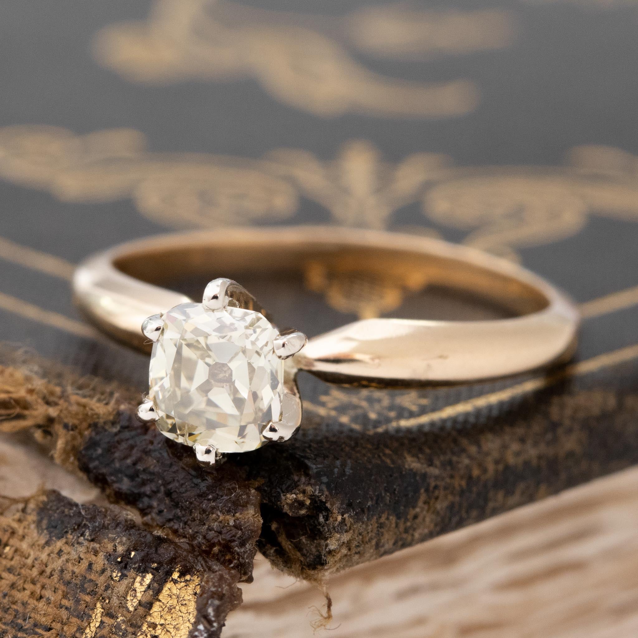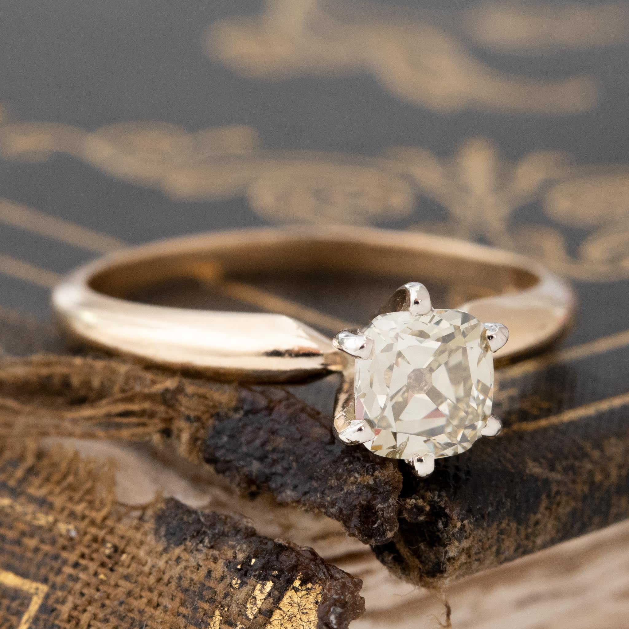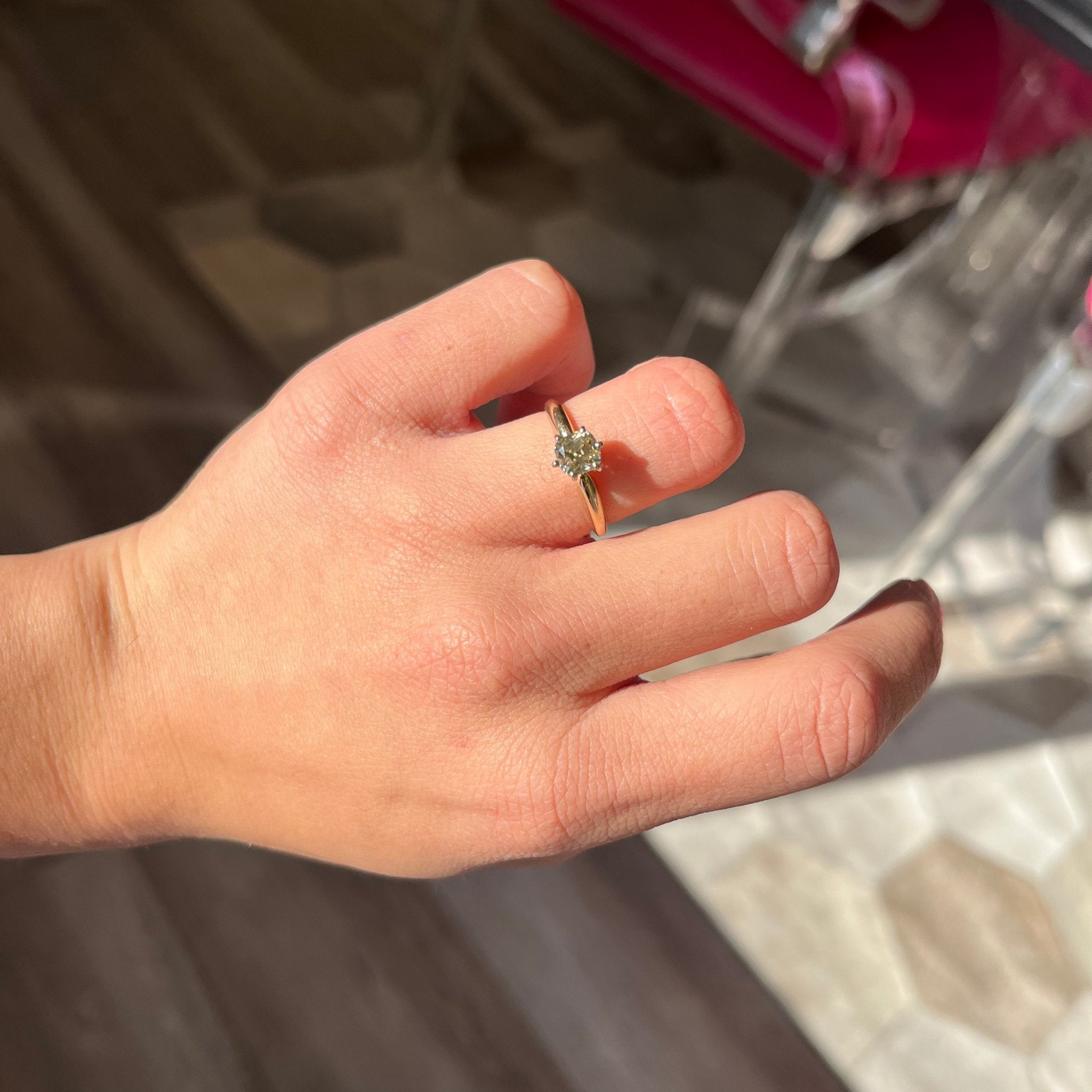 One of the most unique colored antique diamonds I have the pleasure of offering! The diamond is a true chameleon - offering up amber notes with flashes of green and yellow as the diamond catches the light. Chunky and charming, this antique solitaire is special and unique in its very own right. Just so beautiful on the finger!