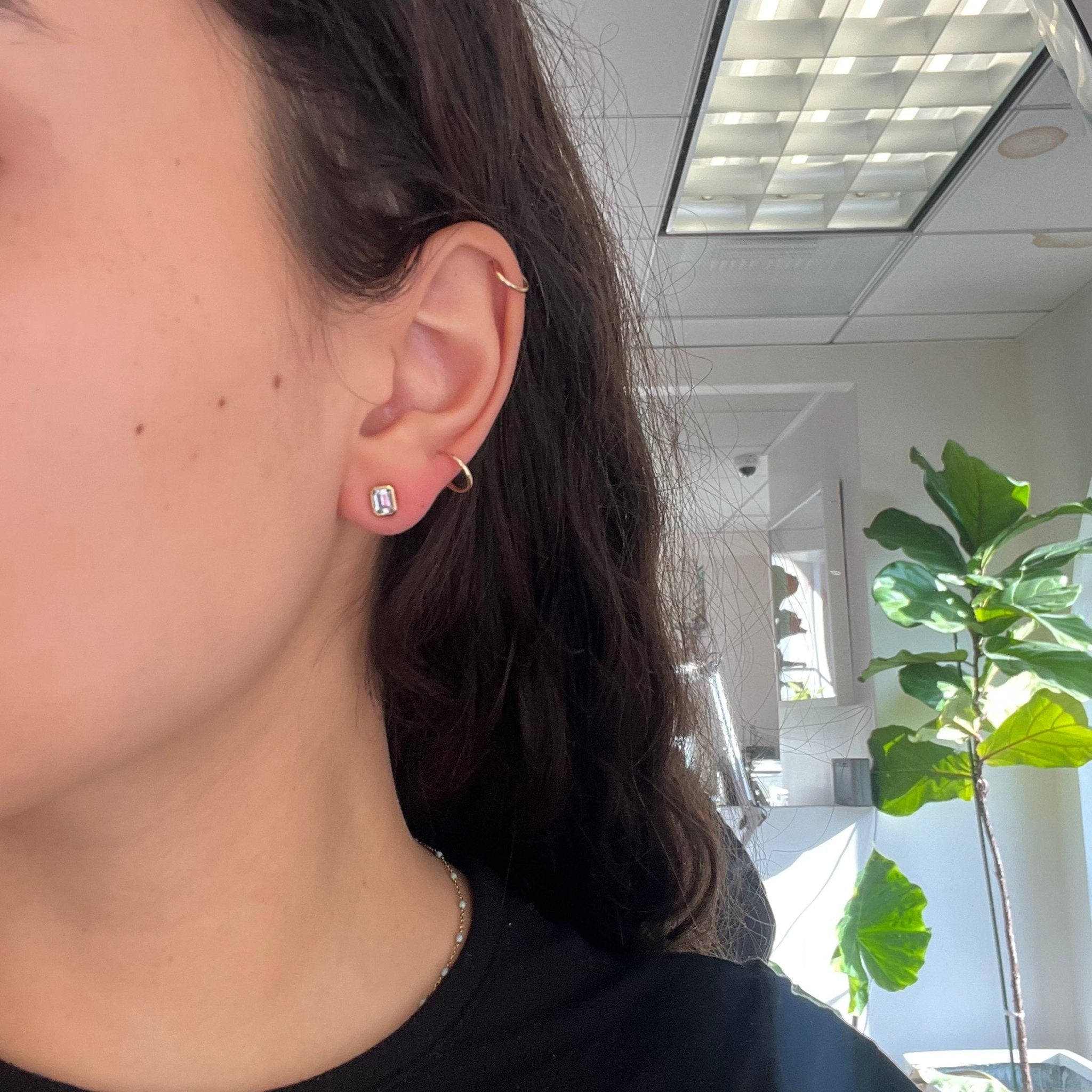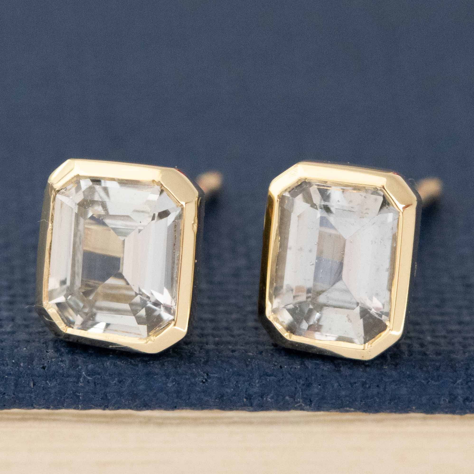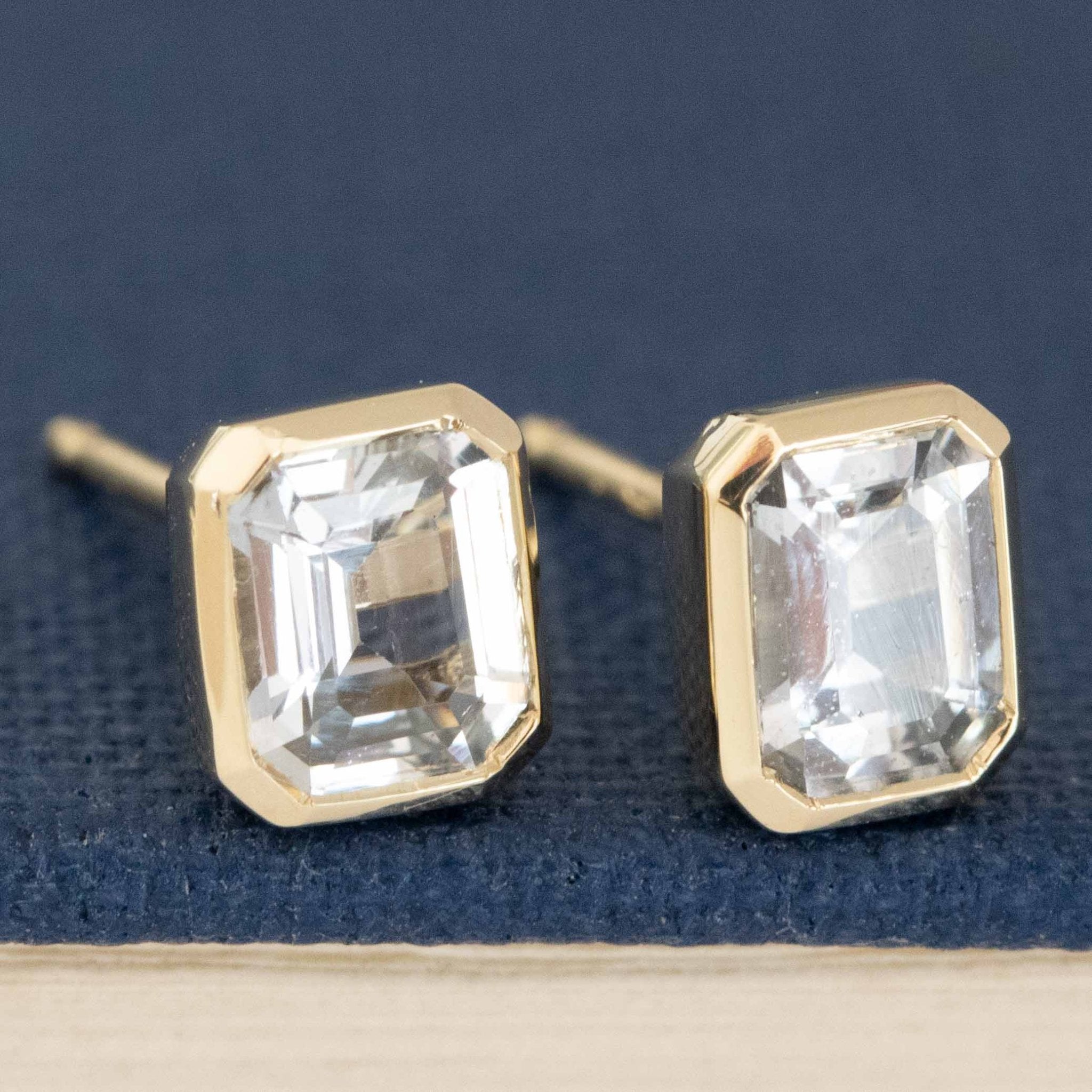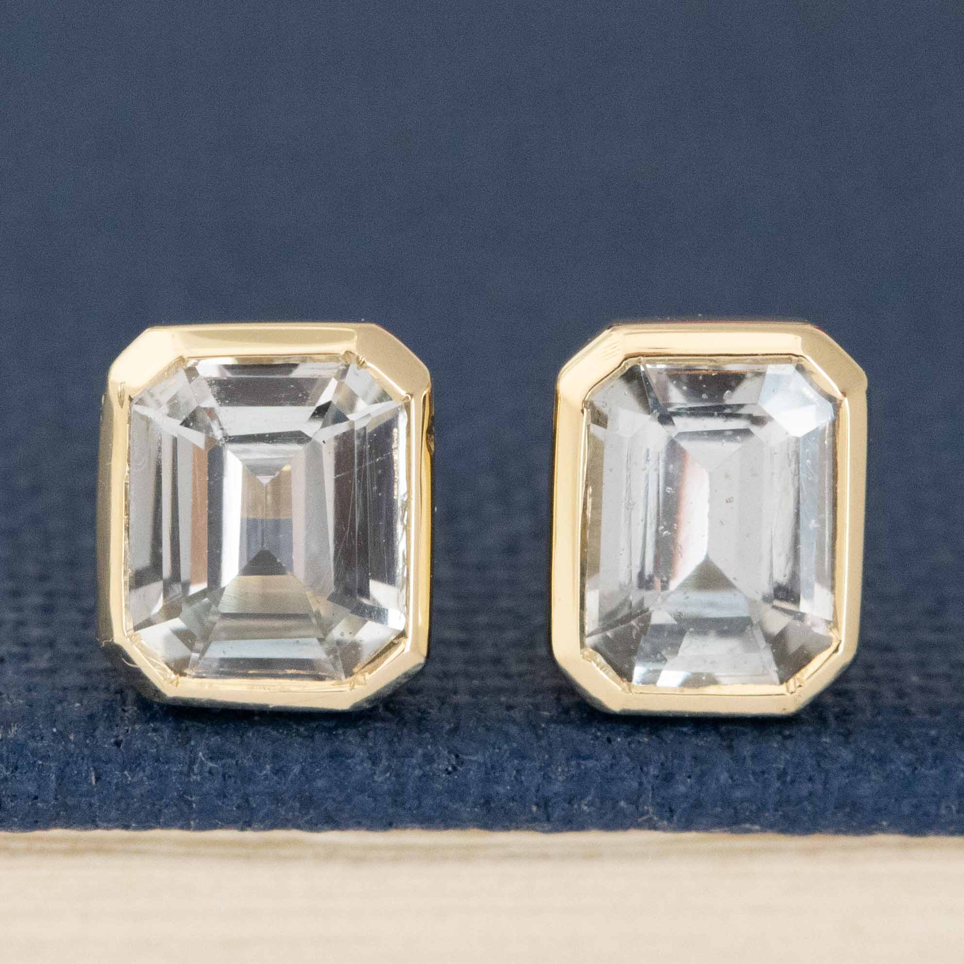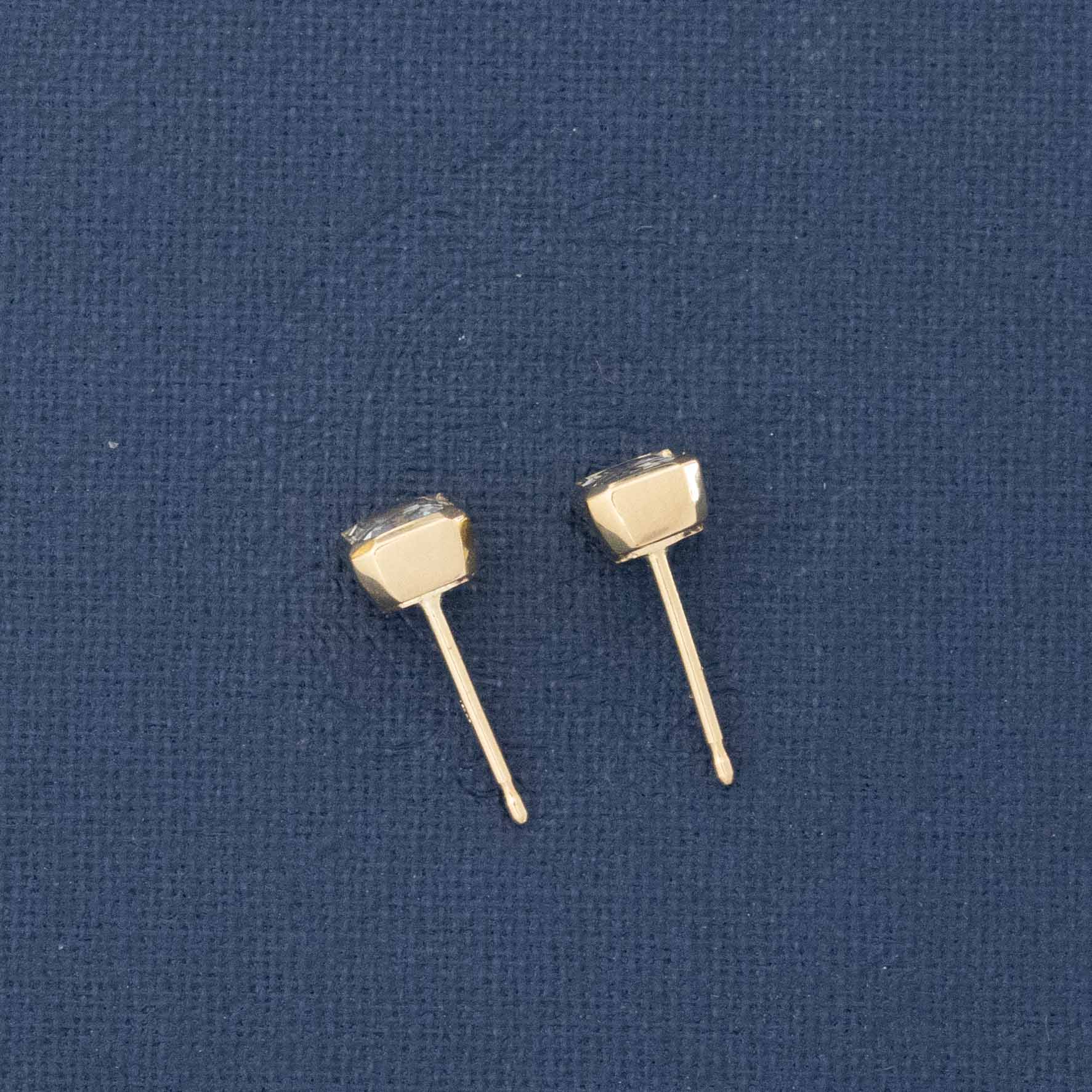 These sweet, pale blue babies have great spread and look beautiful in 14kt yellow gold. The bezels help emphasize those crisp, geometric corners while adding a bit more size on the lobes. Perfect studs, if you ask us!