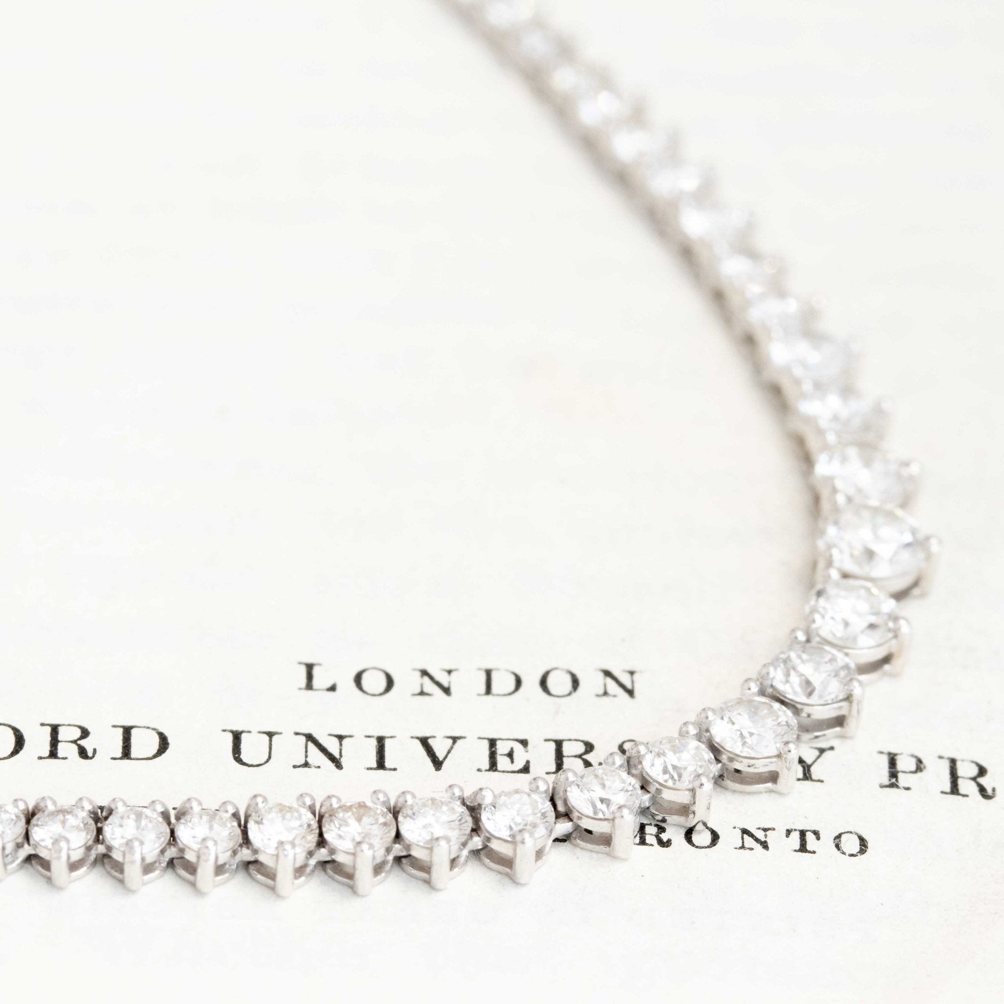 A classic diamond tennis necklace in white gold, with sparkly round brilliants sure to spruce up your neck stack! Each diamond sits in three prongs, graduated in size, incredibly bright and white in color. We love the subtle touch of yellow gold that peaks through, making it the perfect piece to dress up any outfit.'