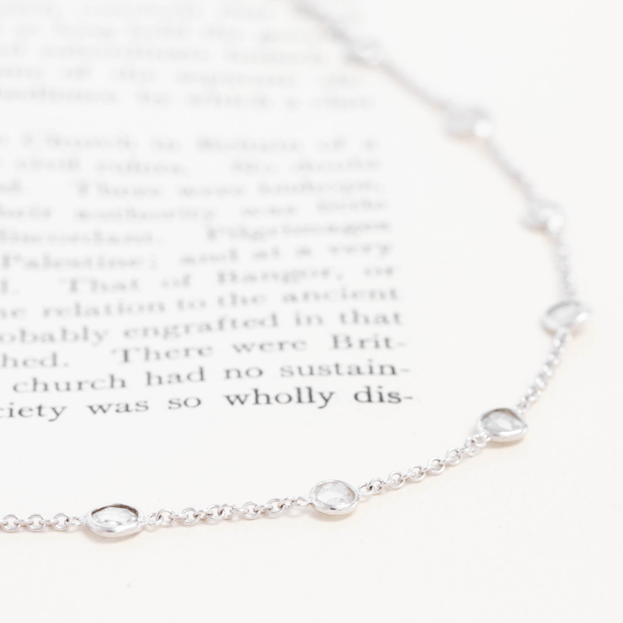 - 18kt white gold wire bezels and chain, with a lobster lock.