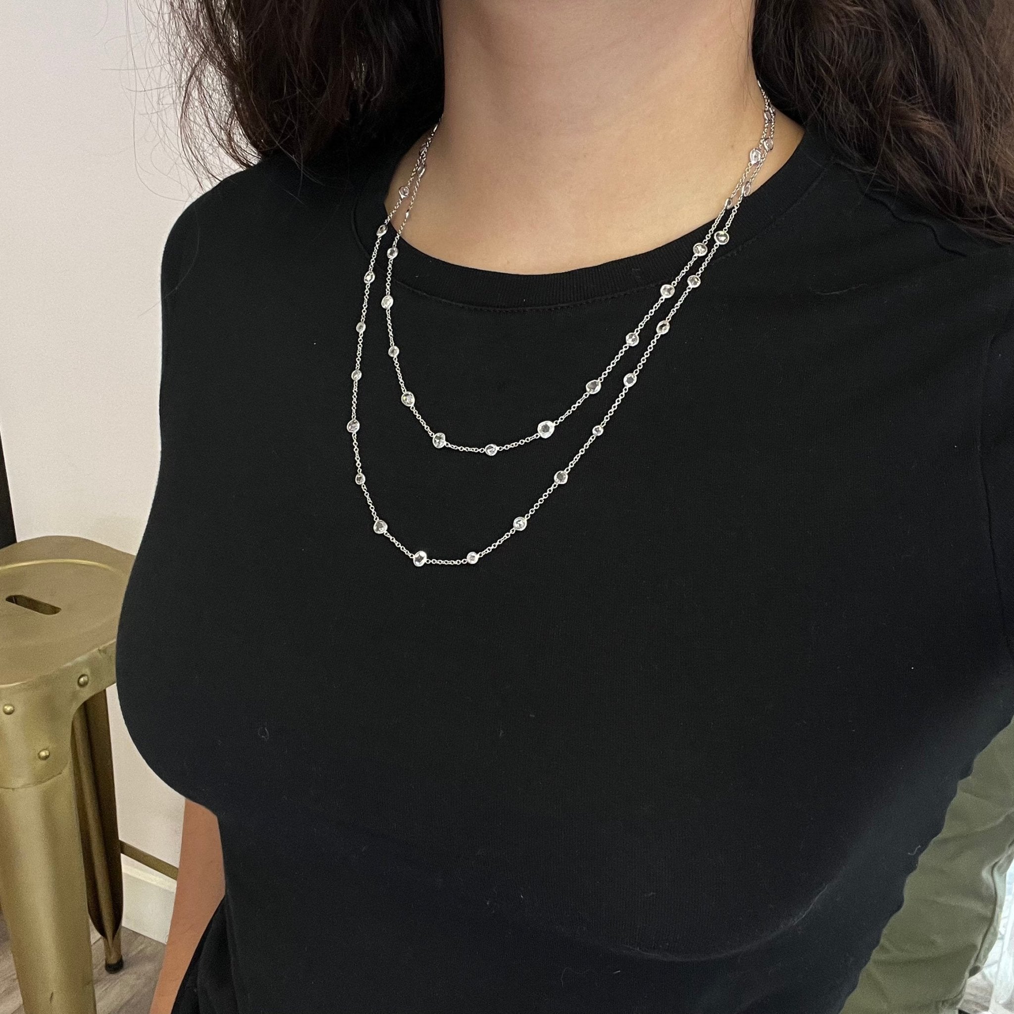I picked up this 9.11ctw of antique rose cut diamonds, and what better way to enjoy them than in this rope length (40") long chain necklace? The diamonds are of various sizes and shapes, and set half an inch apart for maximum sparkle. I find this length to be the most versatile - allowing one to wear it long and elegant, and also the perfect length to wear doubled up. The style also has the added versatility of being able to hang a pendant or a charm (to be worn on the shorter layer).