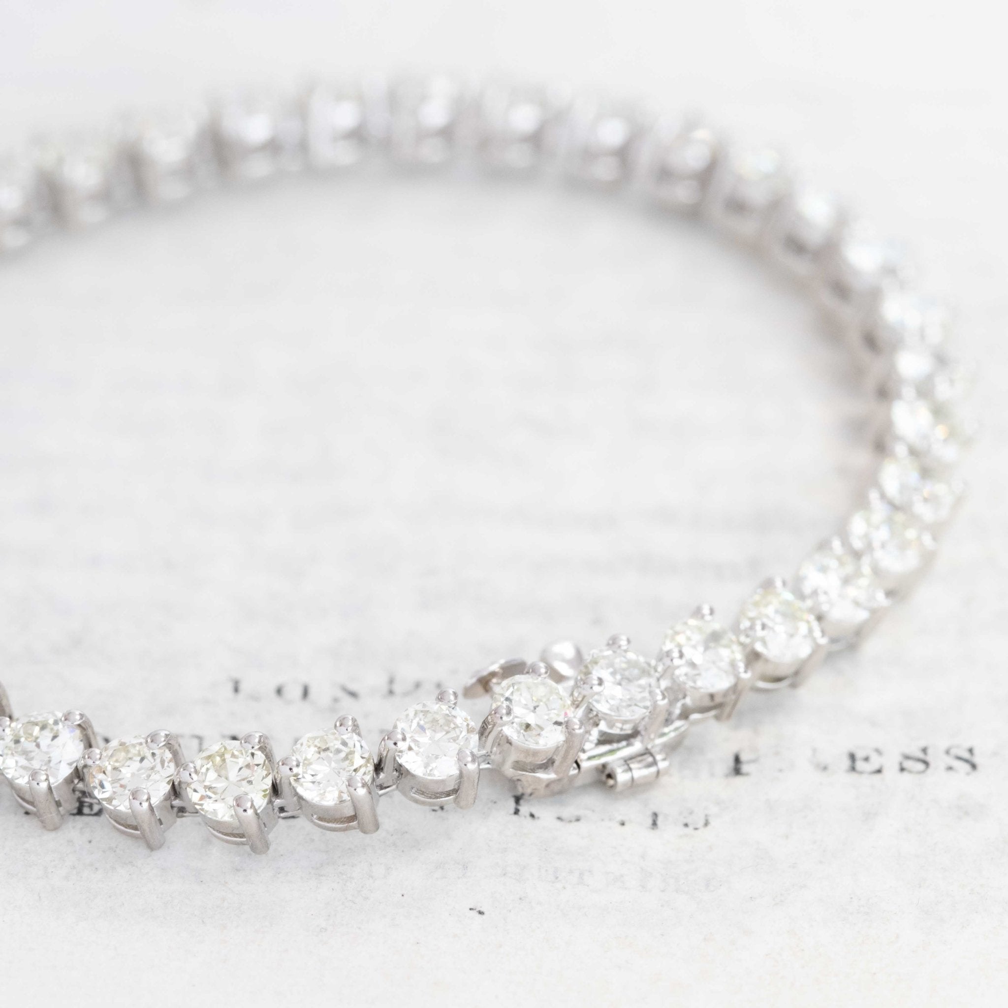 Just over 9ctw of Old European cut diamonds float along one’s wrist in crisp platinum - an absolute dream, if you ask me! The diamonds themselves sit in 3-prong galleries and have such bright sparkle and faceting. Old European cut diamonds do plenty of talking for themselves, so we find this to be a great option for those who want a more diamond-heavy look on the wrists.