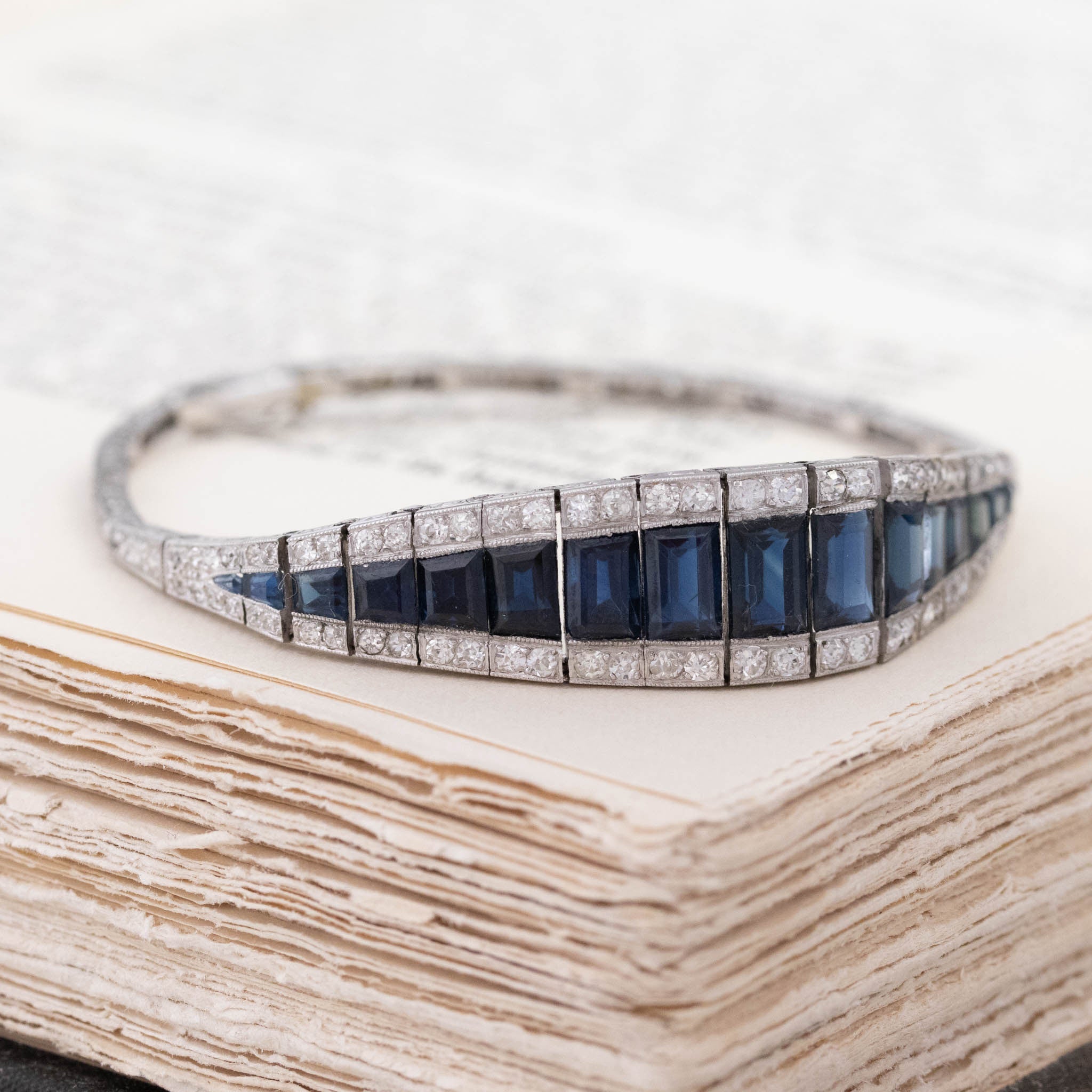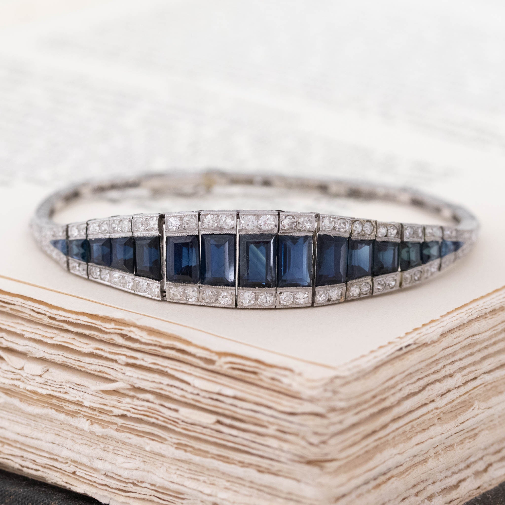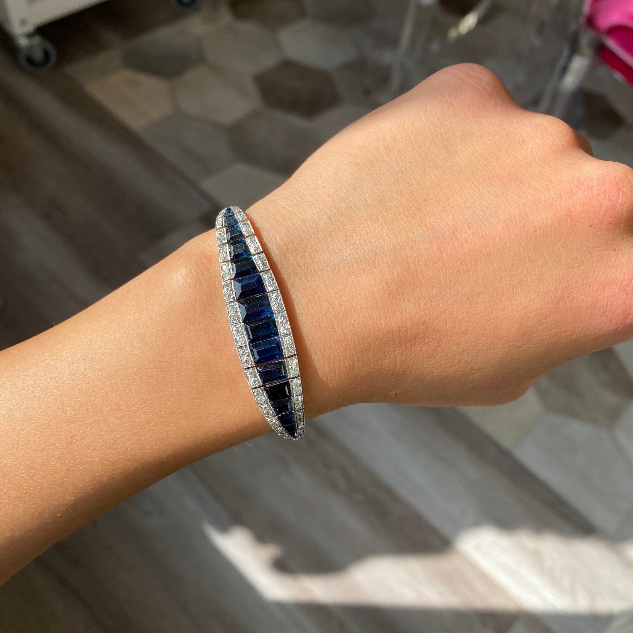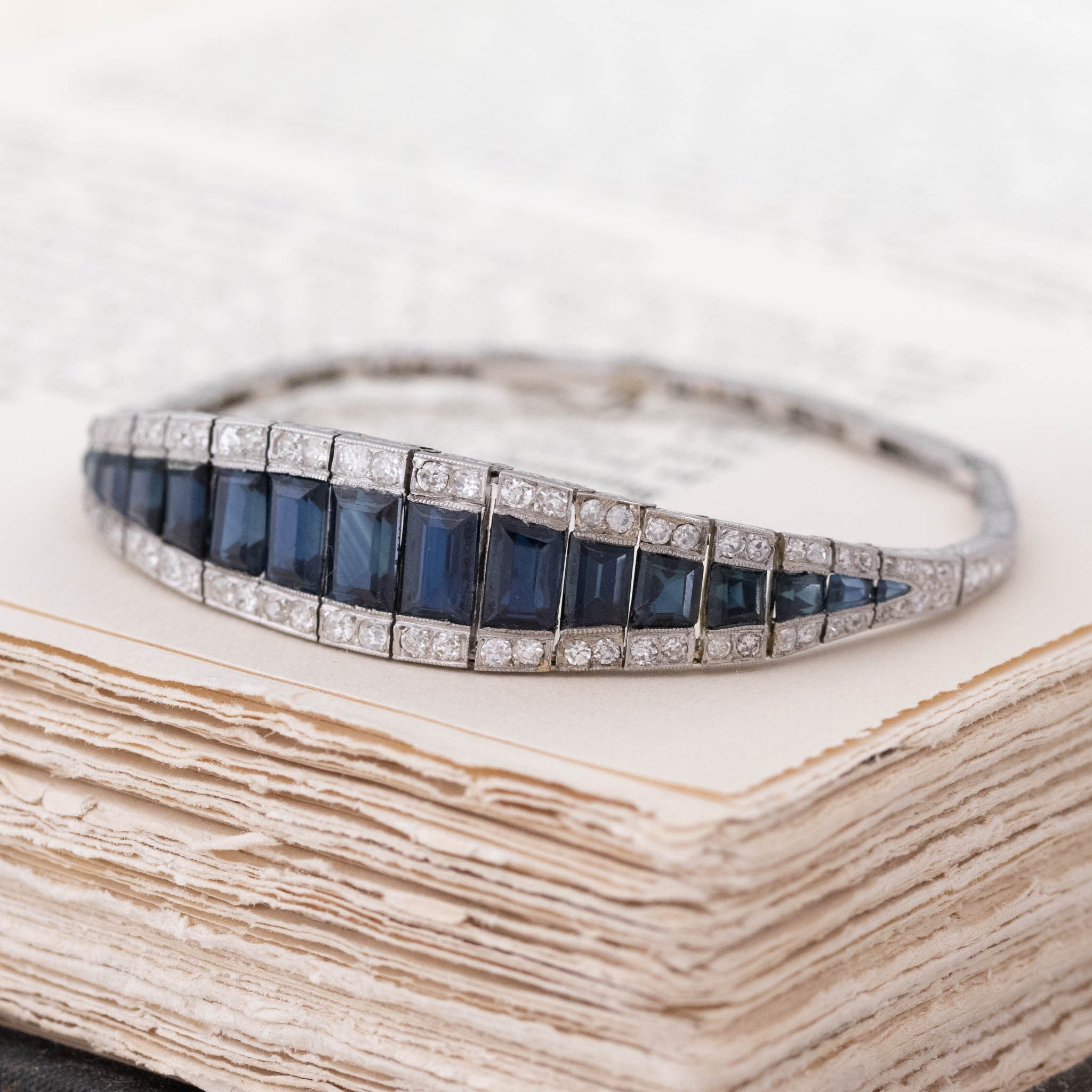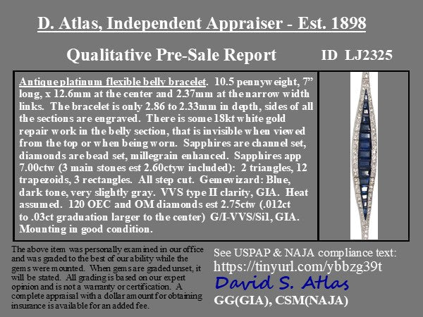 Belly bracelets get their names from their slightly curved form - much like a belly! The caliber-cut sapphires in the center as absolutely magical - all step cuts, graduating in size and form to create a fluid blue form in the center. Old Euros and old mines are studded in the halo, giving not only that classic diamond-sapphire color combo but also adding plenty of sparkle into the mix. An antique treasure for sure.