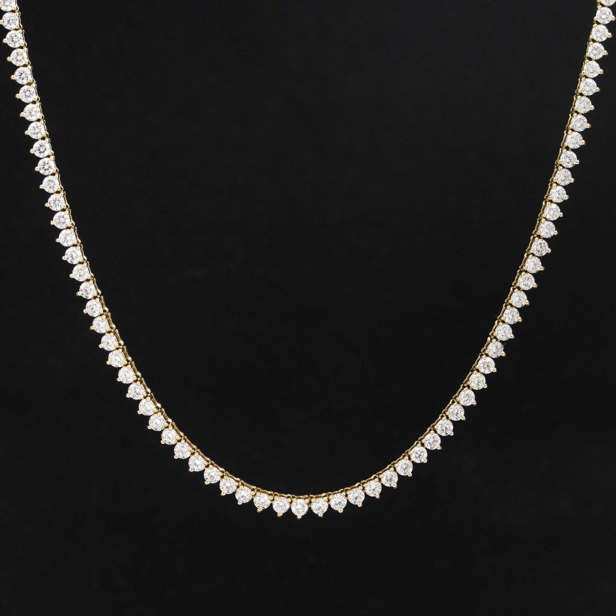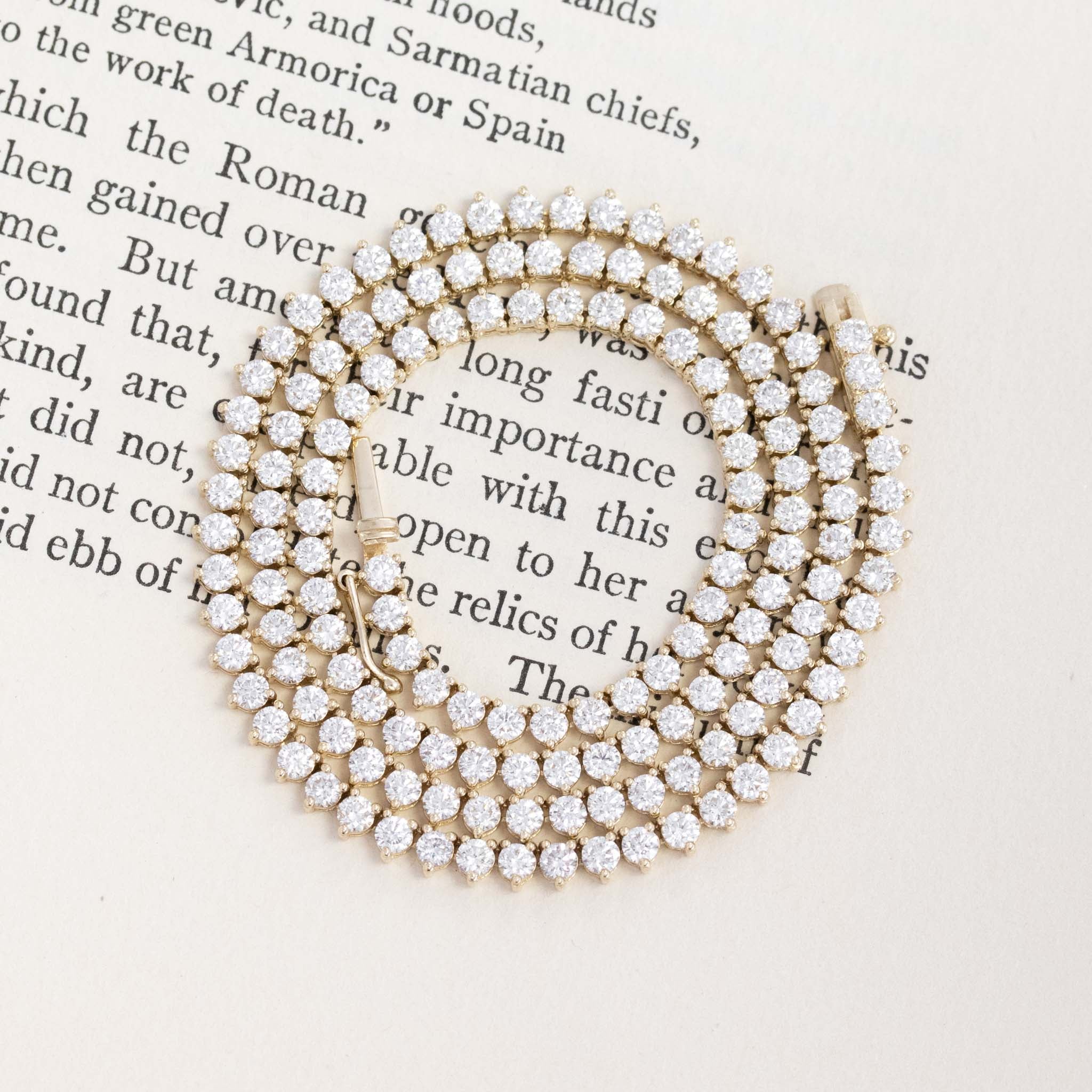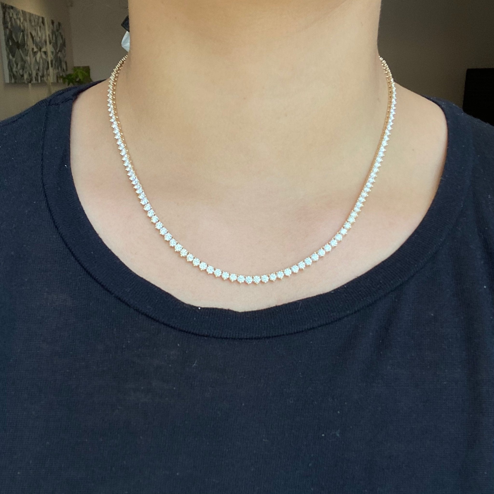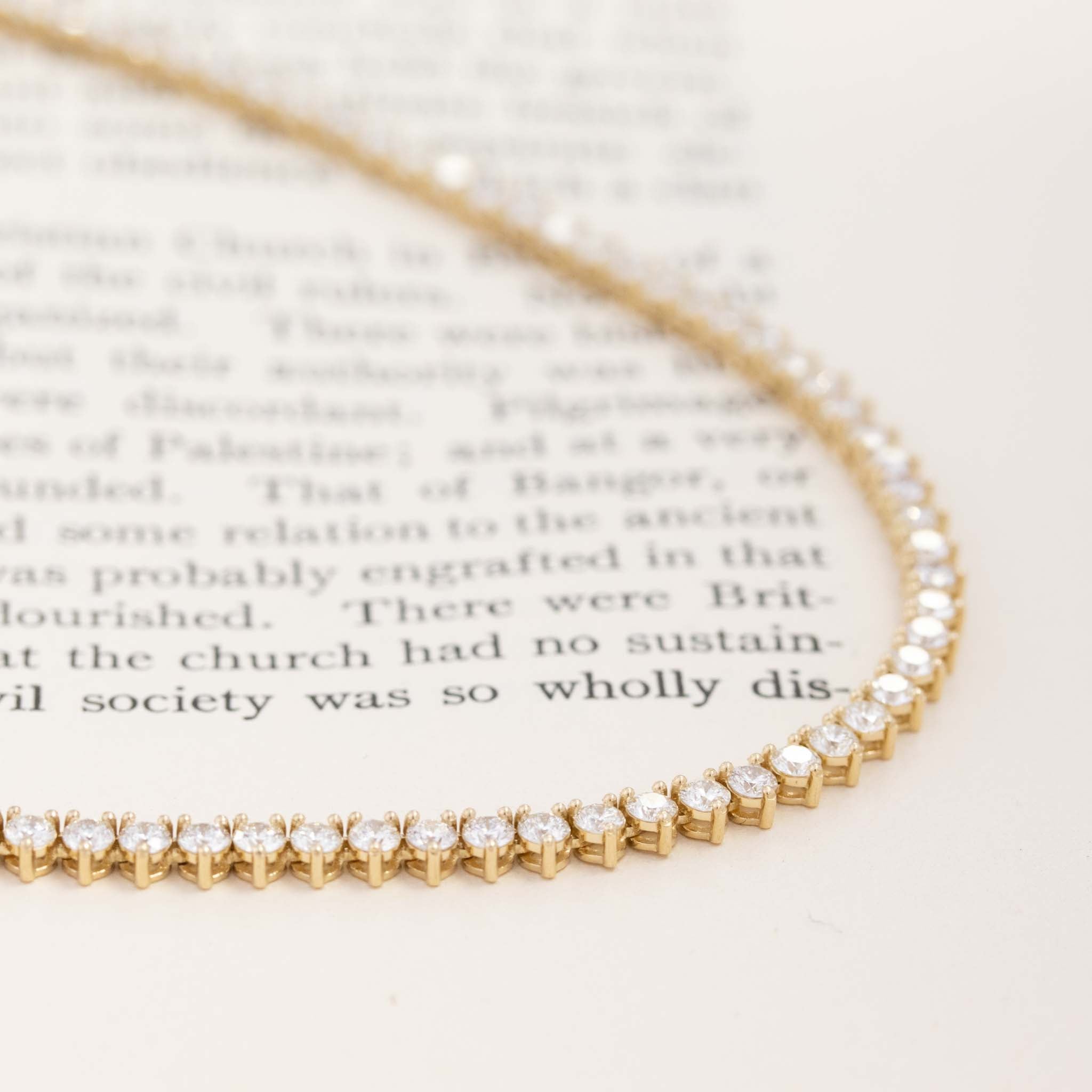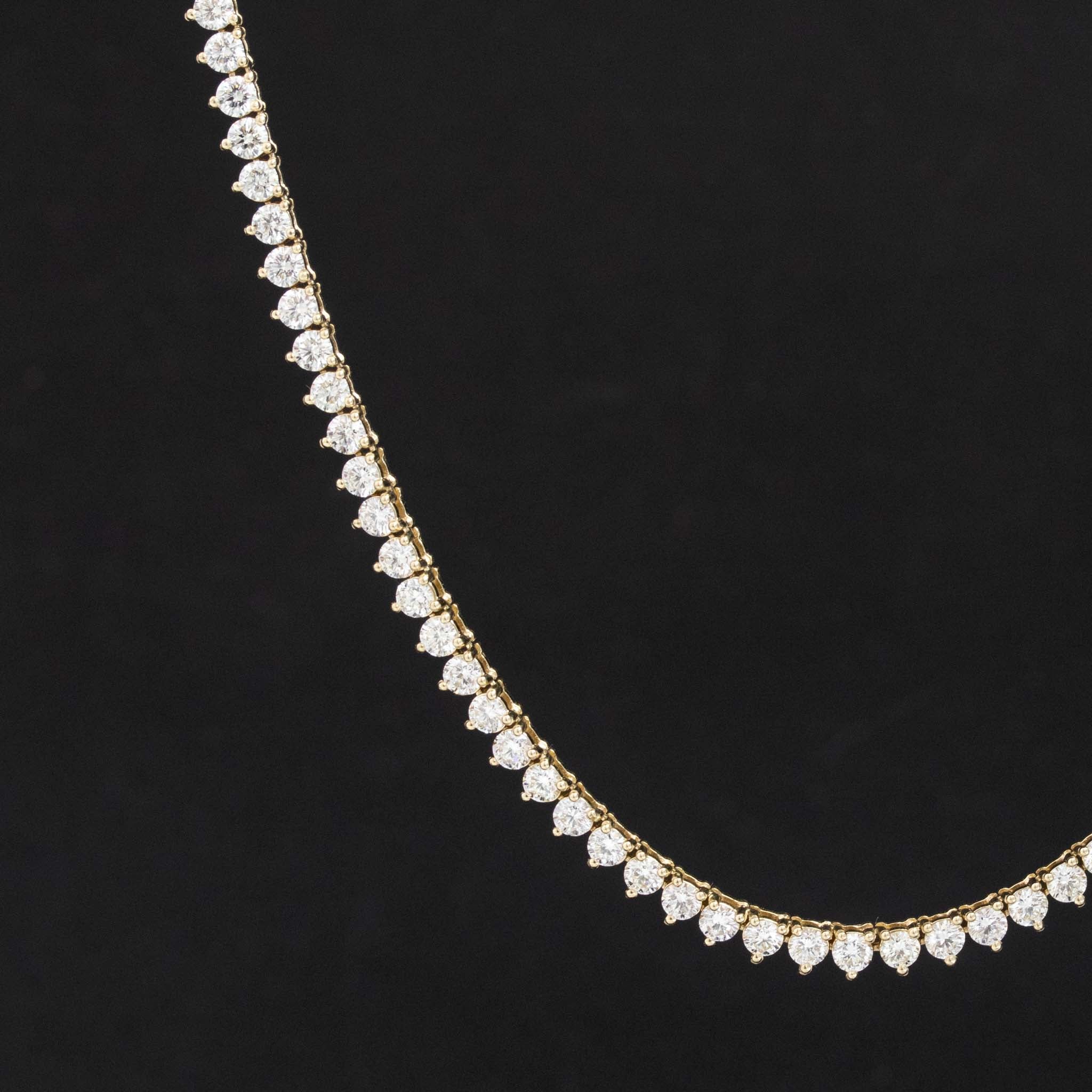 A classic diamond tennis necklace in yellow gold, with sparkly round brilliants sure to spruce up your neck stack! Each diamond sits in three prongs, all uniform in size, incredibly bright and white in color. We love the subtle touch of yellow gold that peaks through, making it the perfect piece to dress up any outfit.