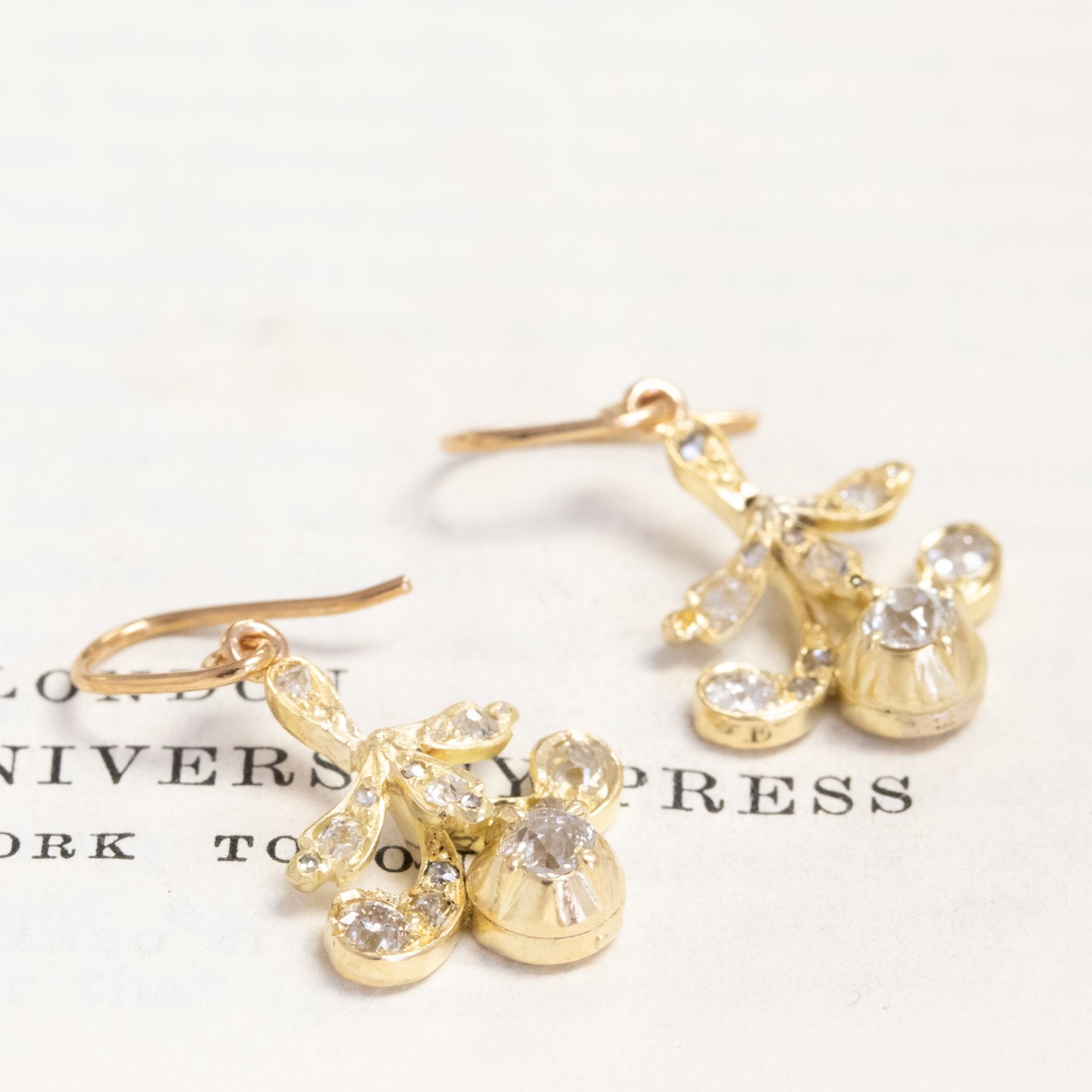We made these diamond drop earrings using antique components from a broken brooch - the result is a pair that is elegant, unique, and sparkly beyond belief! Each earrings has a unique and ornamental form to it, we love the way they dangle and hang off of the lobes. Bold and delicate at the same time with such prismatic sparkle. We love them!