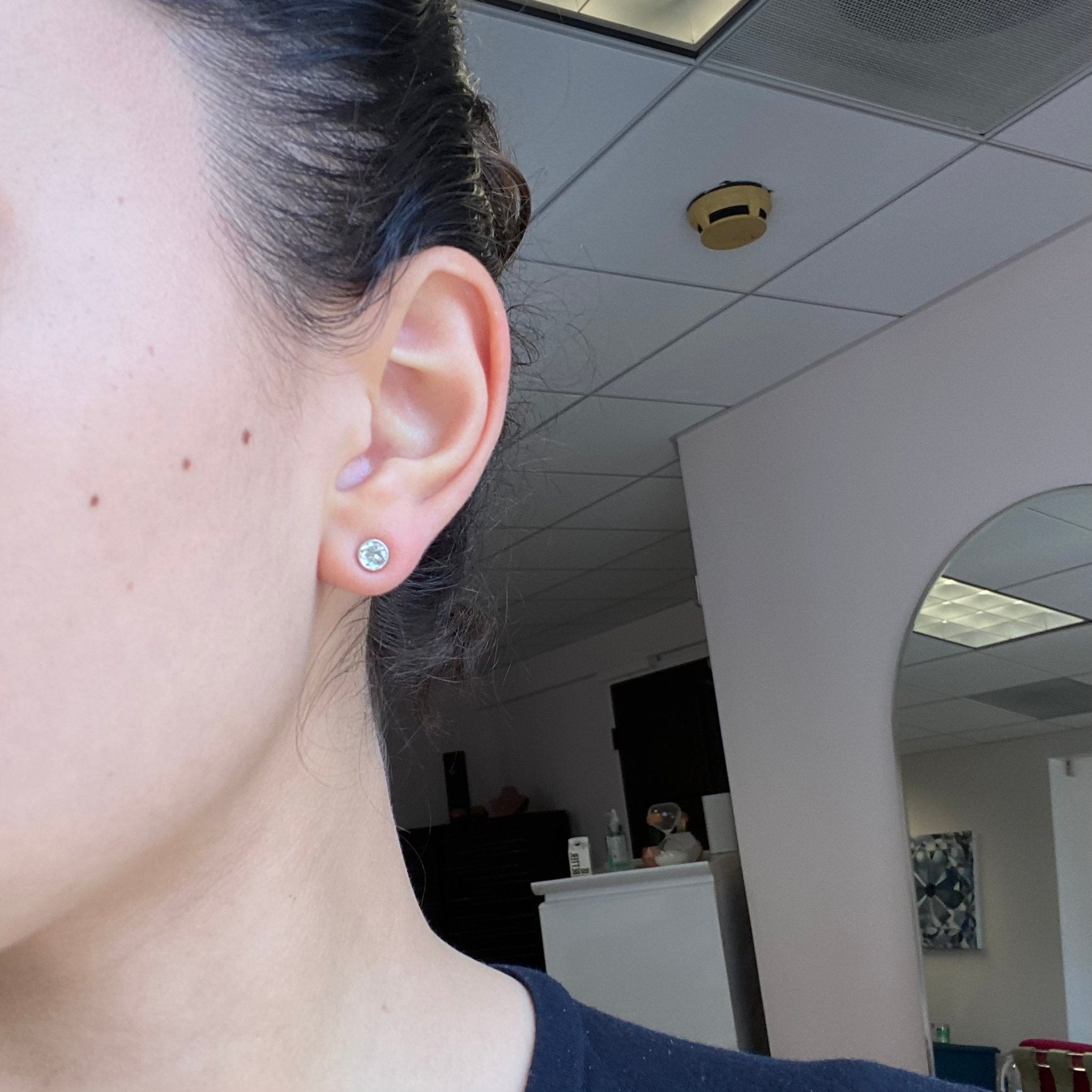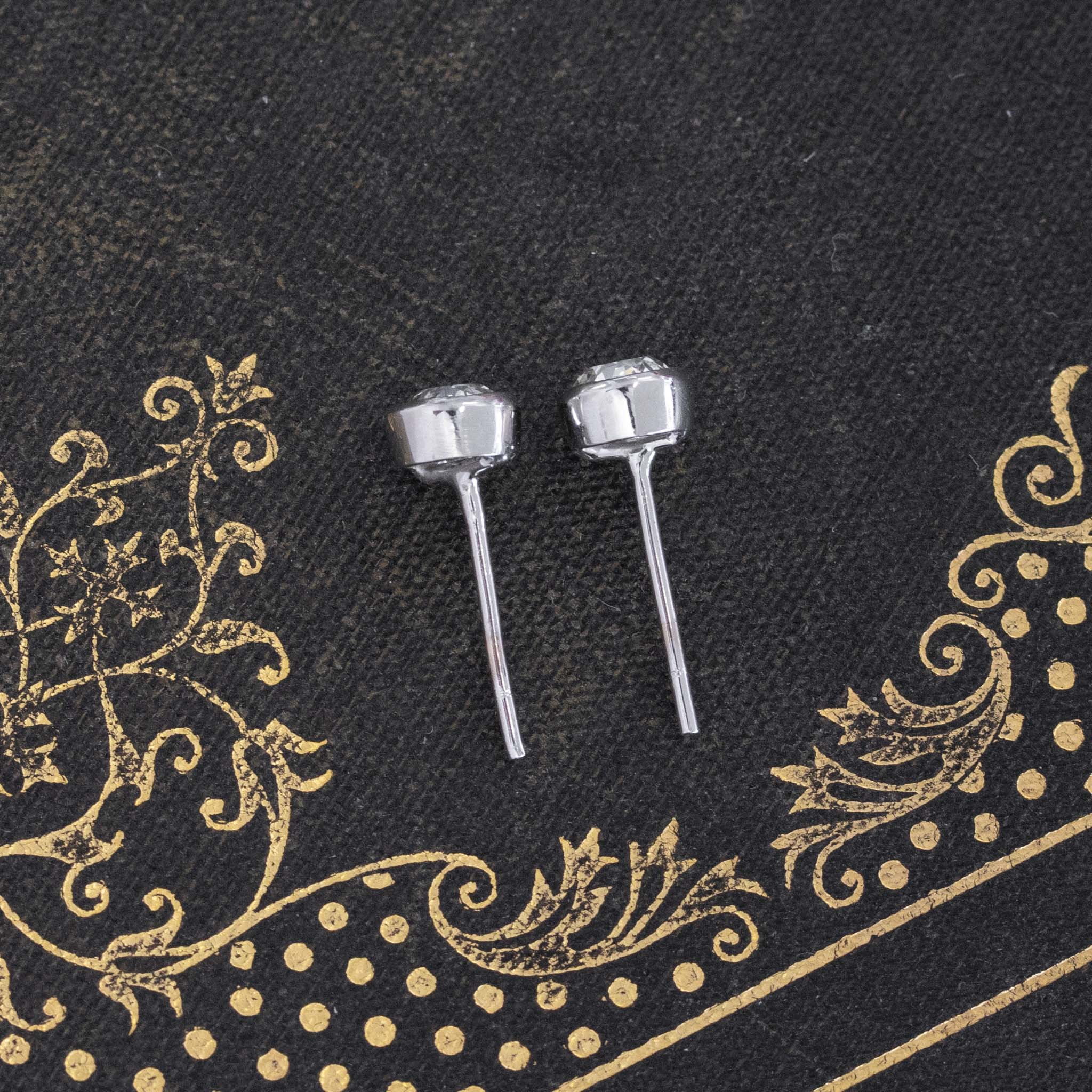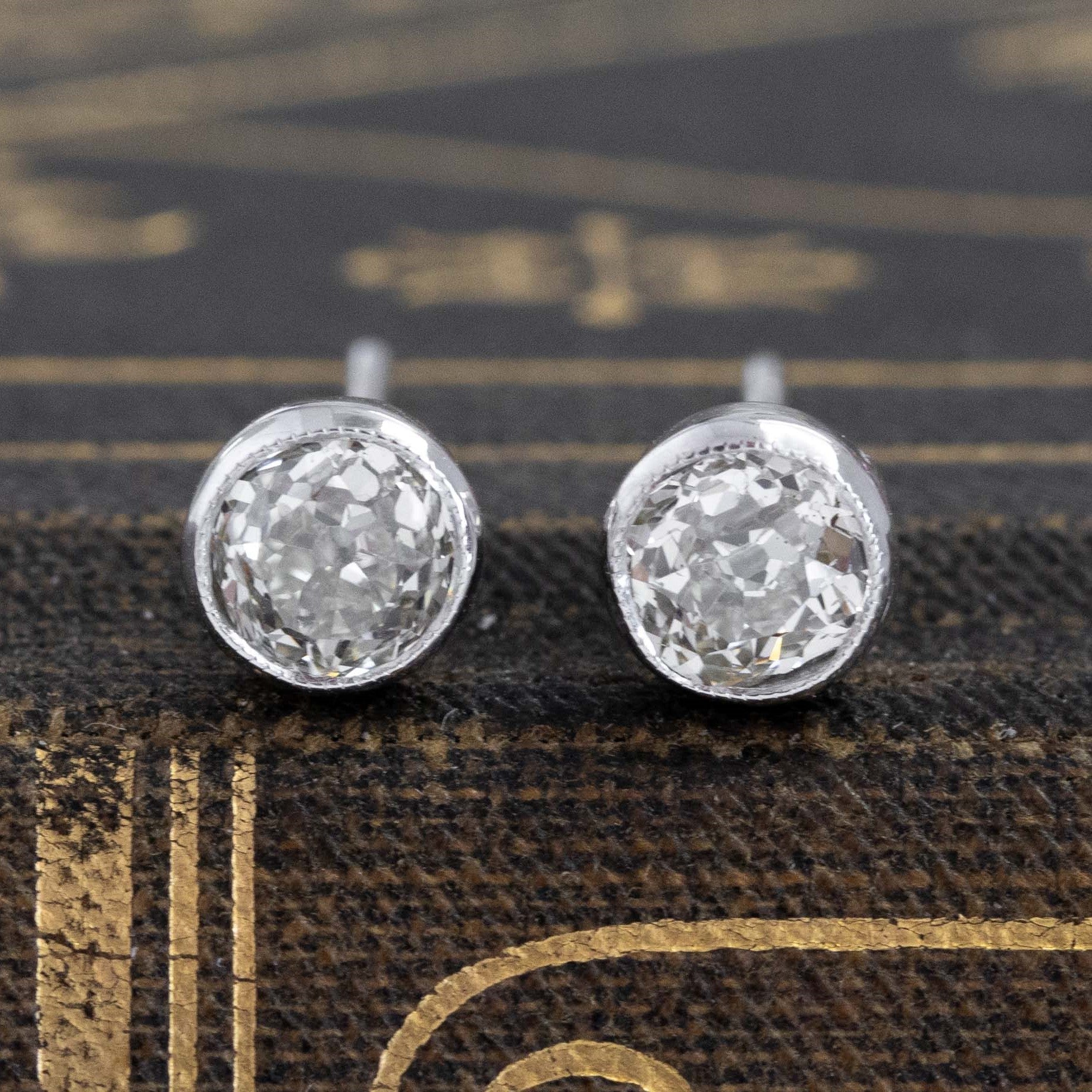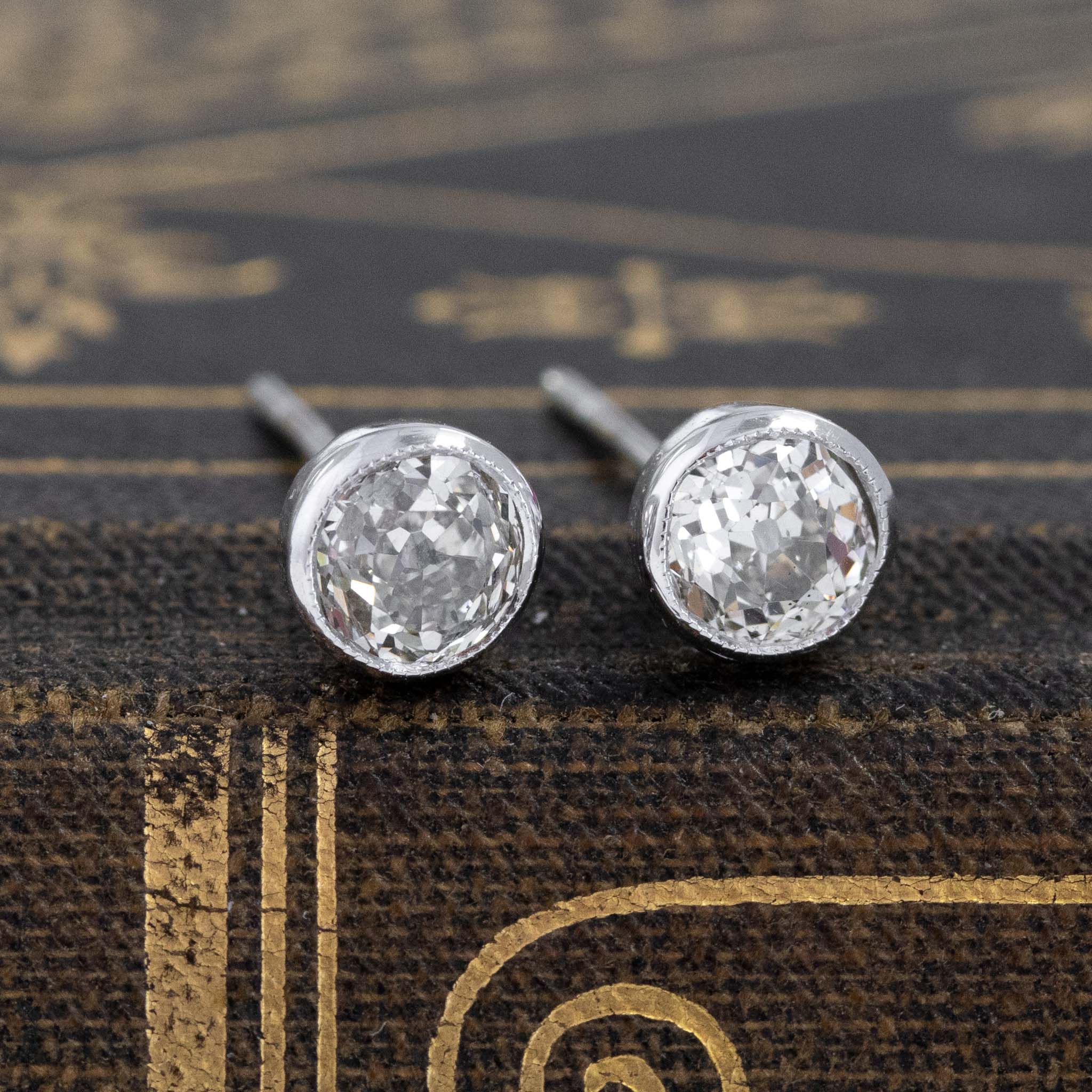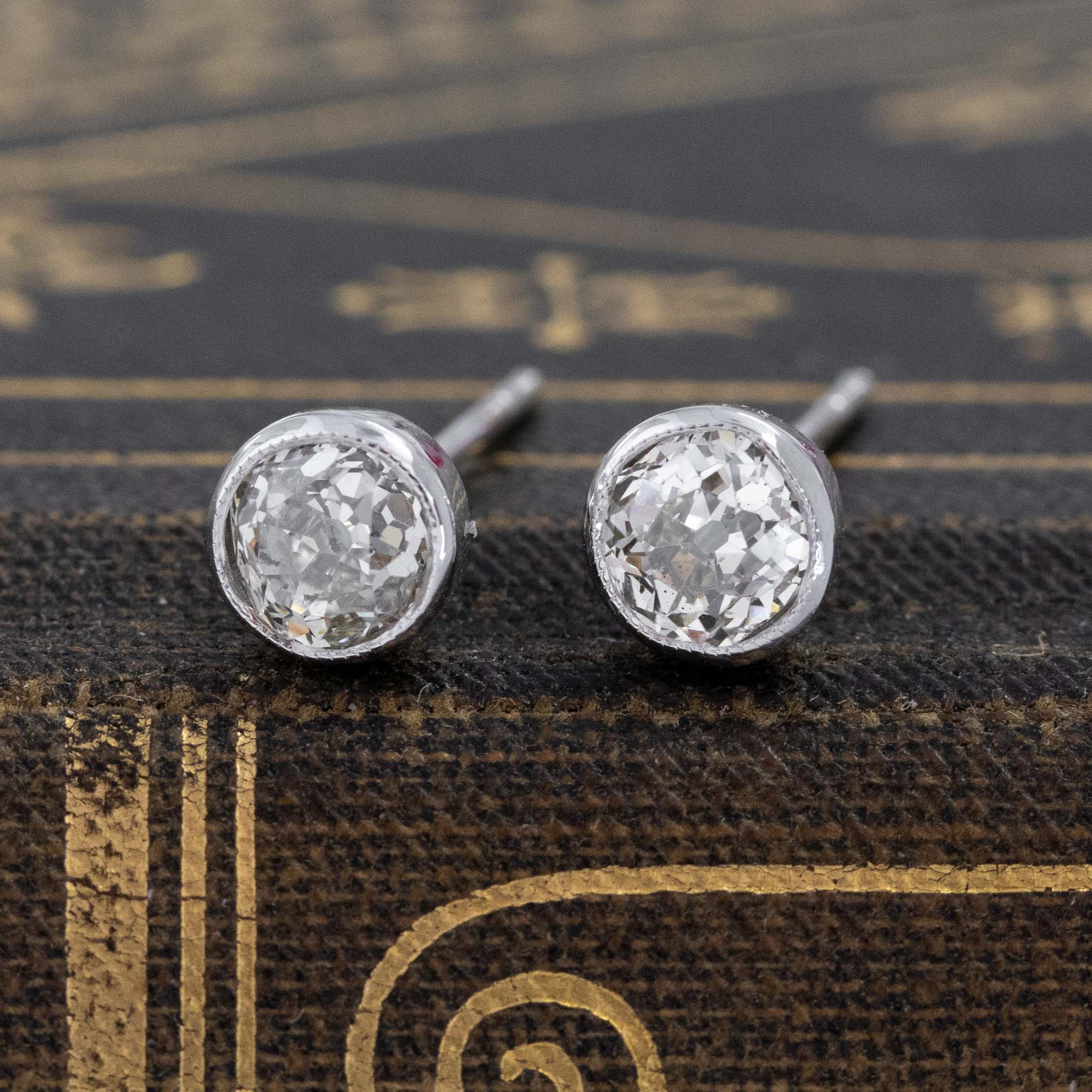 Bezel studs saved from an antique brooch! Kept in their original white gold bezels with milgrain detail lining the inner walls of the bezel. Round diamond studs are an absolute classic piece of jewelry to have in one’s collection - these are perfect for daily wear, and have so much sparkle and fire to them!