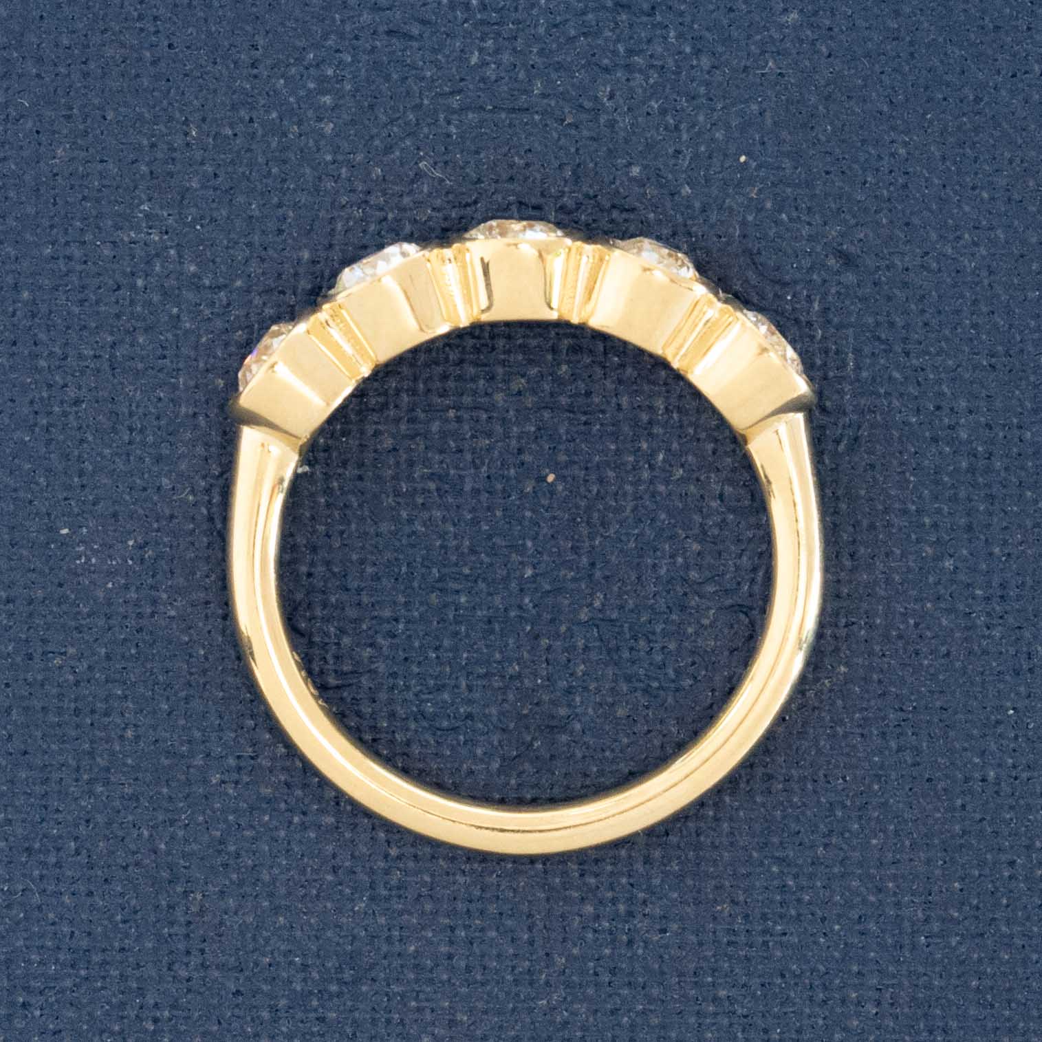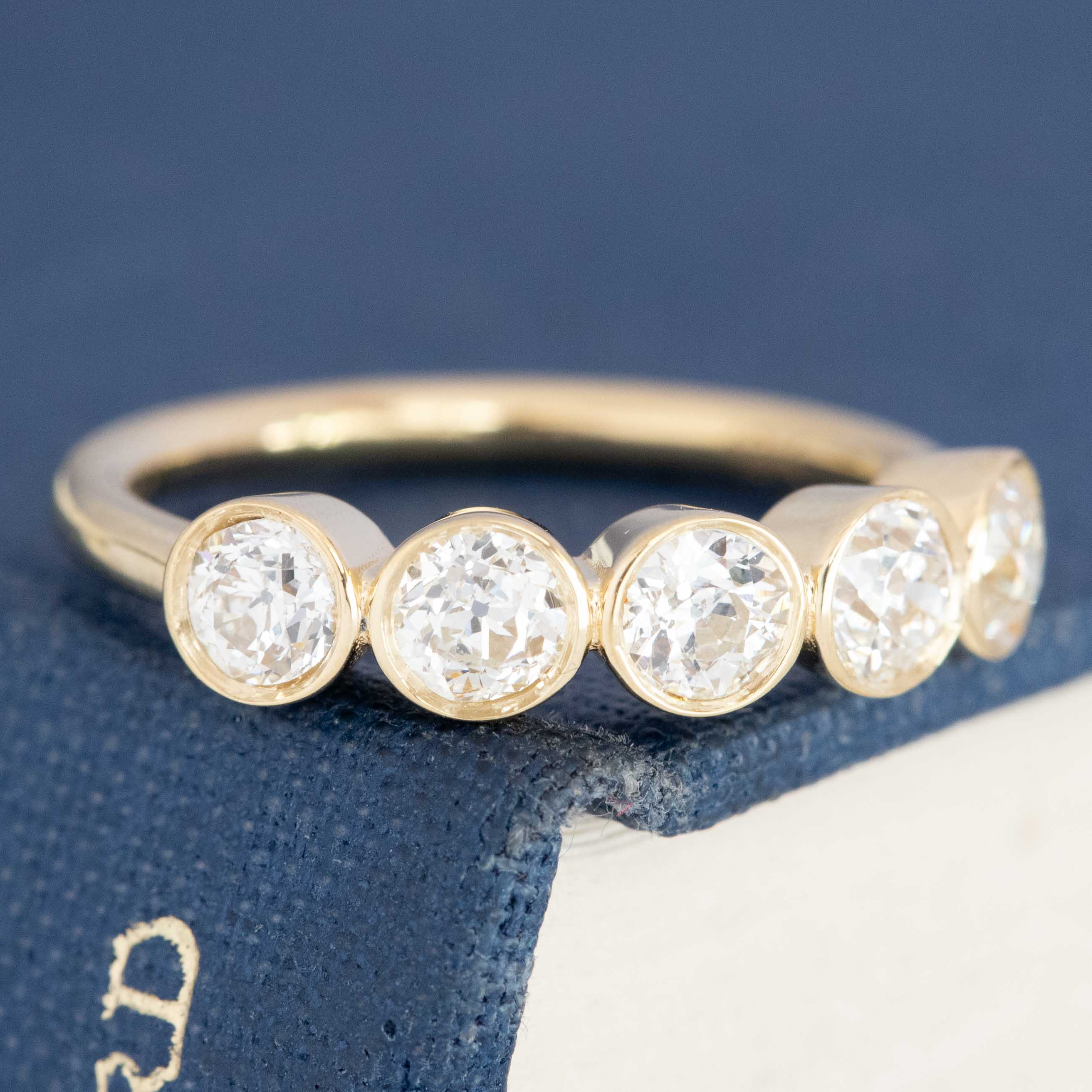 Using our meticulously matched upcycled Old European cut diamonds, we put together this suite of 5 beautifully matched OECs to create this bezel band. Low set on the finger and packing a big visual punch, the band will stack beautifully with other bands, and/or rings.