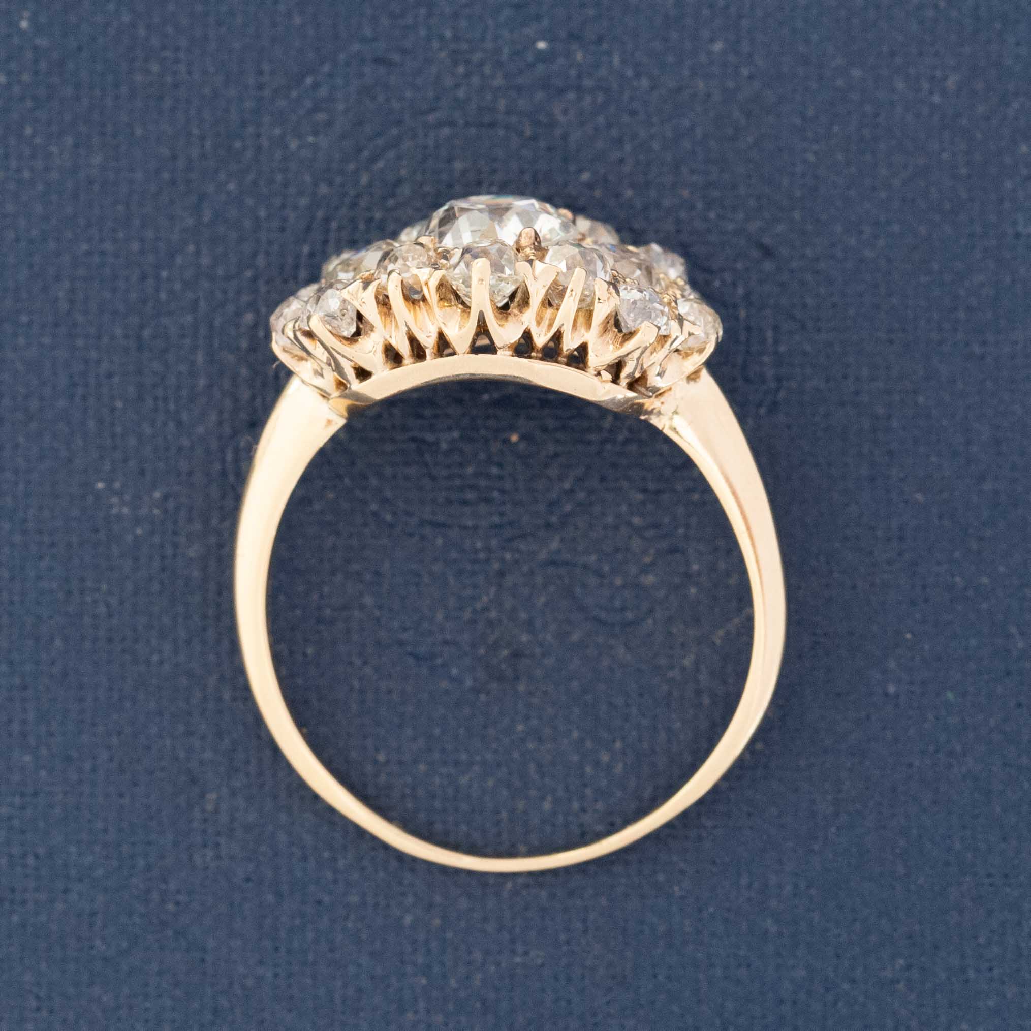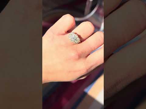 Incredibly sparkly and bright cluster ring with a white, sparkly old mine-cut diamond center! I adore the East-West layout, spanning across the finger beautifully, offering generous finger coverage. And it's not very often that we find cluster rings in all yellow gold either!