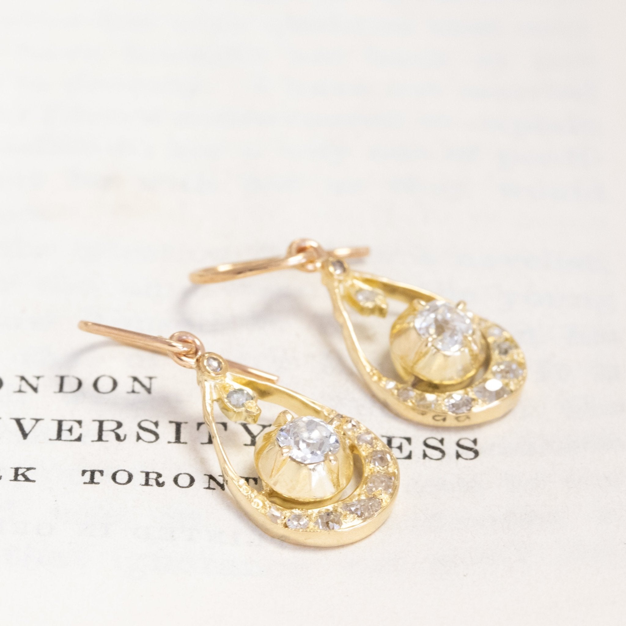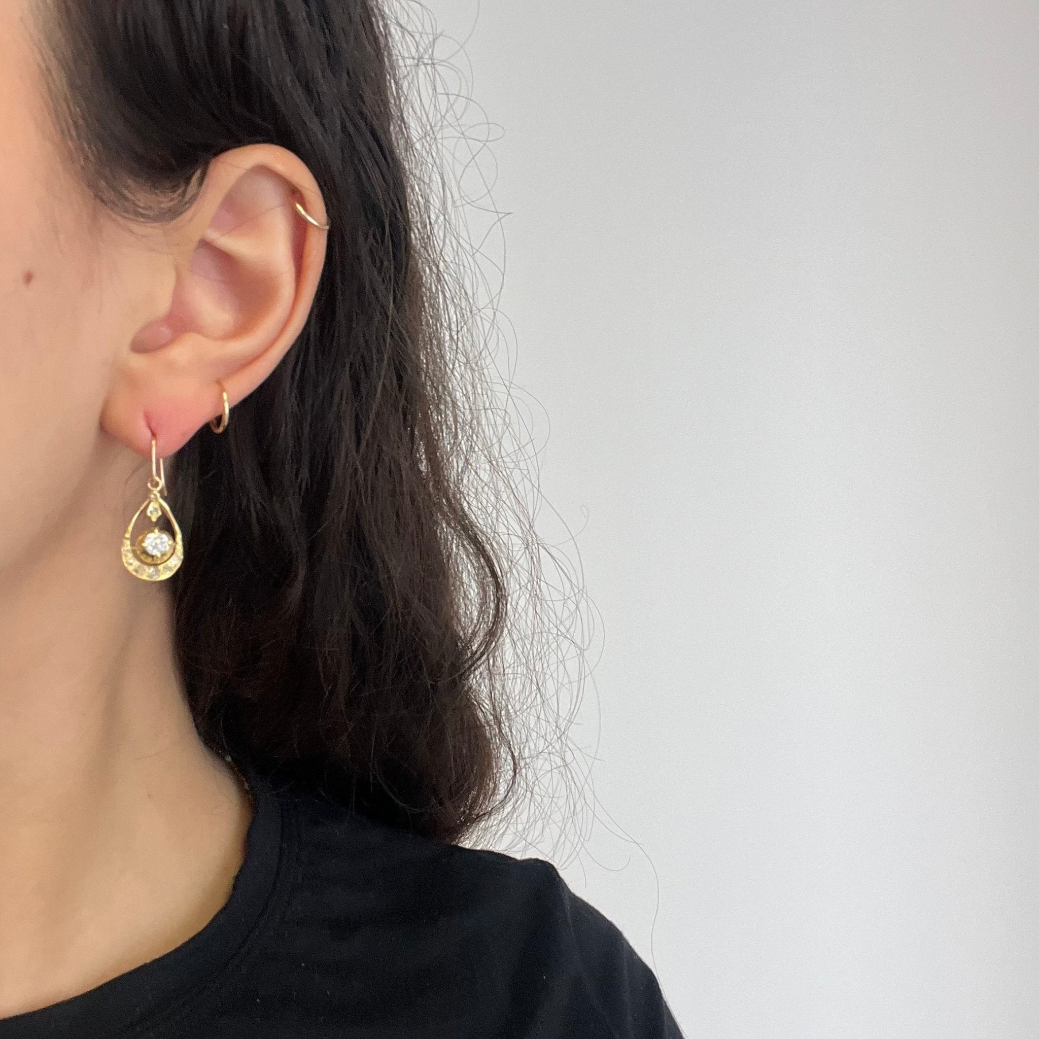 We made these diamond drop earrings using antique components from a broken brooch - the result is a pair that is elegant, unique, and sparkly beyond belief! Each earrings has a dramatic and airy tear-shaped component with chunky old cut diamonds along the bottom. In the center are more antique old mine cut diamonds sitting in their original collet settings, moving with the prettiest sparkle and shine.