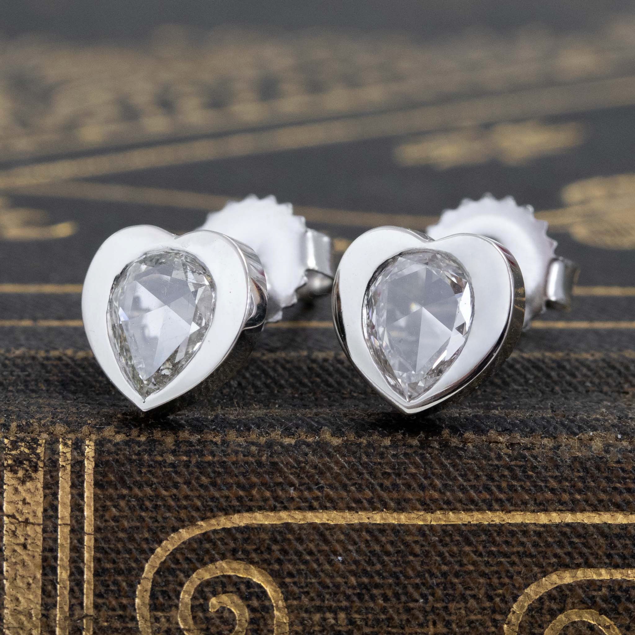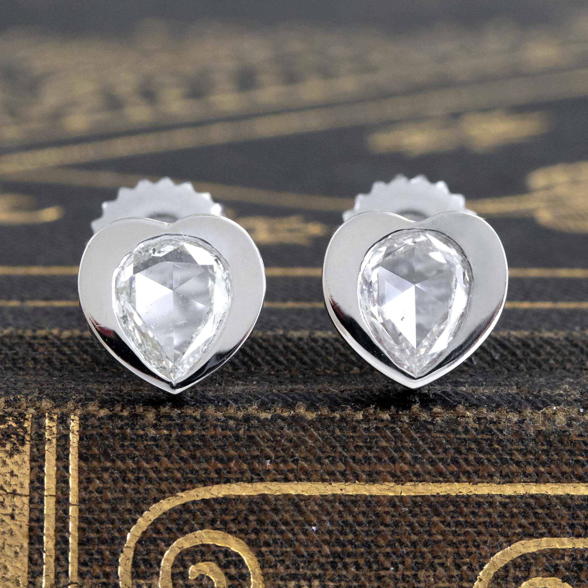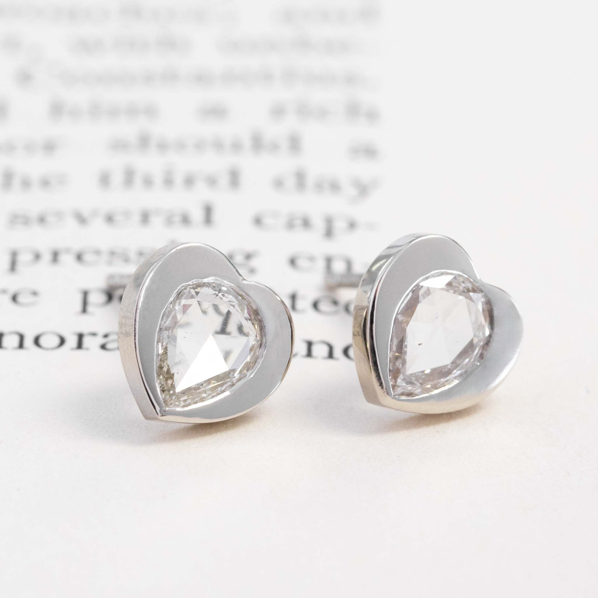 A current obsession around here - pear shaped diamonds in heart motif settings! We took a pair of matched rose cut pears and set them in these heart shaped frames and we just love how they turned out! Low set on the lobes, they shimmer beautifully with every movement.