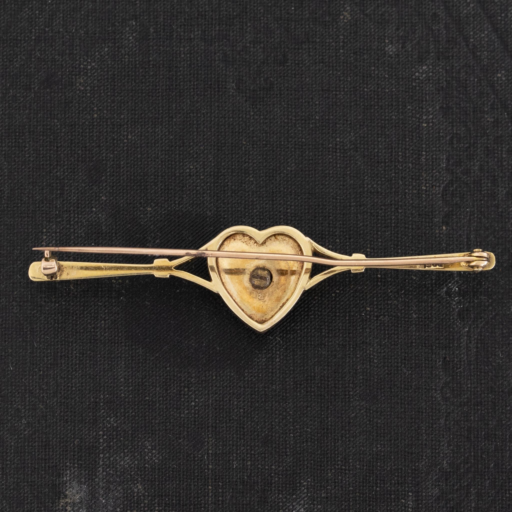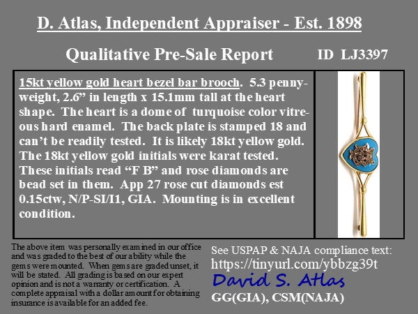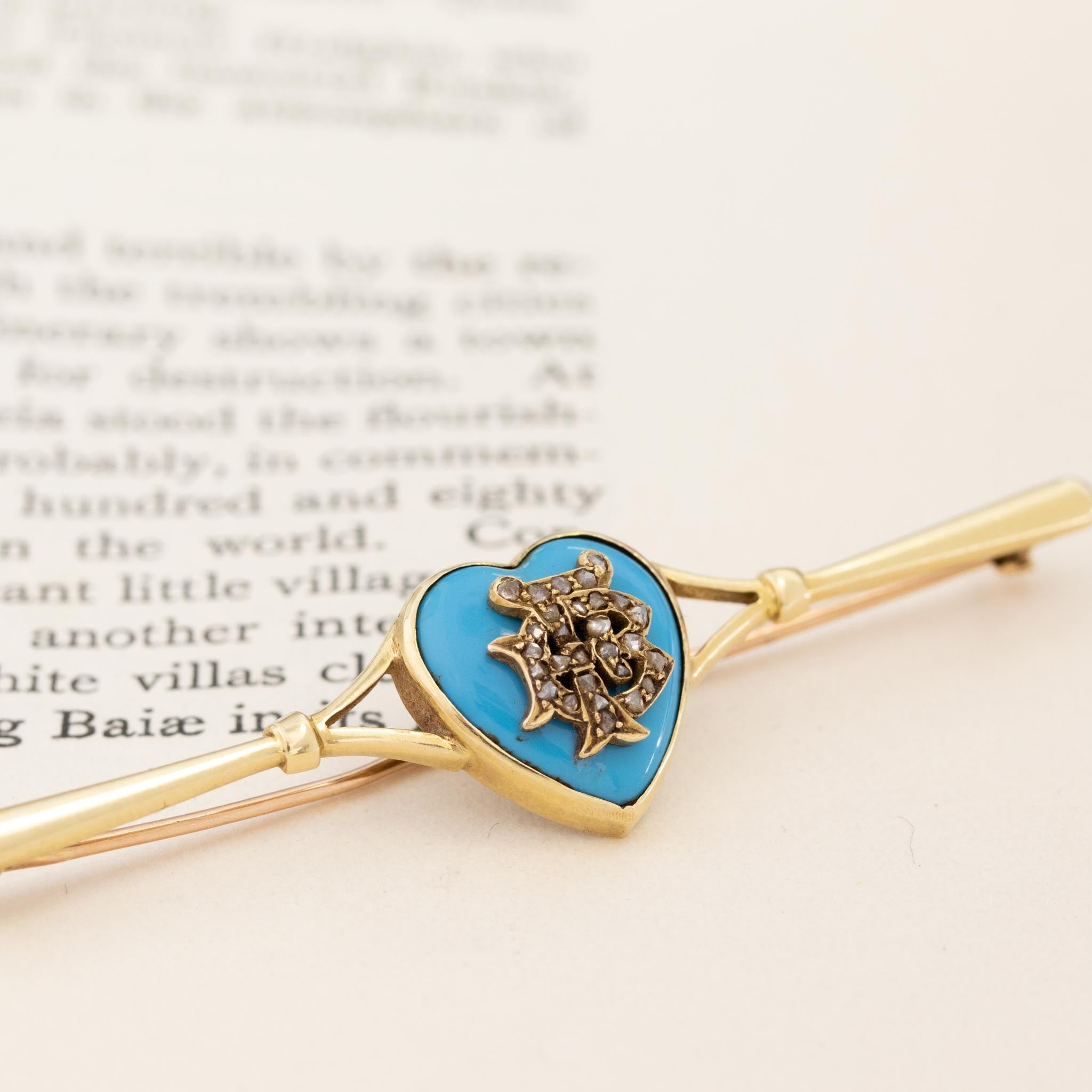 The sweetest bar brooch t with a puffed gold heart, covered in blue enamel with rose cut-studded initials that read “F B.” We found this pin to be incredibly charming, and we could also convert it into a pendant for a more wearable look!