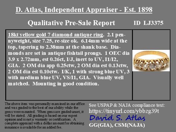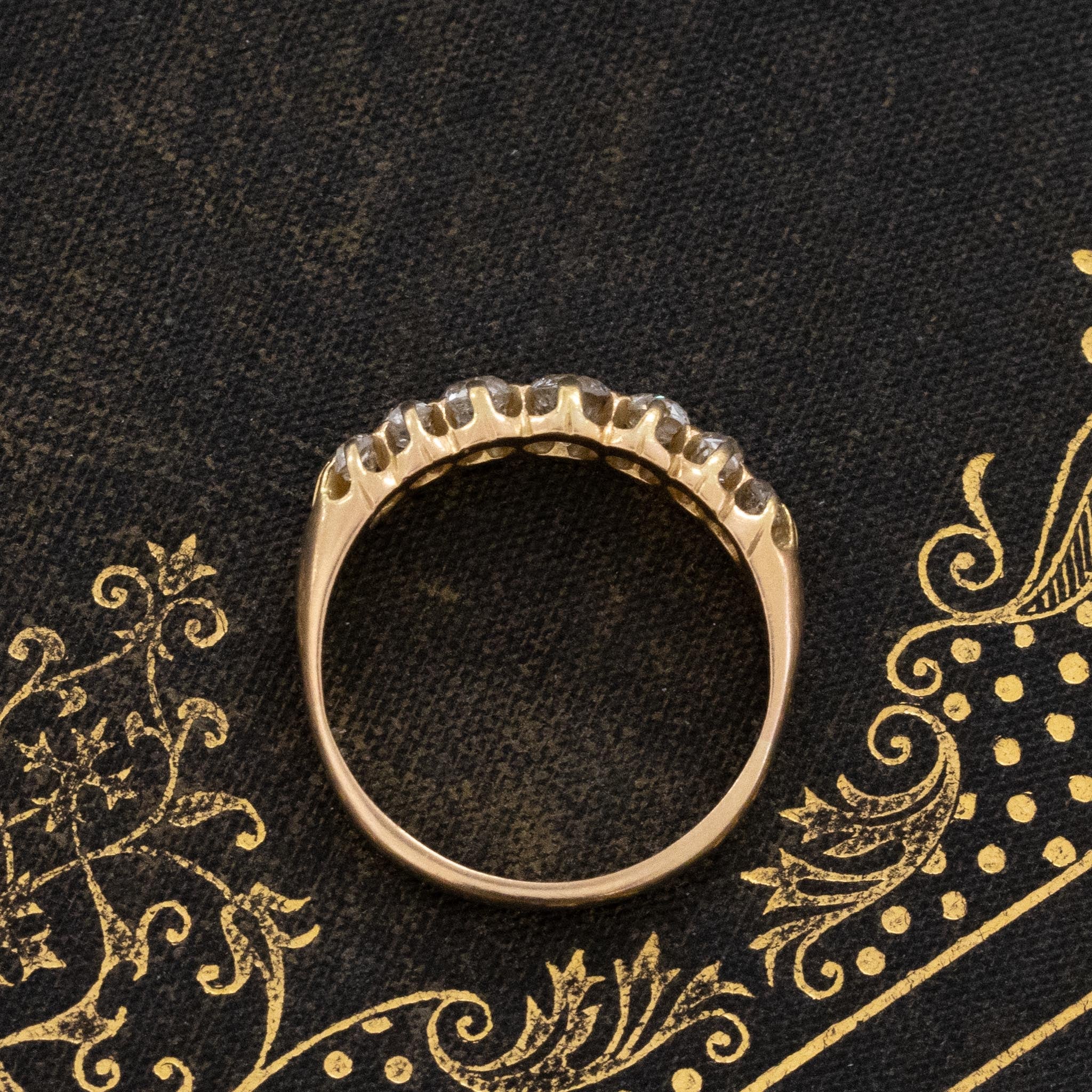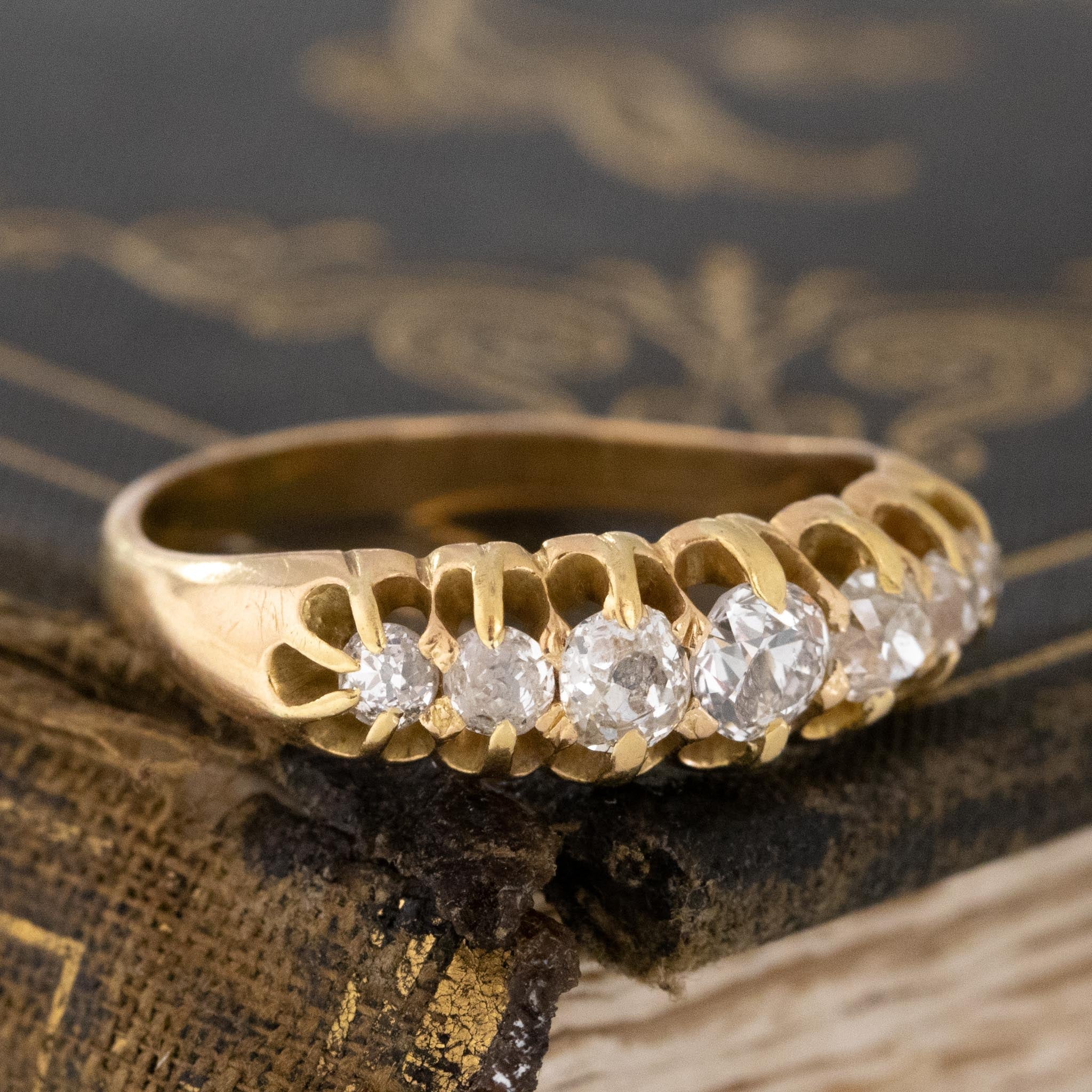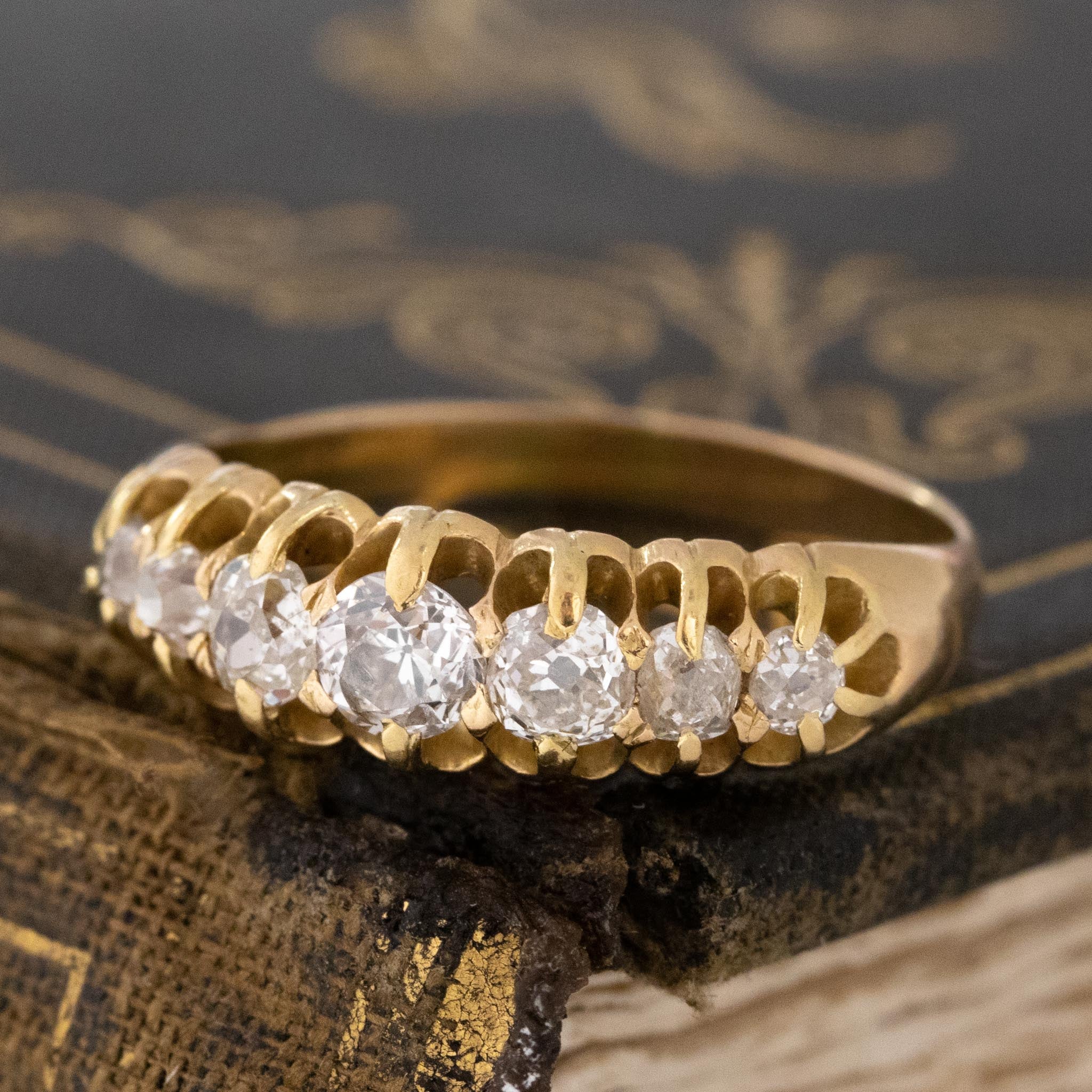 A beautiful and classic antique gold half-hoop band with mixed old cuts, all graduated in size in warm yellow gold. Bands such as these are what inspired our in-house line of half hoop bands, so we’re always excited to be able to offer the OG’s too! Those swoopy prongs, prismatic diamond fire, and low-set stones make it the perfect daily jewel. And with antique English hallmarks? A dream!