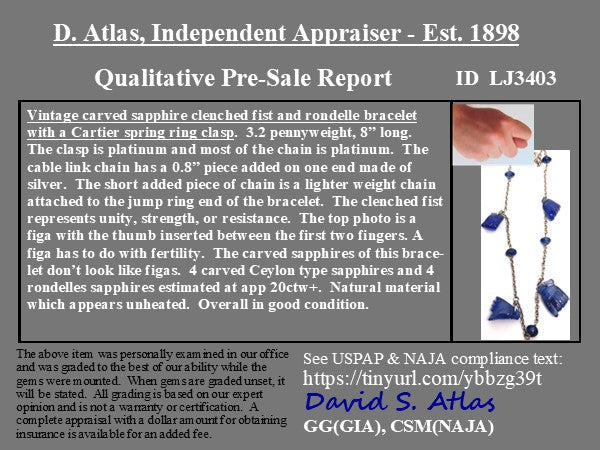 One of our most unique and rare Cartier finds! A charm bracelet with blue sapphire beads and a trio of carved sapphire figa charms.