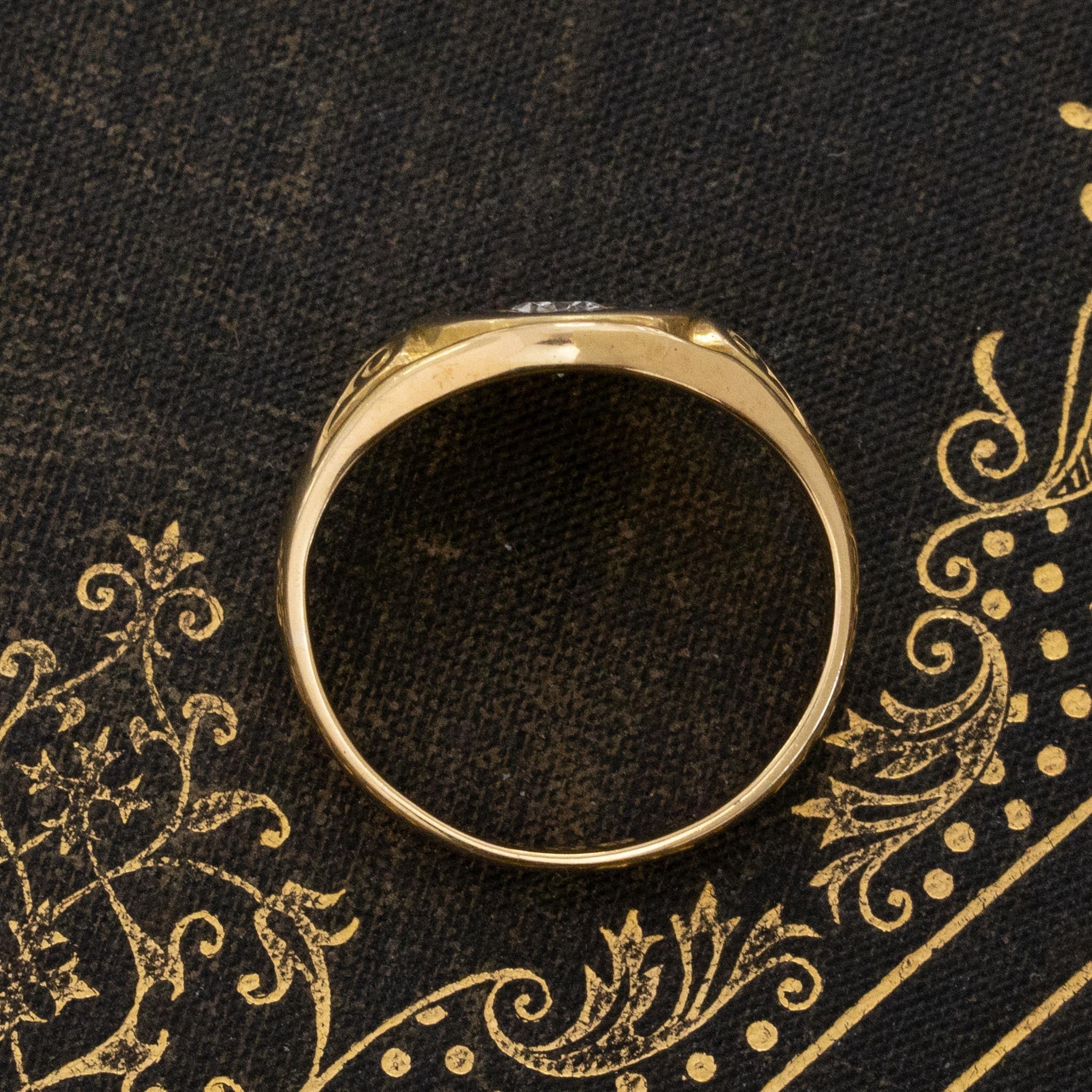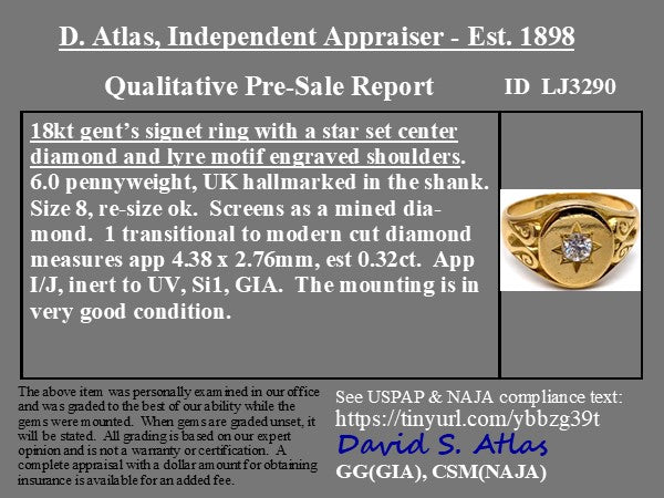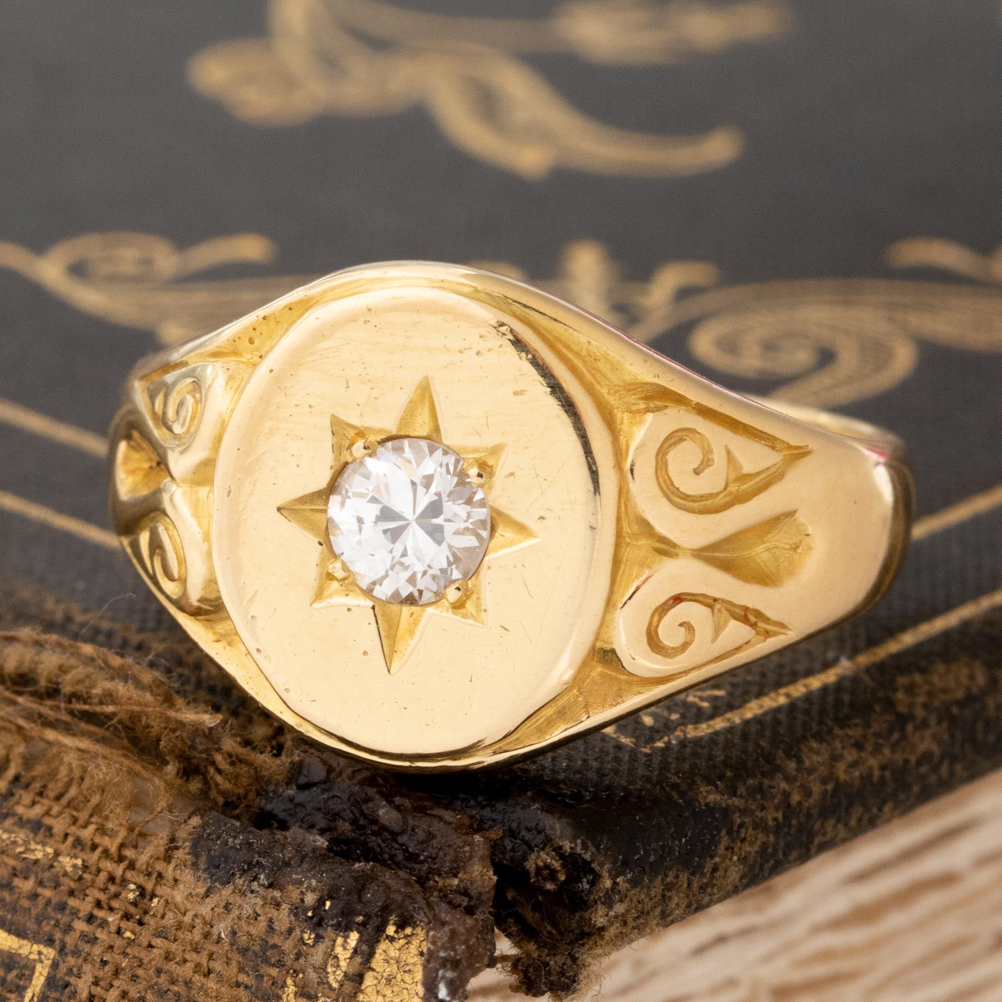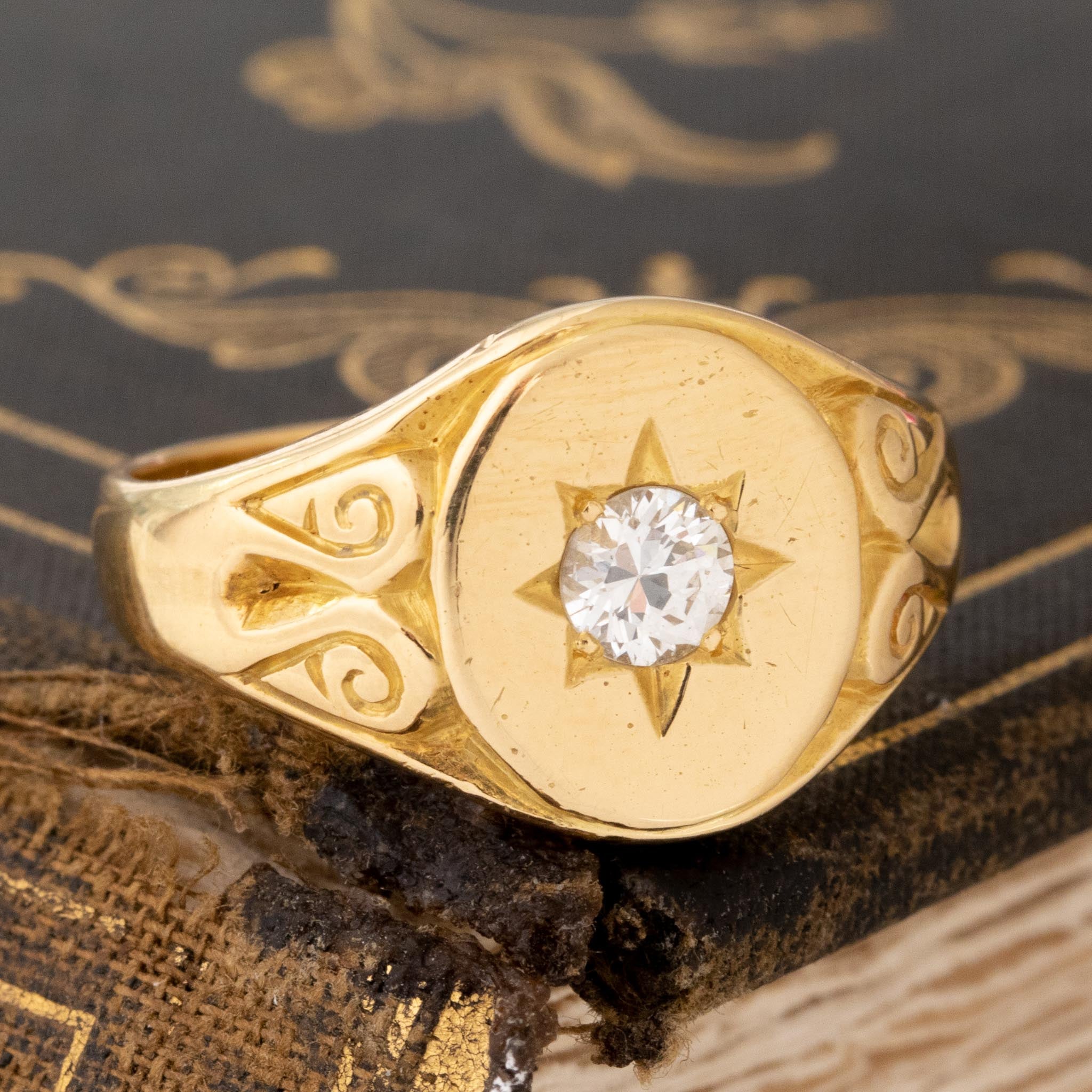 A signet ring, but add an antique diamond in the center for a little pizzazz! Gorgeous lyre motif on the shoulders, with the diamond set in a starburst pattern.