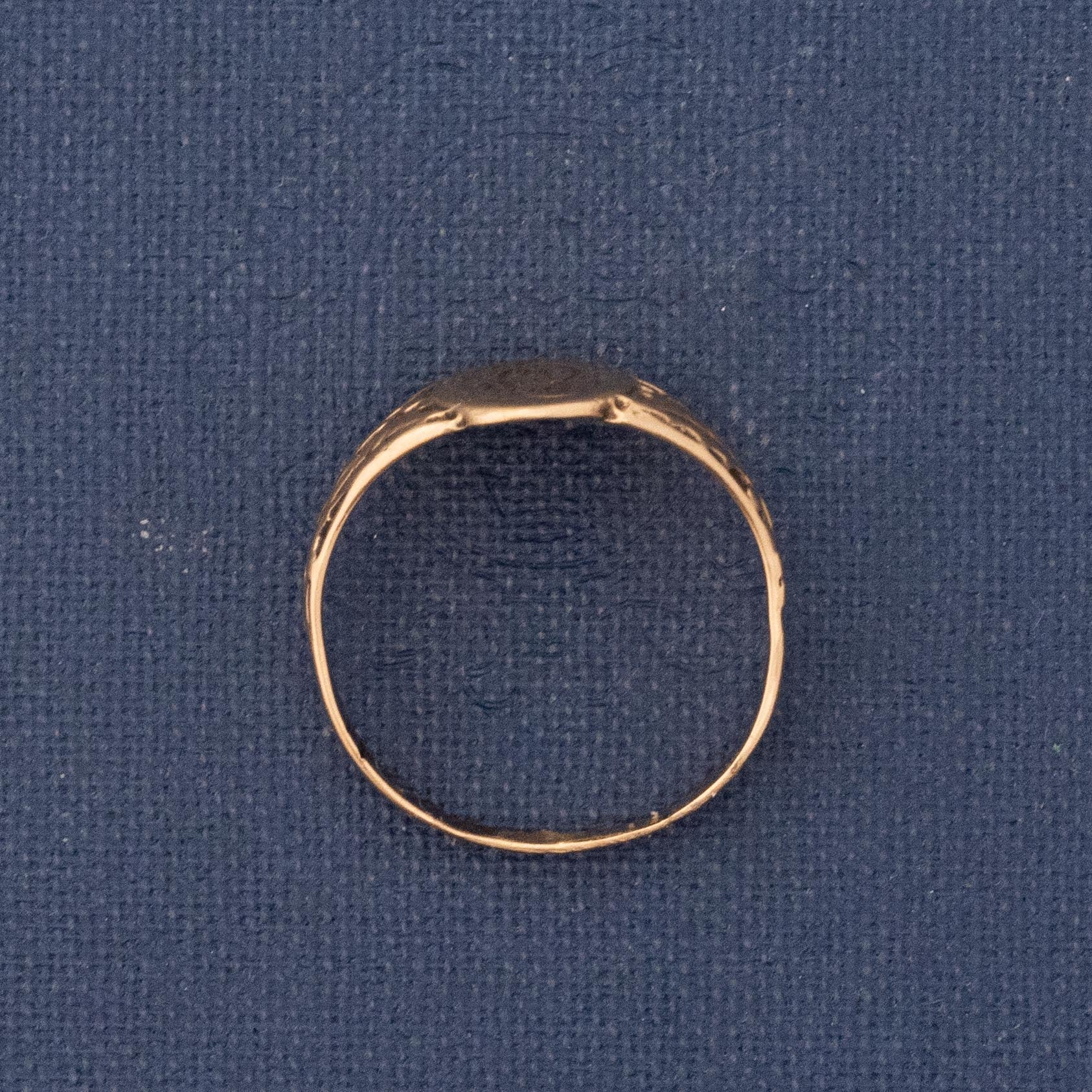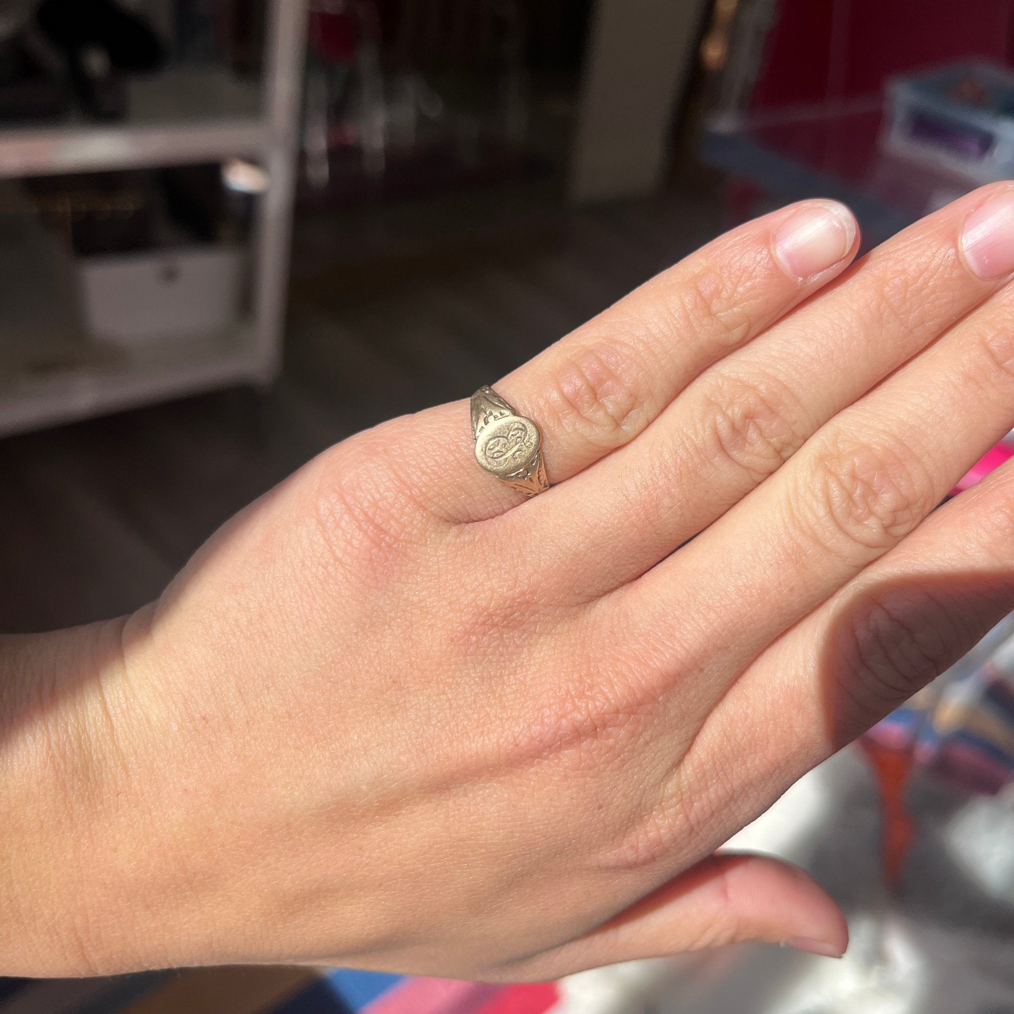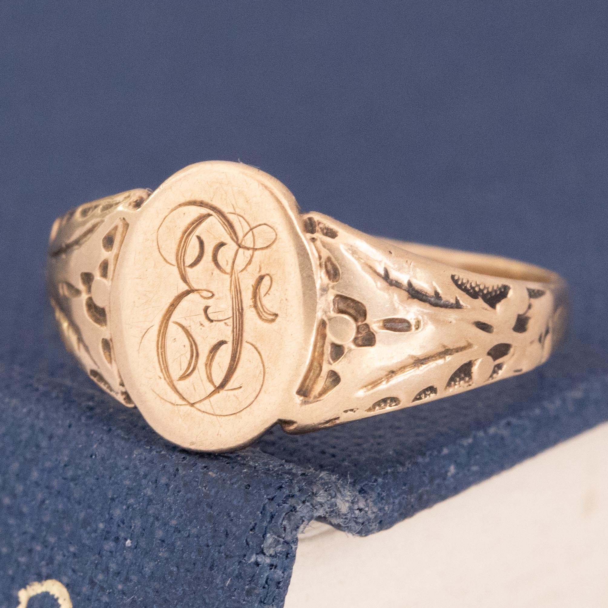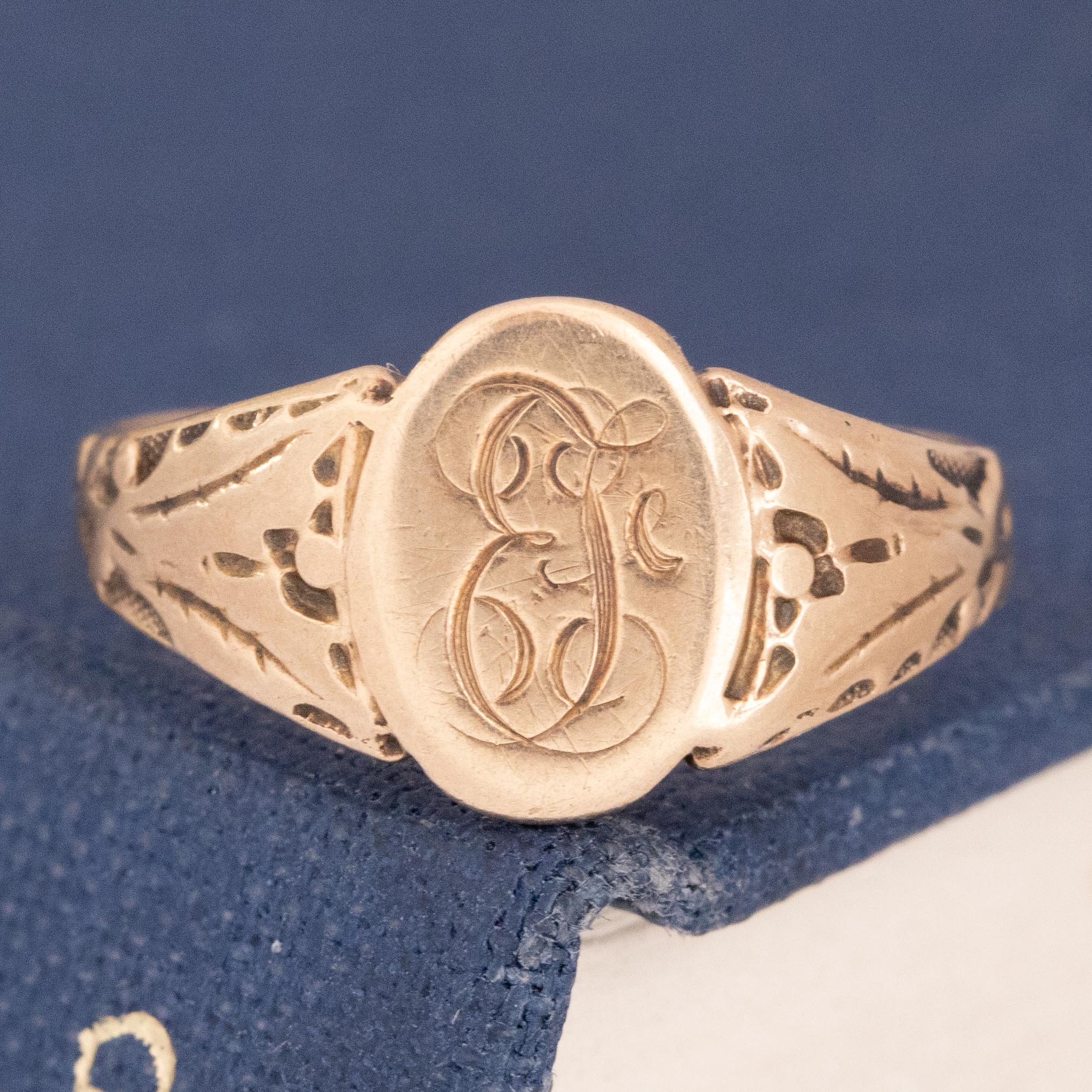 A sweet antique baby signet ring with engraved details along the shoulders and face - buttery and worn in in the best way. The front is engraved with initials. which we believe to read "EJ."