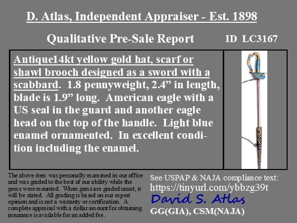 We love almost every vintage sword and scabbard we come across - this one is no exception! With a sweet, light blue enamel bangle and an engraved scabbard with delicious detail and patina, we believe this baby used to adorn hats and lapels in the most regal way. American eagle with US seal in the guard! We’d love to see it worn in the same fashion, or perhaps hanging as a pendant with a chain strung through the handle. A versatile and beautiful piece of jewelry to add to one’s collection!