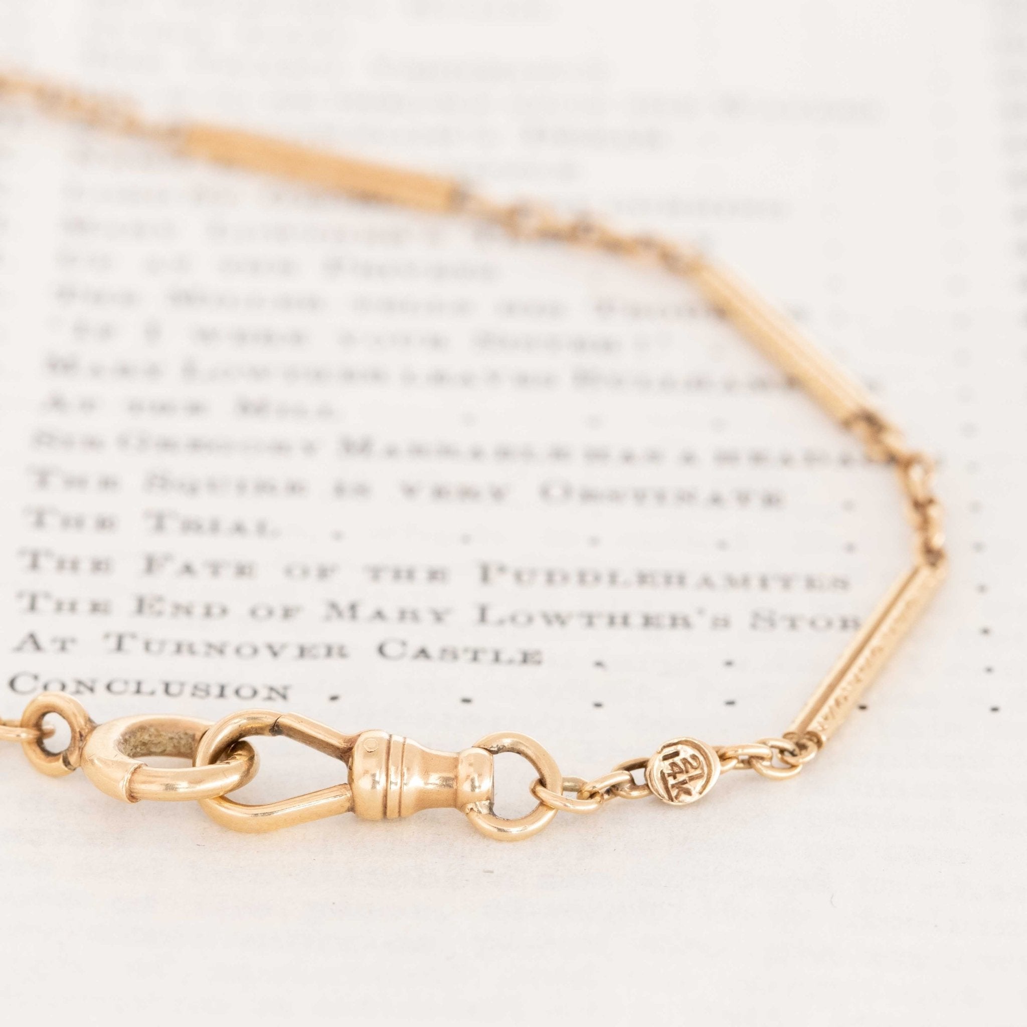 A charming antique watch chain made with engraved bars alternating with cable links, delicate and oh so sweet! Coming in at 14”, she is either choker length for a more petite neck or an extension component to combine with and lengthen another antique watch chain in your collection. I love the engravings on the bar components, they add a nice bit of detail that feels undeniably antique.
