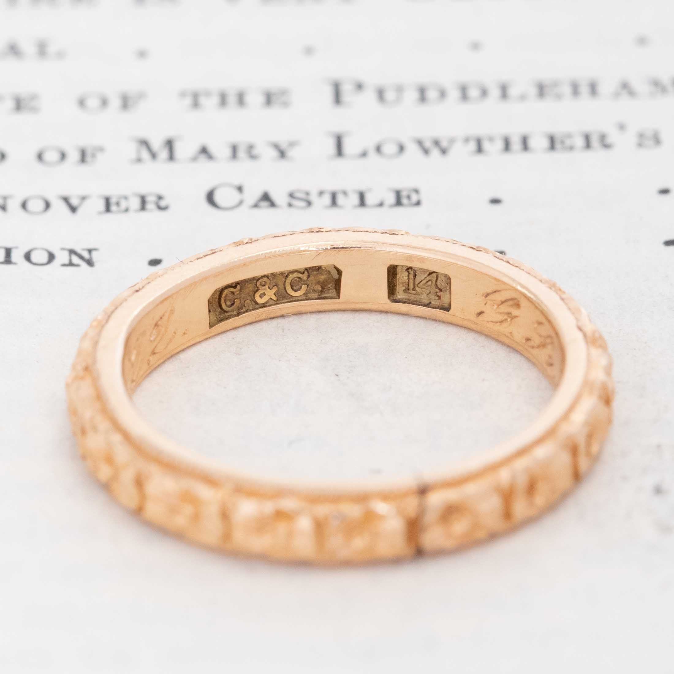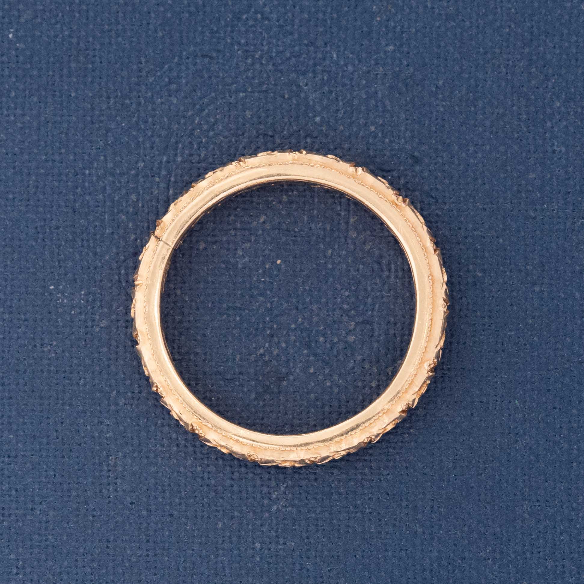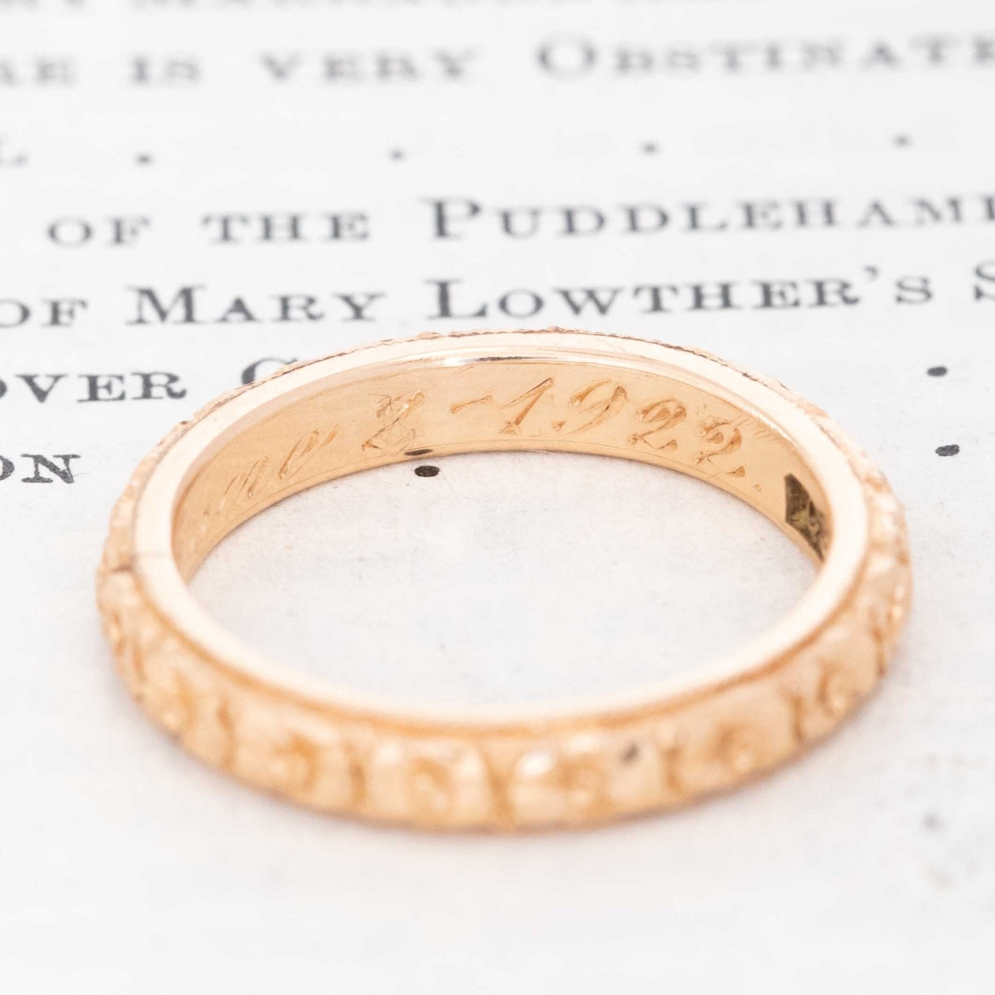 A simple antique gold band with a charming die struck floral etched pattern throughout. The pattern in unbelievably crisp and clean too. The best part is the original engraving date of 1922 (we SWOON).