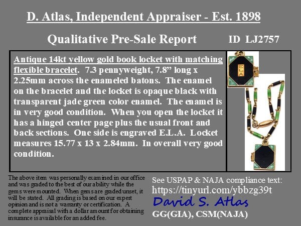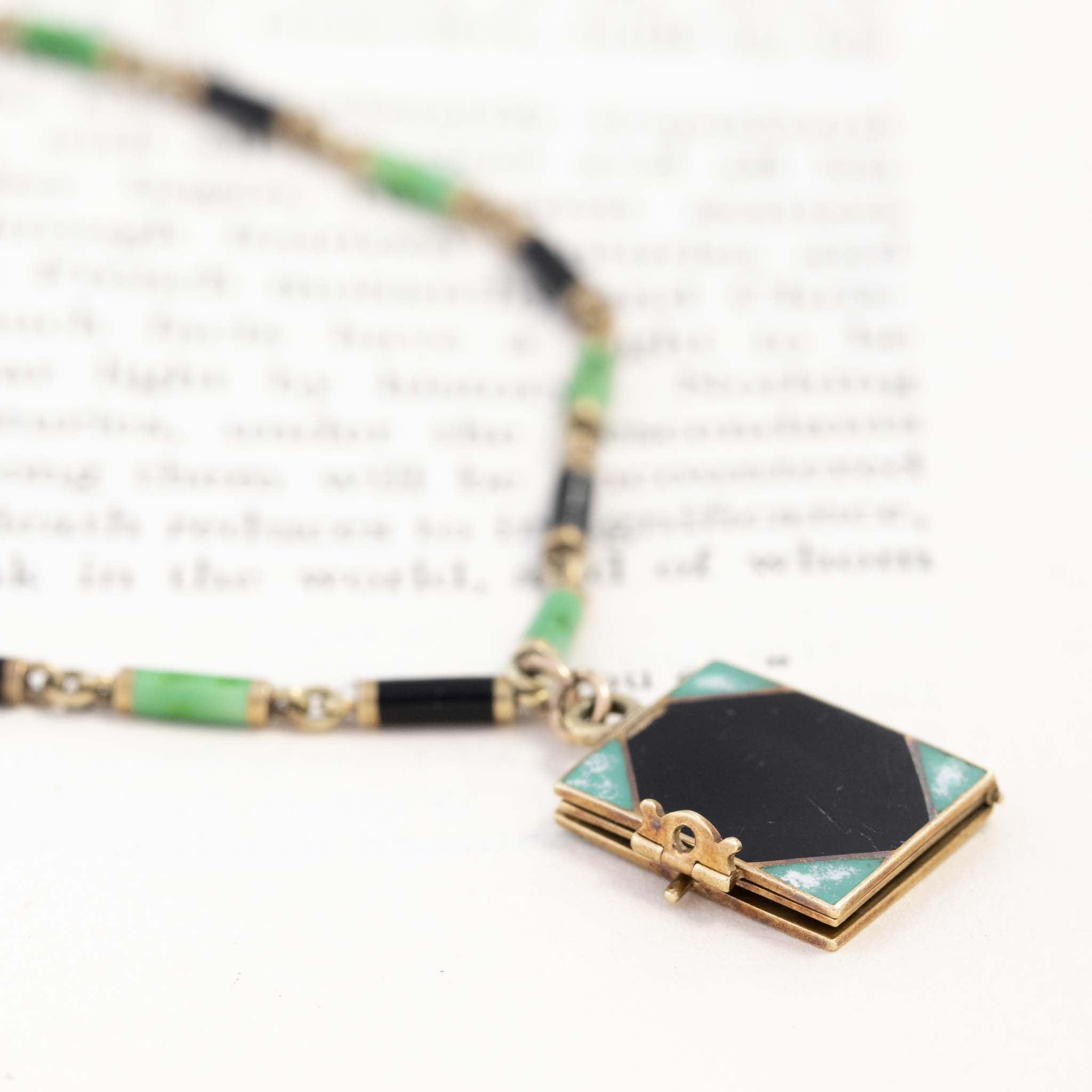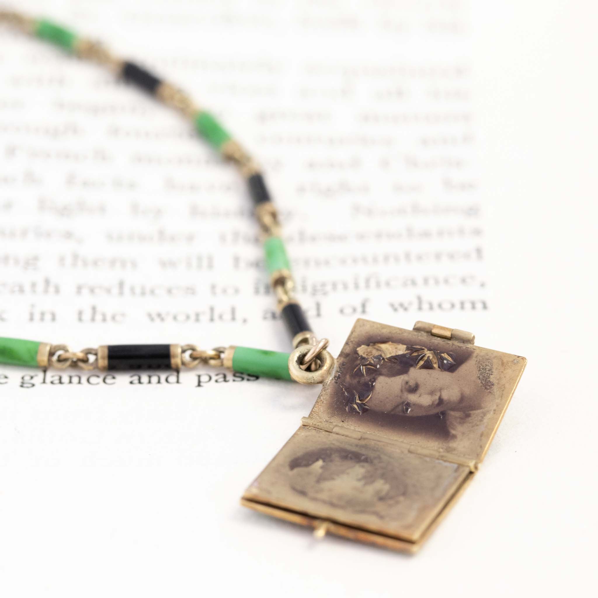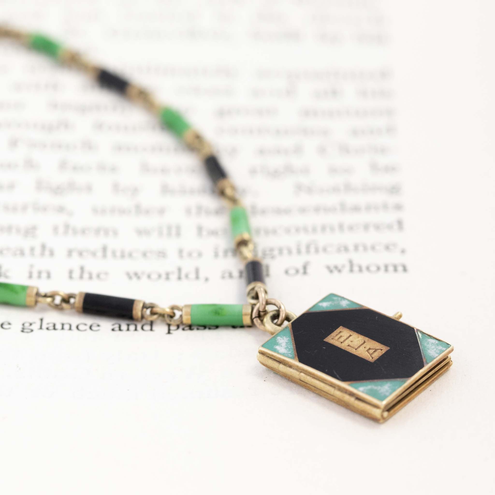 This antique book locket bracelet is definitely one of the more unique pieces we’ve come across lately - Both the links and the locket itself are covered in the most gorgeous black and jade-colored enamel, which looks stunning along with the antique gold-tone. The locket itself has a center page with one side engraved “E.L.A.”, which can also be buffed and polished upon request (please leave us a note in your order, or send us an email!). The photos shown are via a very rare photo transfer process. Ready for you to add your own photos!