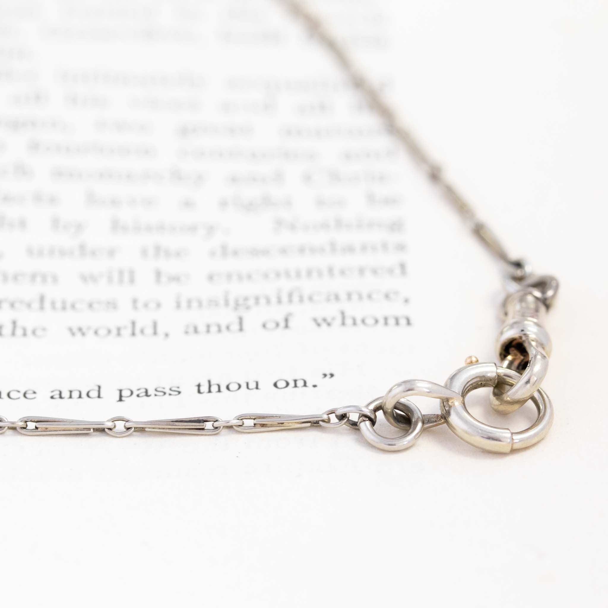 An antique needlepoint link chain in 18kt white gold - at a perfect choker length (14.7”!) and a time-honored patina that we absolutely adore. The links on this piece are long, leggy, and fall right on the décolletage. It is perfect for stacking with other chains at different lengths and would look great with a petite pendant or charm suspended from the front.