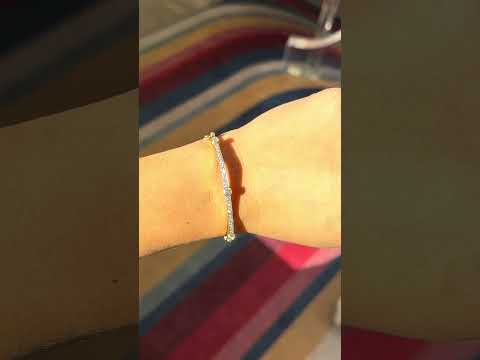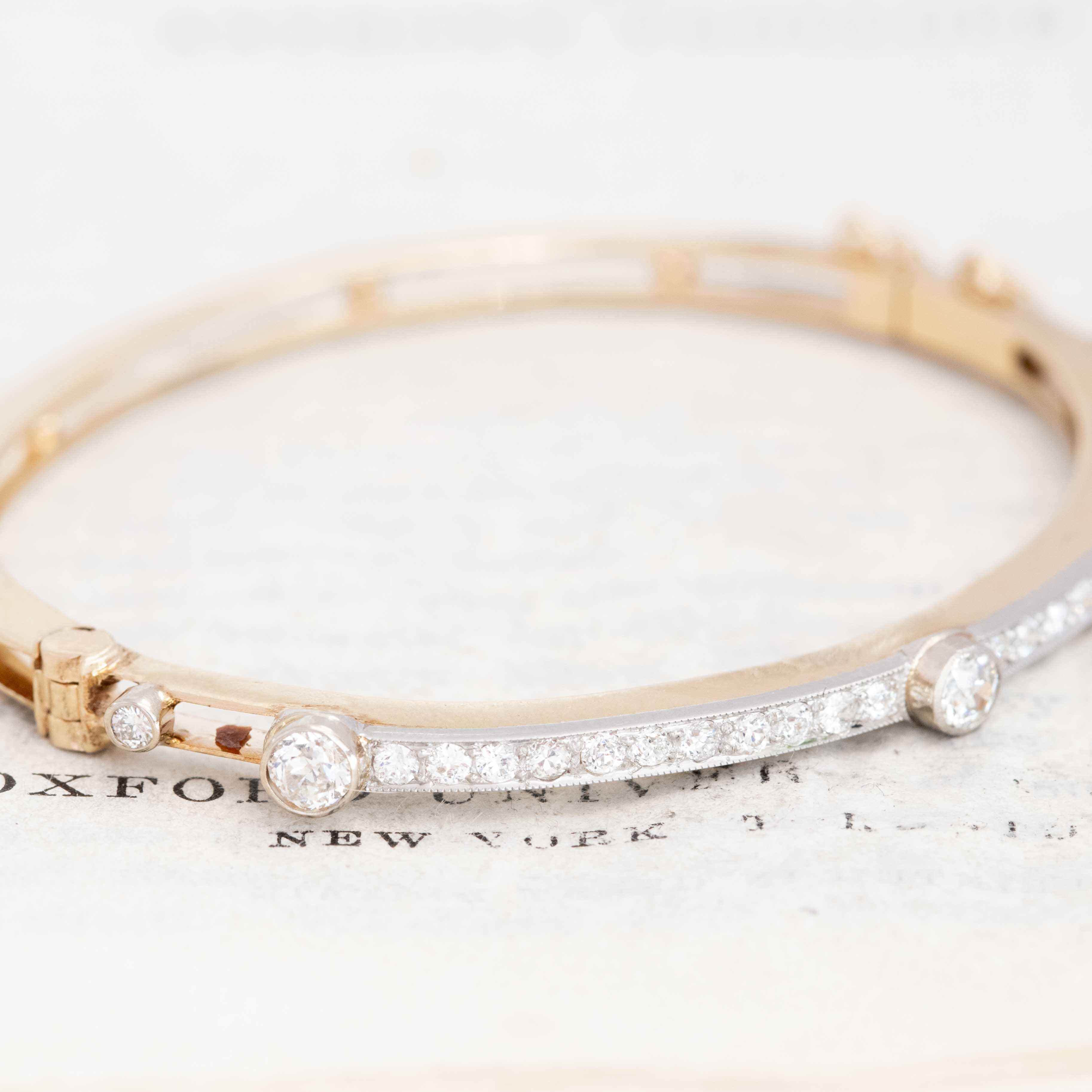 A late Victorian bangle, set with a row of chunky old European cut diamonds with a larger one in the center for a little sparkly accent. Made for a small wrist, the bracelet is a fun and rarer find for us - she is perfect on her own or stacked with other bracelets.