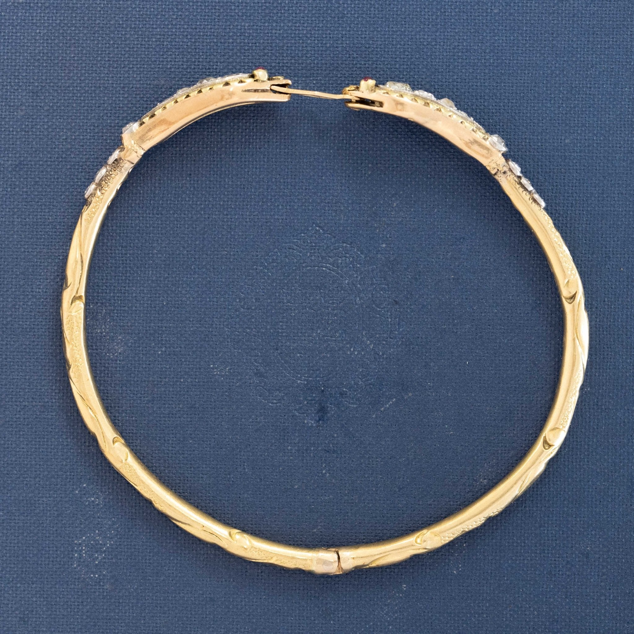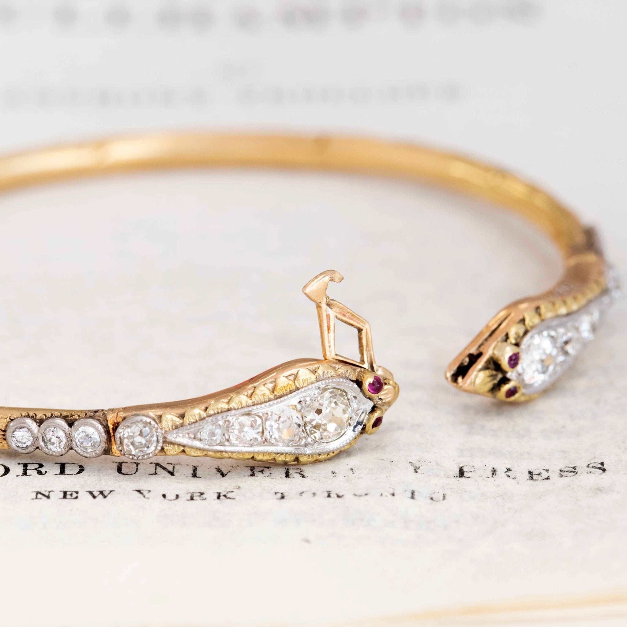 We've never met a serpent we did not like, but this baby really takes the cake (or should we say, THESE babies?). Two snakes with cabochon eyes and ol cut-studded heads join together, hinged at the bottom, and hooking together at the mouth with a kite-shaped latch mechanism. The bodies as you move down the bangle are engraved and detailed, but comfortable and buttery to wear. Incredible craftsmanship and old school detail from every angle. A pretty special piece!