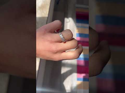 This band has beautiful gold details along the gallery, with graduated and rustic old mine cut diamonds which span the top of the finger. The stones are low-set, making the band incredibly comfortable and easy to wear daily.
