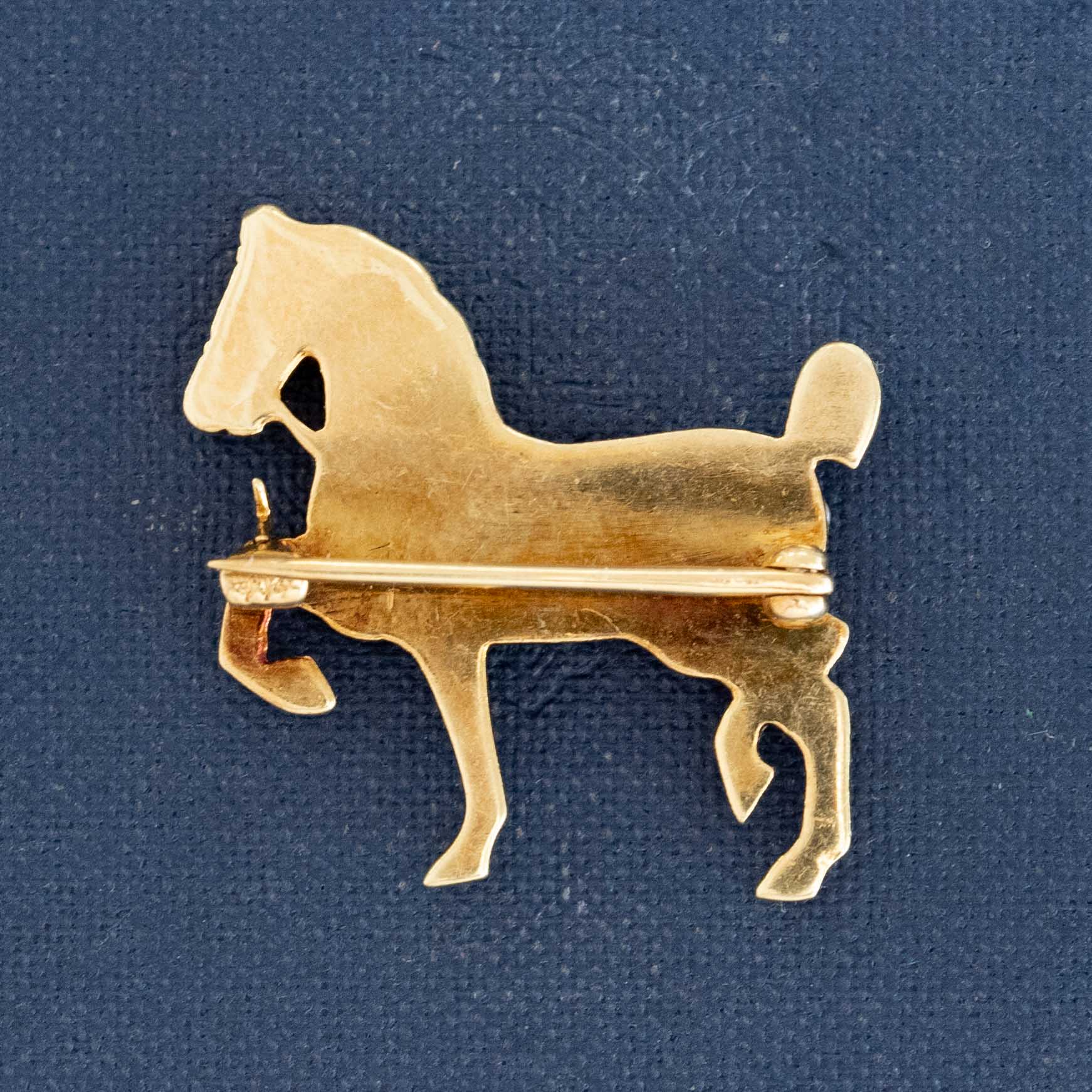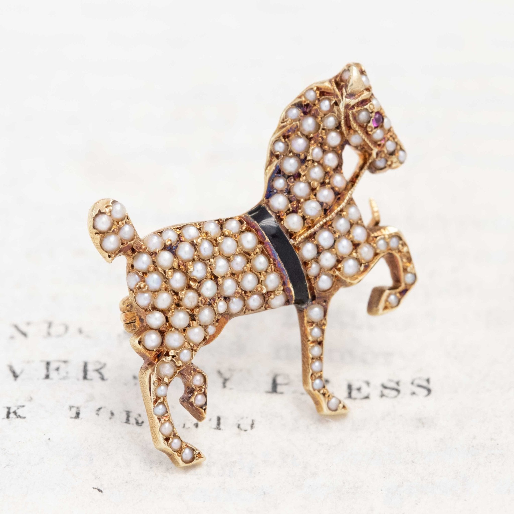 Here's a versatile piece that's a beautiful tribute to a majestic animal. A stallion in motion, adorned with a black enamel harness and sweet seed pearls, can be worn on your lapel, collar, or as a scarf pin. It's a perfect fit for any horse lover, offering multiple ways to showcase your passion!