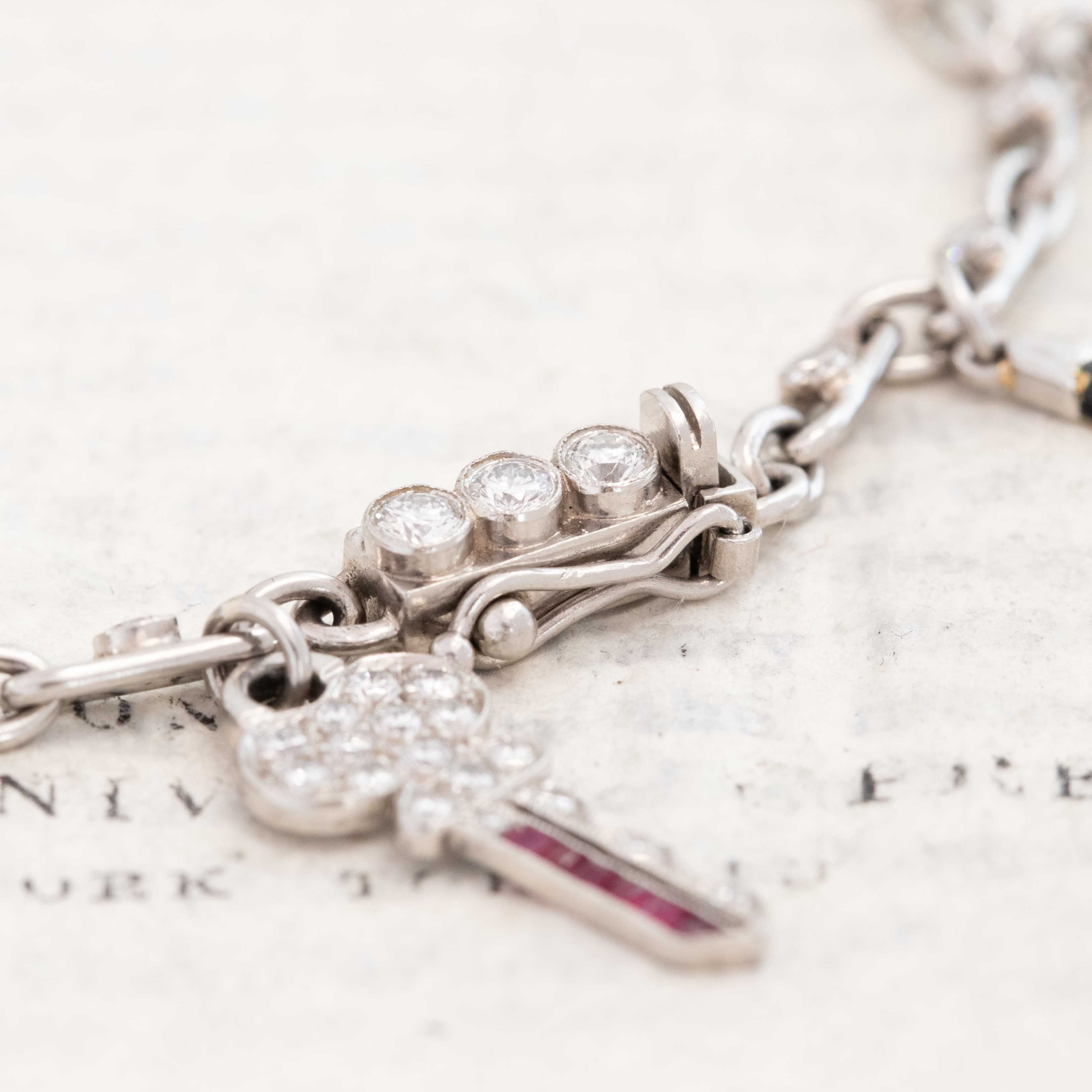 Quite possibly one of the prettiest  charm bracelets from the Art Deco era we have come across of late!  Thirteen intricately detailed charms hang from a platinum bracelet (sprinkled with diamonds too!), with diamond and enamel details.  Perfectly scaled and spaced apart - it's obvious that its previous owner and maker took the time and effort to produce a rare and highly collectible piece of jewelry.  She is beyond adorable!