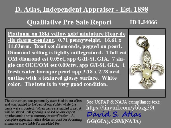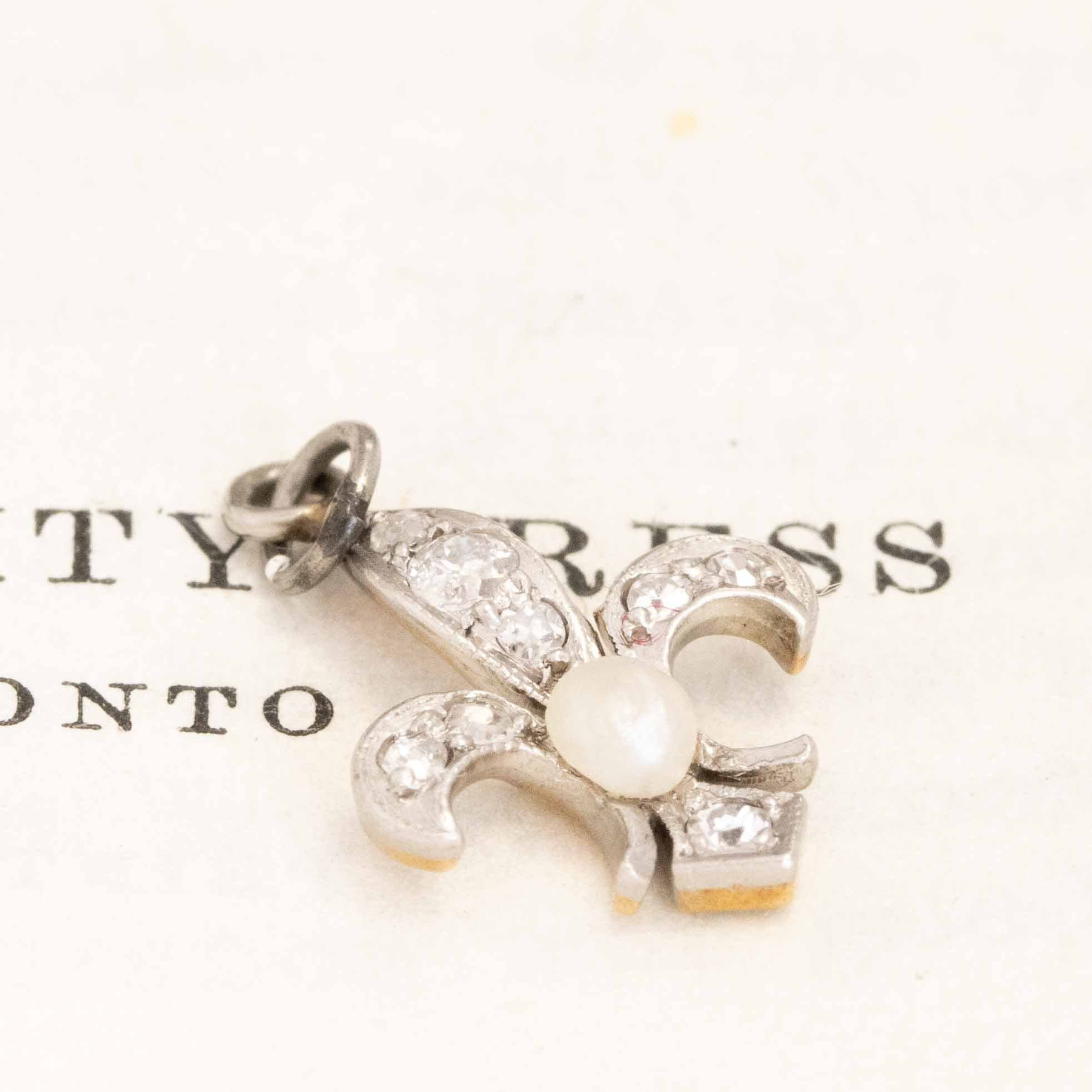 We recently acquired a batch of Deco-era charms that belonged to the same collector with a taste for diamonds, white metal, and yummy gemstone accents. This one is a diamond fleur de lis with a sweet pearl center, the size and spread of which we absolutely adore.