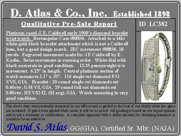One of the most beautiful, blingy, and absolutely stunning cocktail watches that one could possibly add to one's jewelry suite! Made by the well-known jewelry house JE Caldwell, the watch is studded with antique diamonds, pave-set in platinum. The case is in excellent condition and has been observed to be running. The bracelet is in addition, styled beautifully to complement the case. The perfect accessory to complete any outfit!