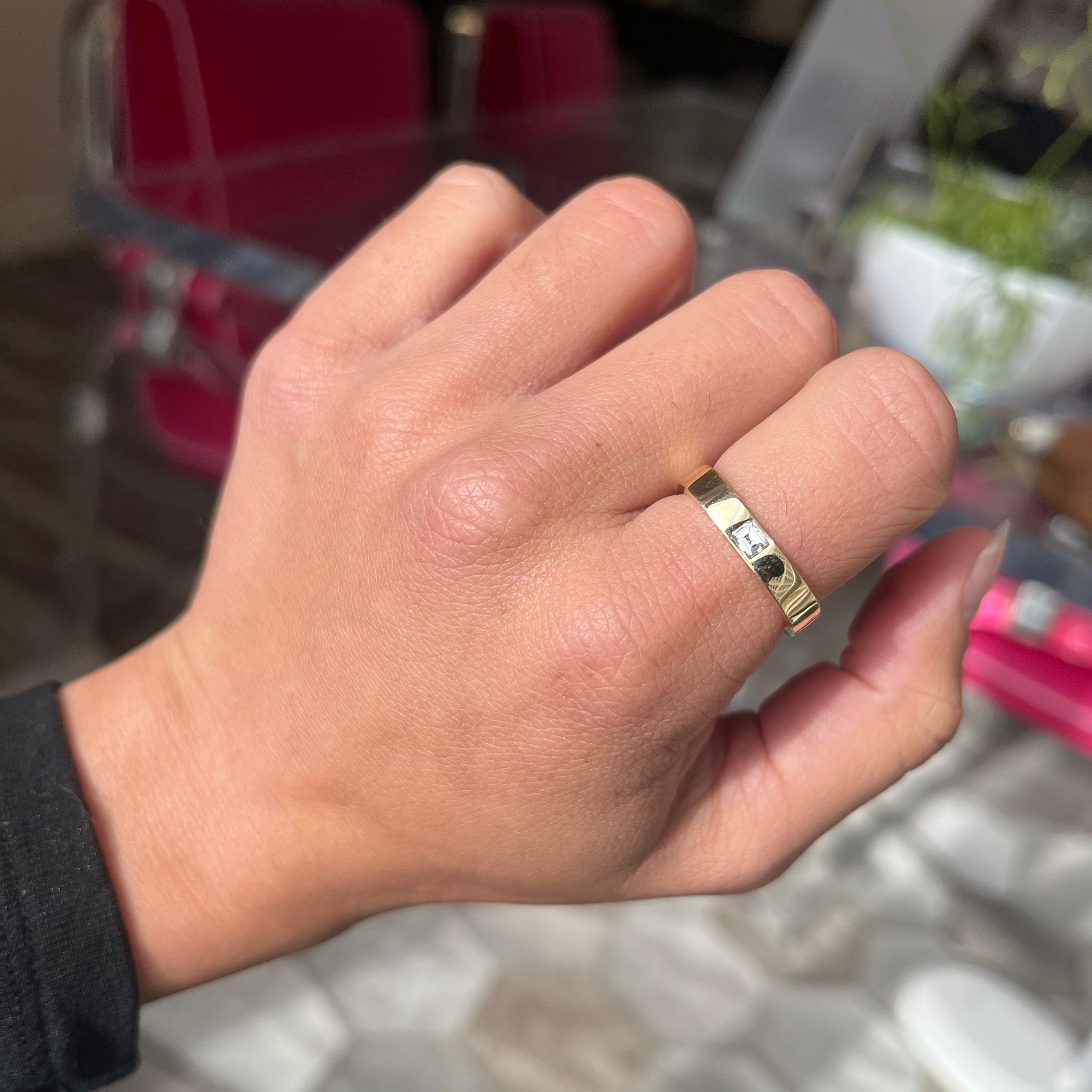A sweet square shank band with a baby baguette cut diamond flush set in the center! Geometric AF and oh so easy to throw on with your daily suite of jewels.