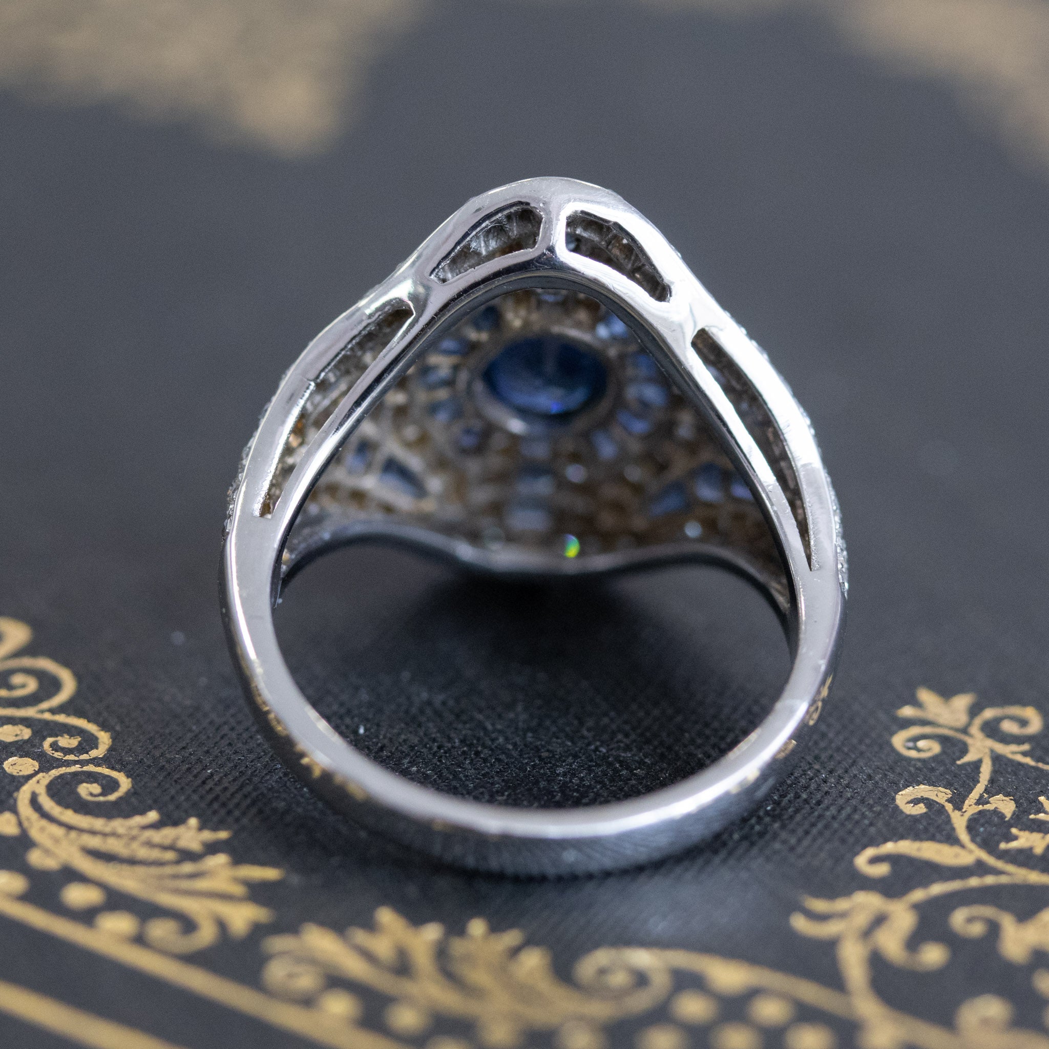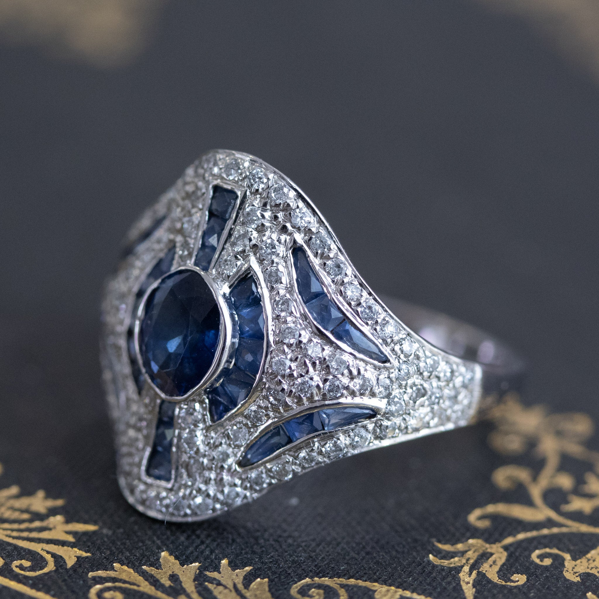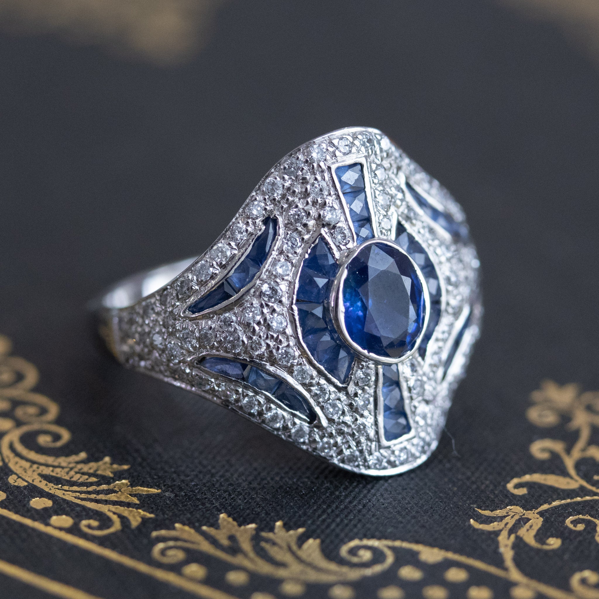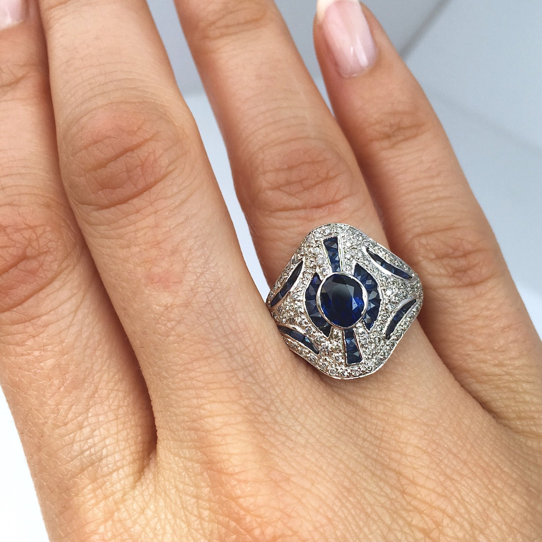 A fun and unusual cocktail ring, the styling of this ring is reminiscent of Art Deco themes with the geometric lines and the use of diamonds alongside blue sapphires. The central stone is a faceted medium blue oval sapphire of approximately 1.00ct, surrounded by 28 caliber cut sapphires (approx. .75ctw); there are also .50ctw of diamonds added in for good measure to yield an ornate yet subtly fancy ring! The setting is low-profile making it very easy and comfortable to wear.