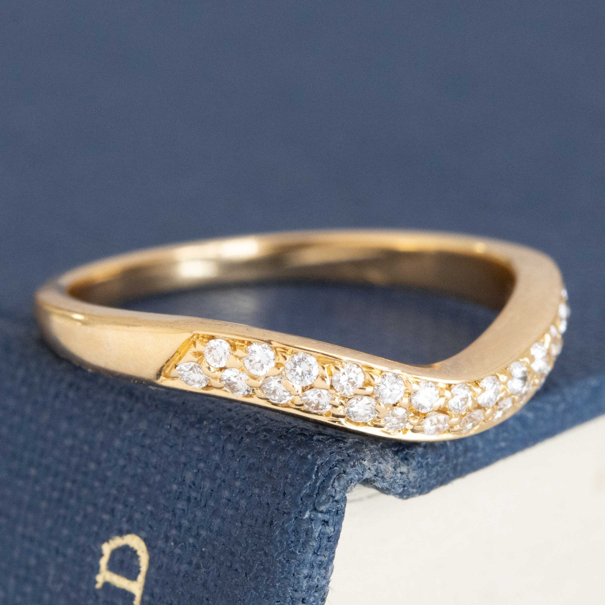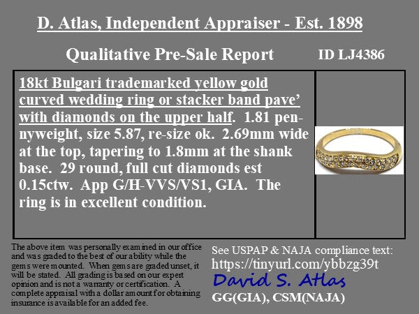 The perfect band for those looking to stack a band flus to their engaement, and a Bvlgari, no less! Beautifully scaled band, with bright and white round diamonds for extra sparkle.