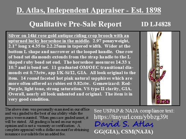 Horseshoes and riding crops are a common motif in vintage and antique jewelry - often stationed together, intertwined, and studded in gems! Ours is set with bright diamonds and rubies, it makes a beautiful brooch but would be fabulous as a pendant.