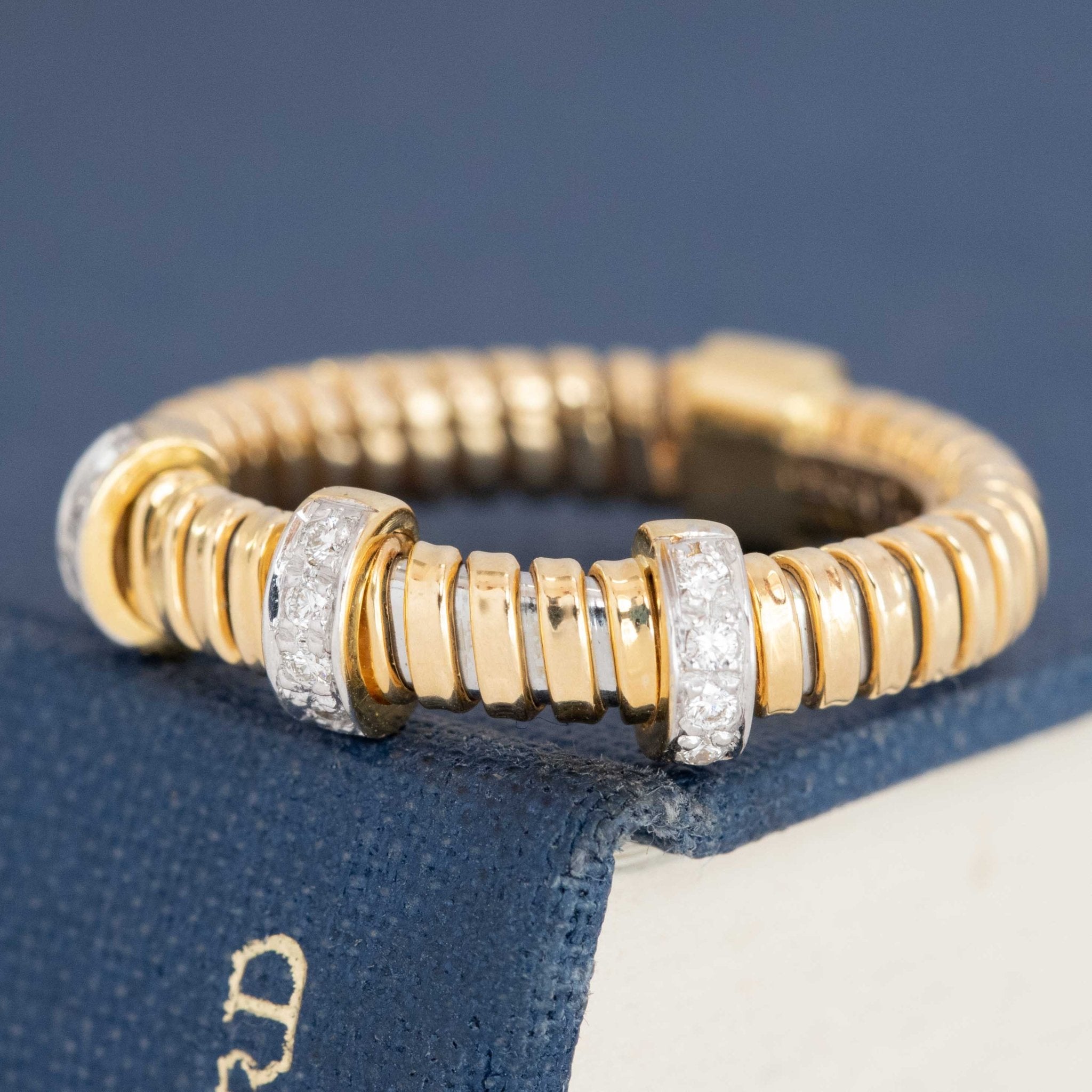 An Italian-made tubogas ring in 18kt gold with diamonds accents - buttery, chic, and bold! The tubogas is excellently crafted and adds such a great texture and visual contrast to one’s stack.