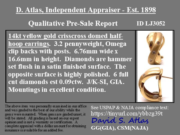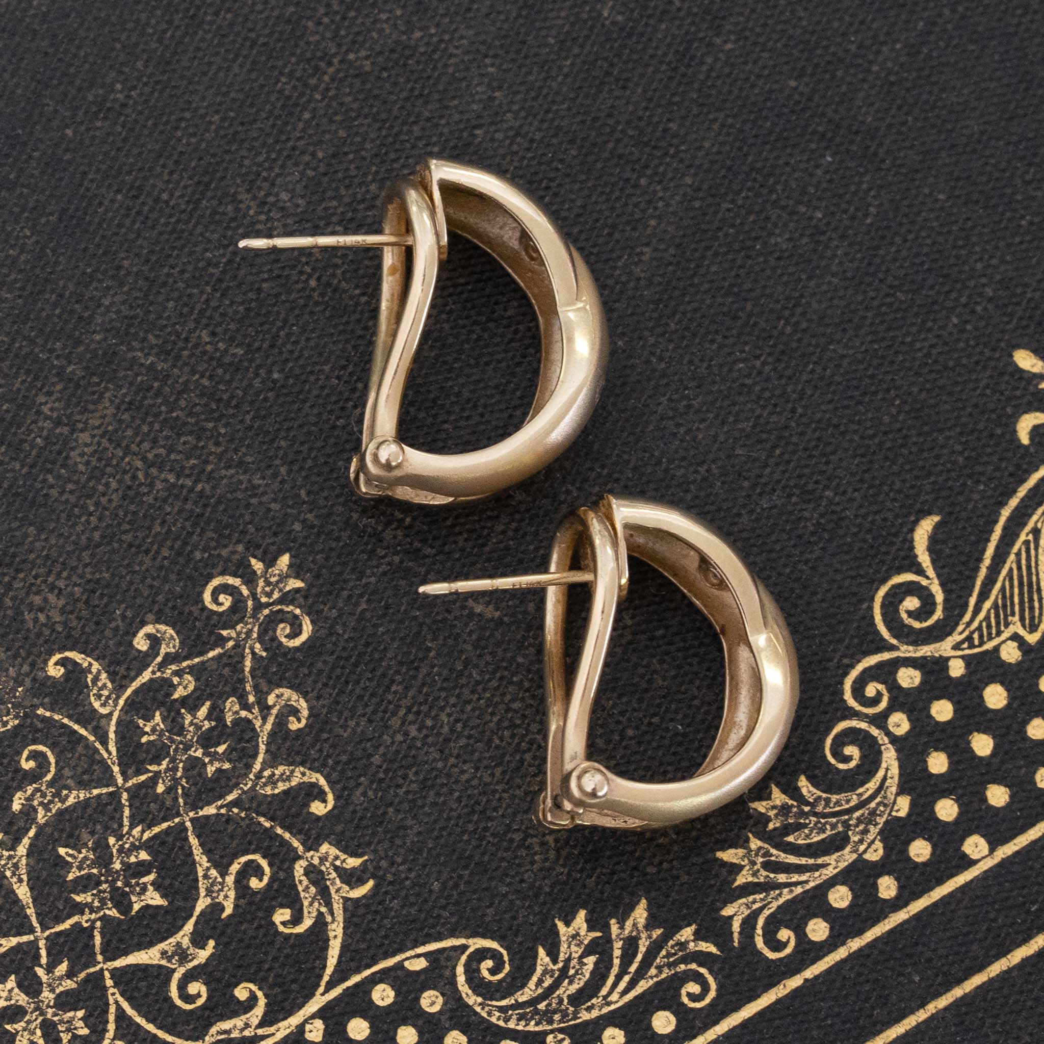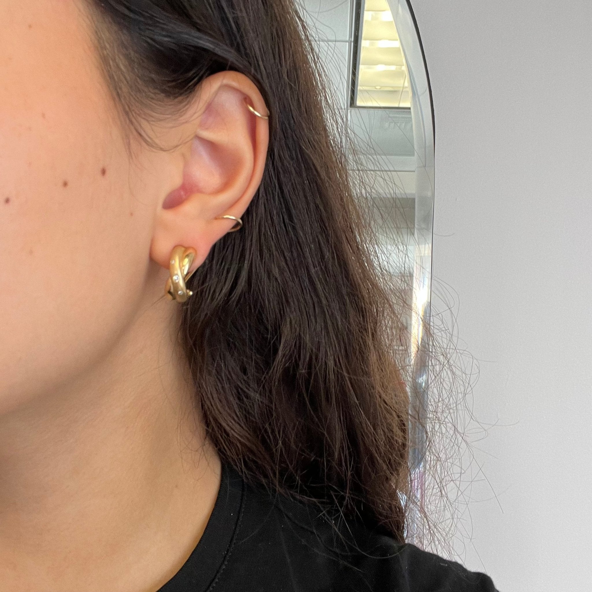 A chic and timeless gold and diamond half-hoop earrings, with a slight twist motif and dual finishes in satin and high polish. A super cut pair for daily wear, easy to dress up and down with any outfit you throw on. Bold and gold on the lobes, but quite comfortable at the same time!
