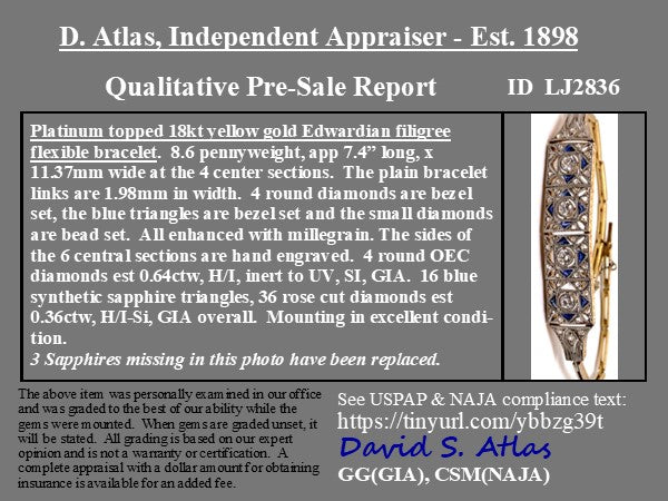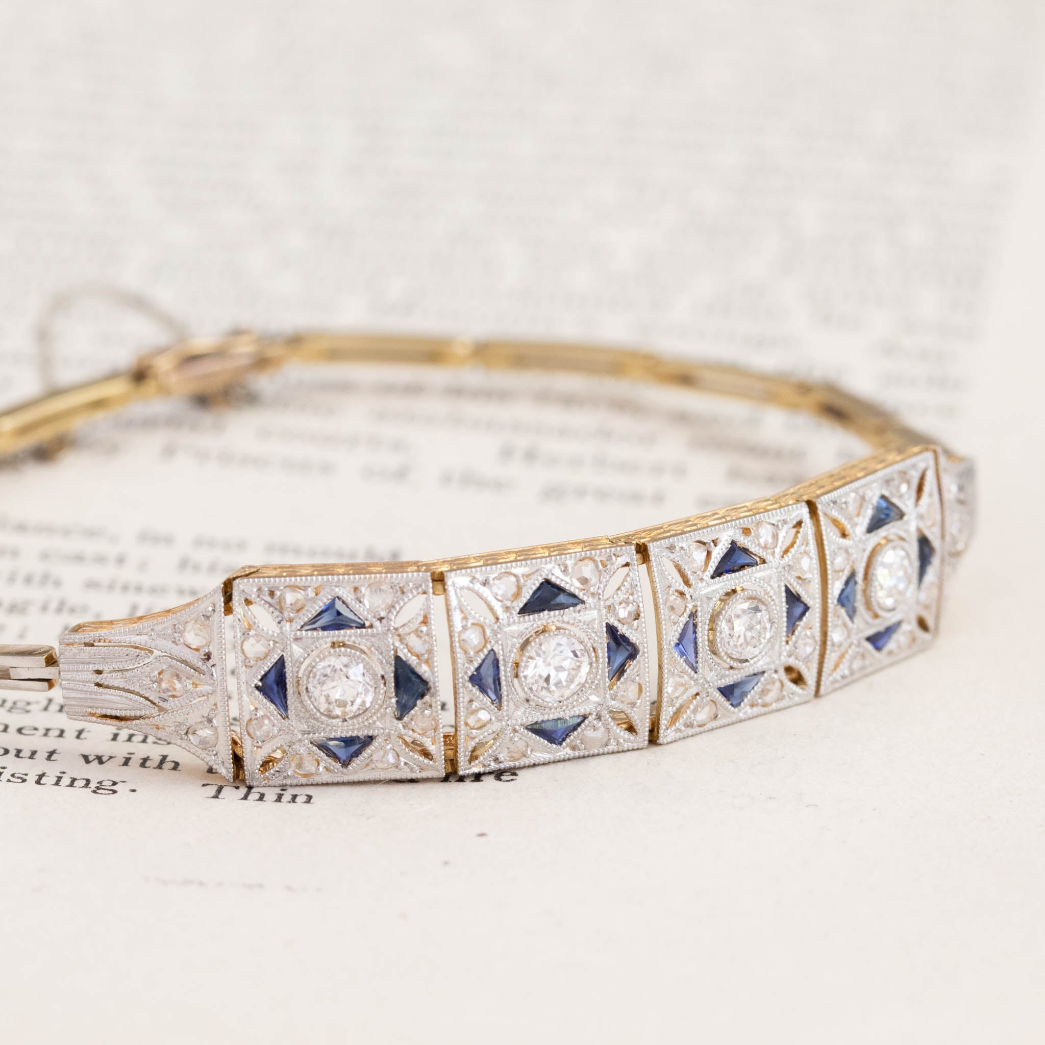 As beautiful and intricate as only an Edwardian-era jewel can be! Low set and elegant on the wrist - this bracelet is simply styled for daily wear yet packs a gorgeous color punch and perfect for dressier evenings as well. Studded with shimmering little rose cuts and blue sapphires, sitting low on the wrist.