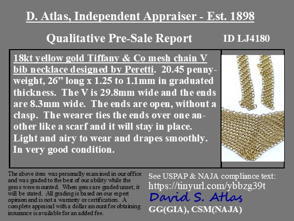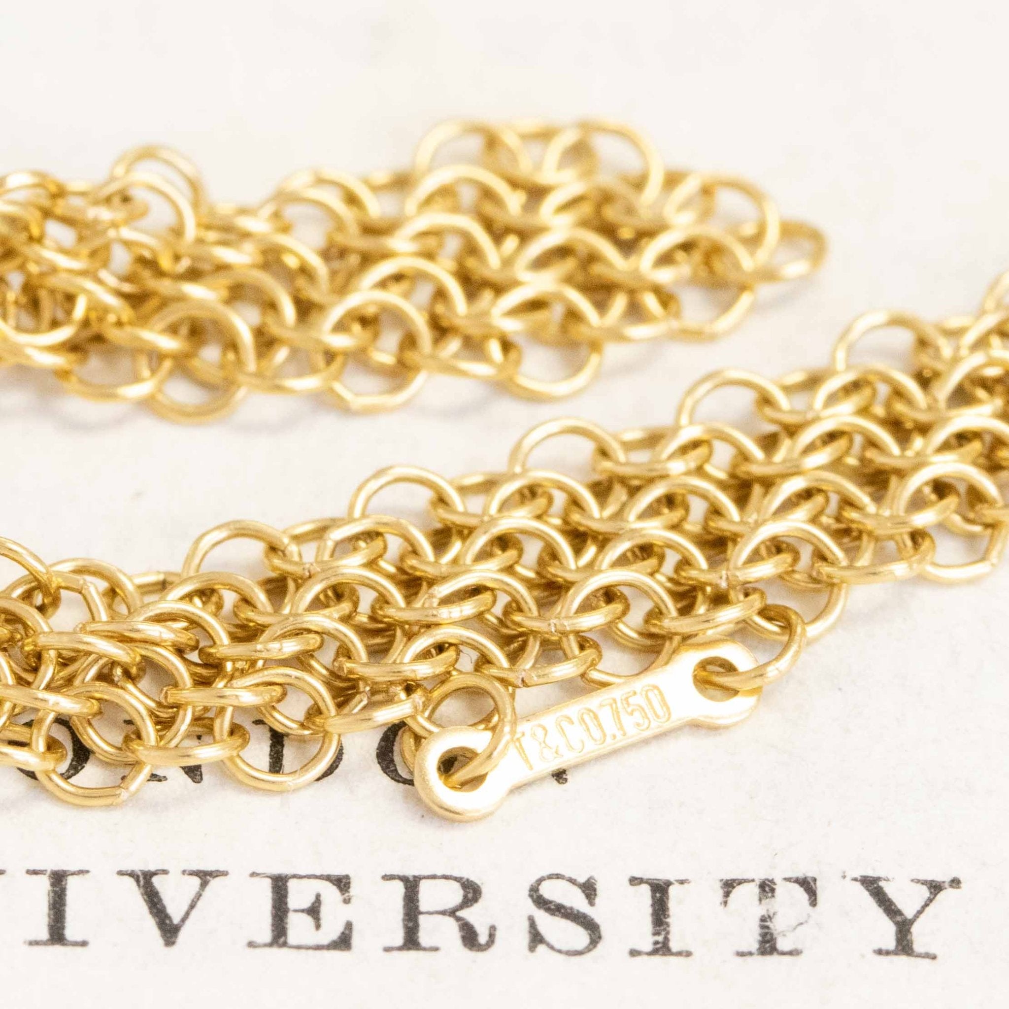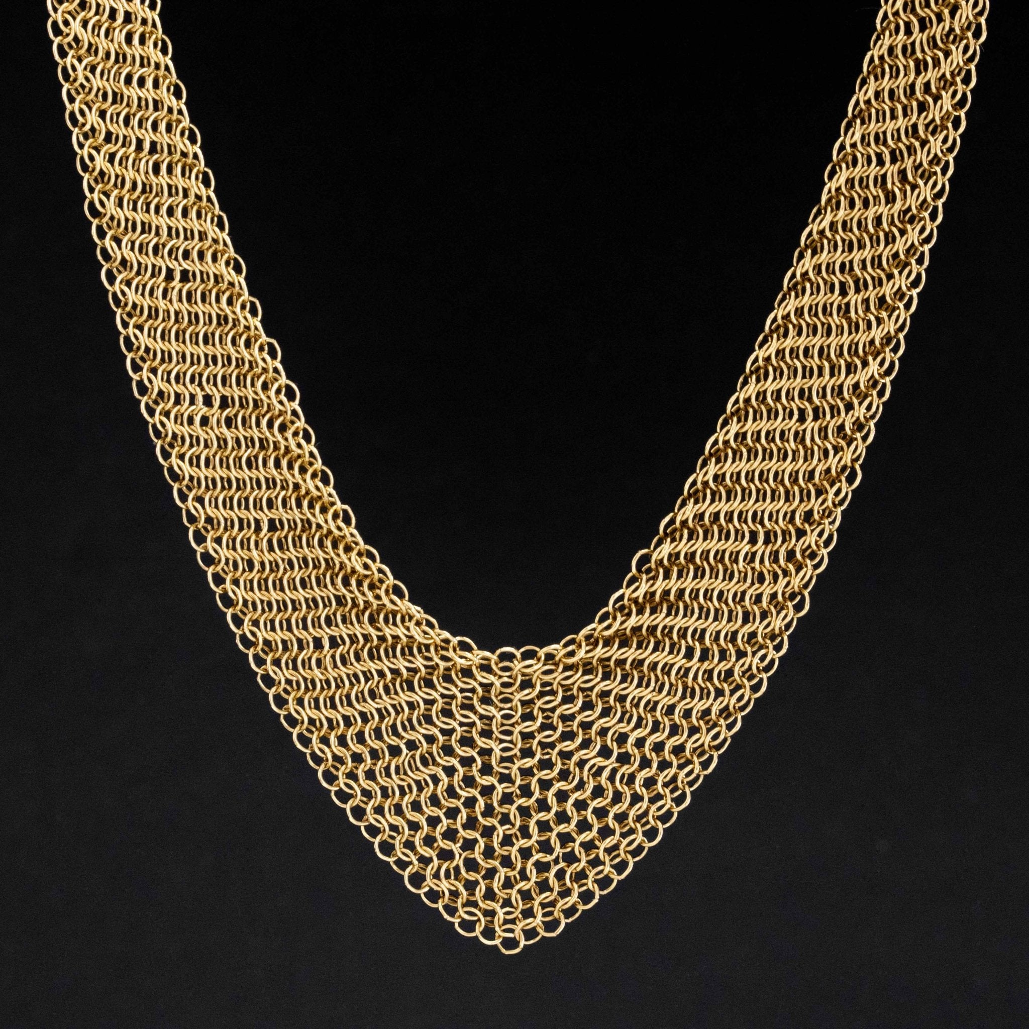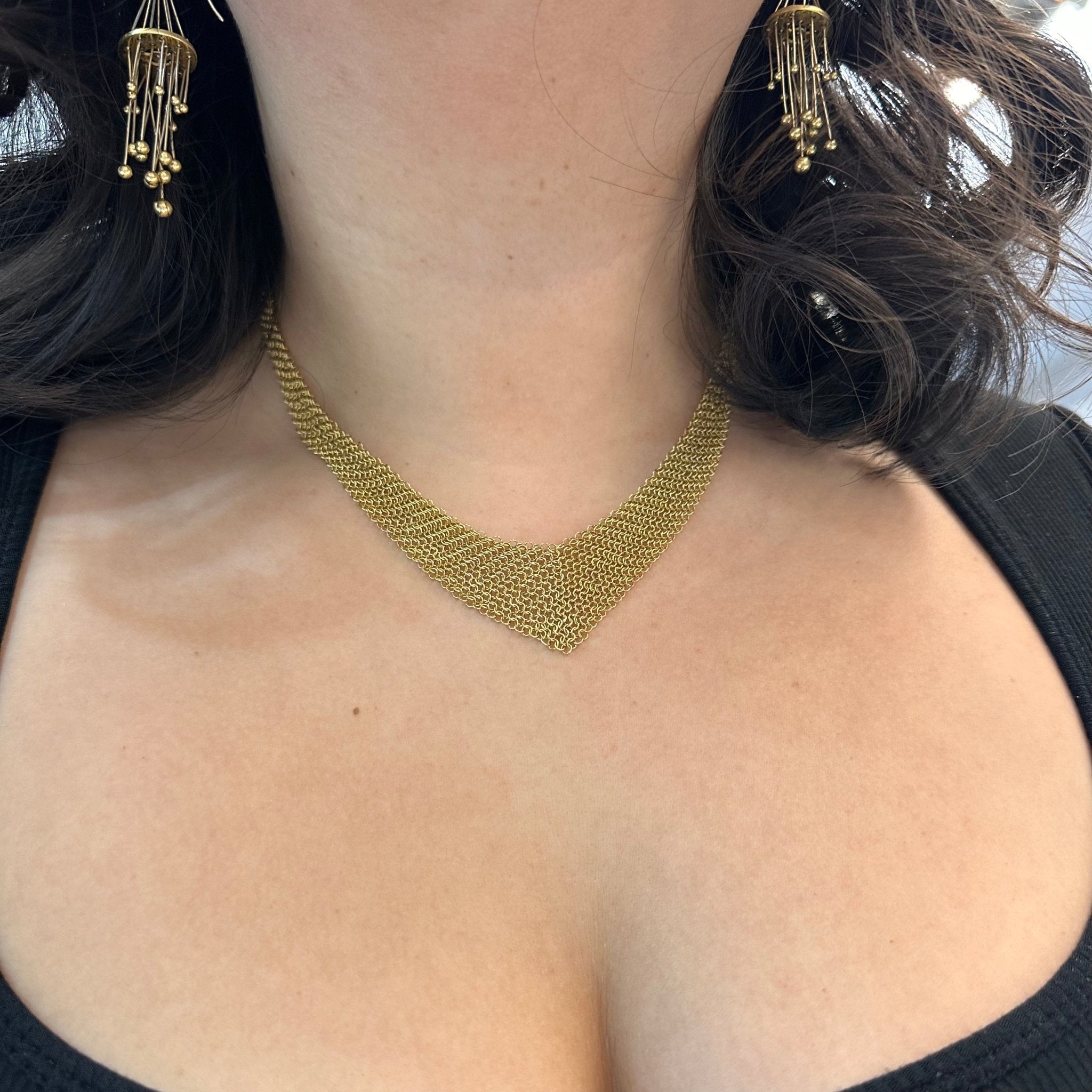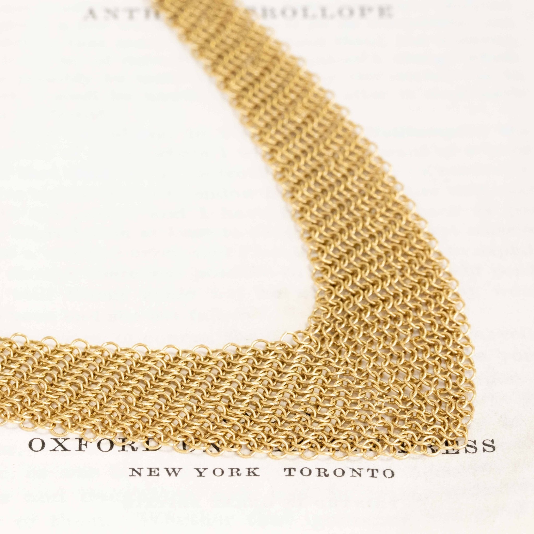 Are we bringing sexy back, heck yeah we are! This is one of designer Elsa Peretti's most iconic designs for Tiffany - her mesh scarf necklace. This piece features delicate gold mesh meticulously woven into a graceful scarf-like design. Its both fluid and sophisticated, elevating both casual and formal looks. It's a staff fave, with all the wonderful and unique ways it can be worn.