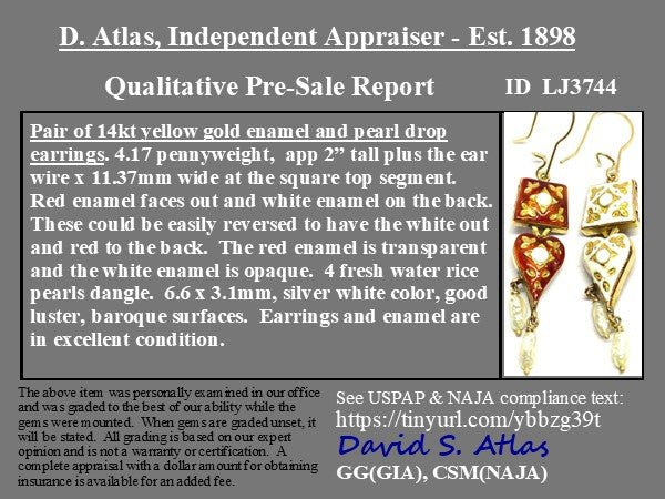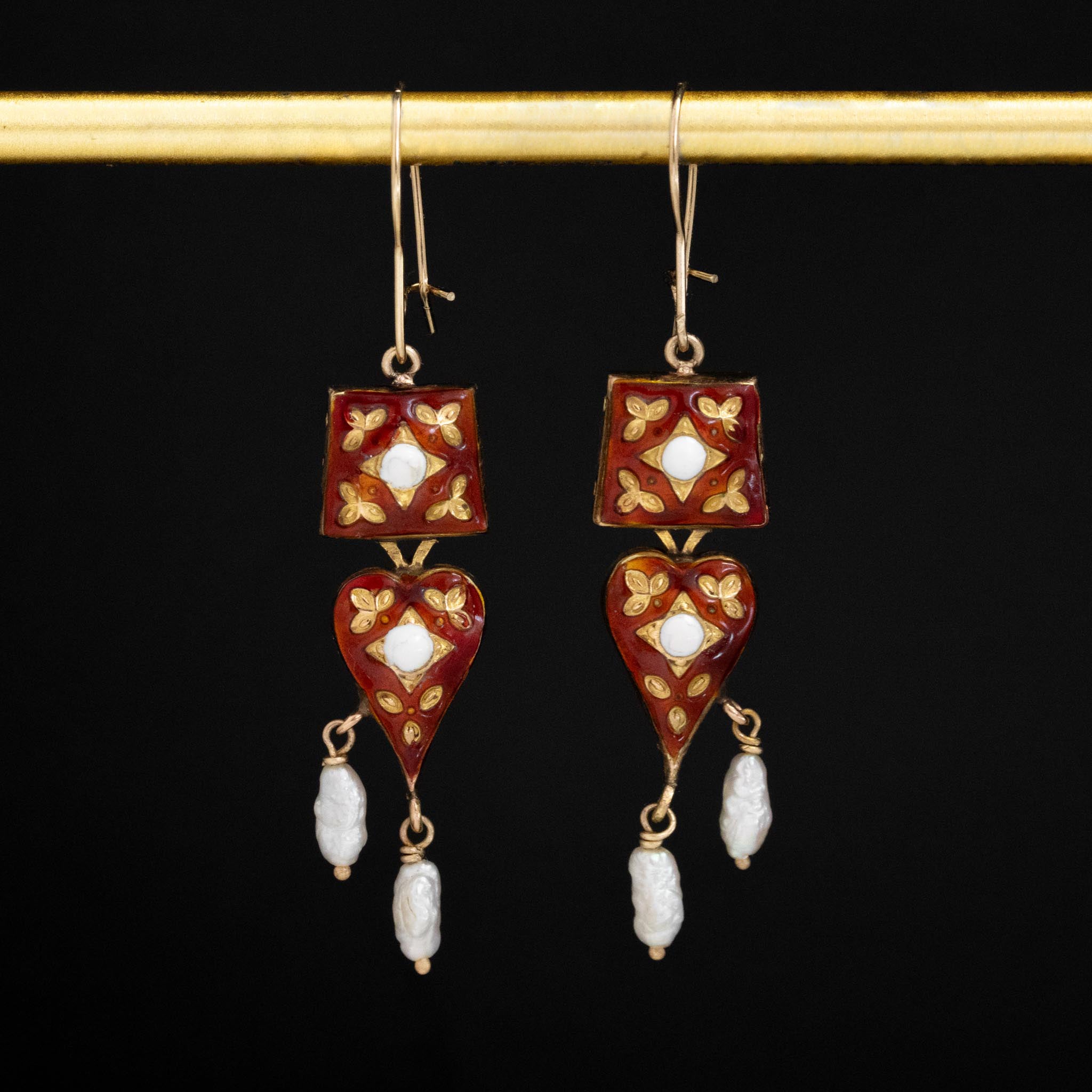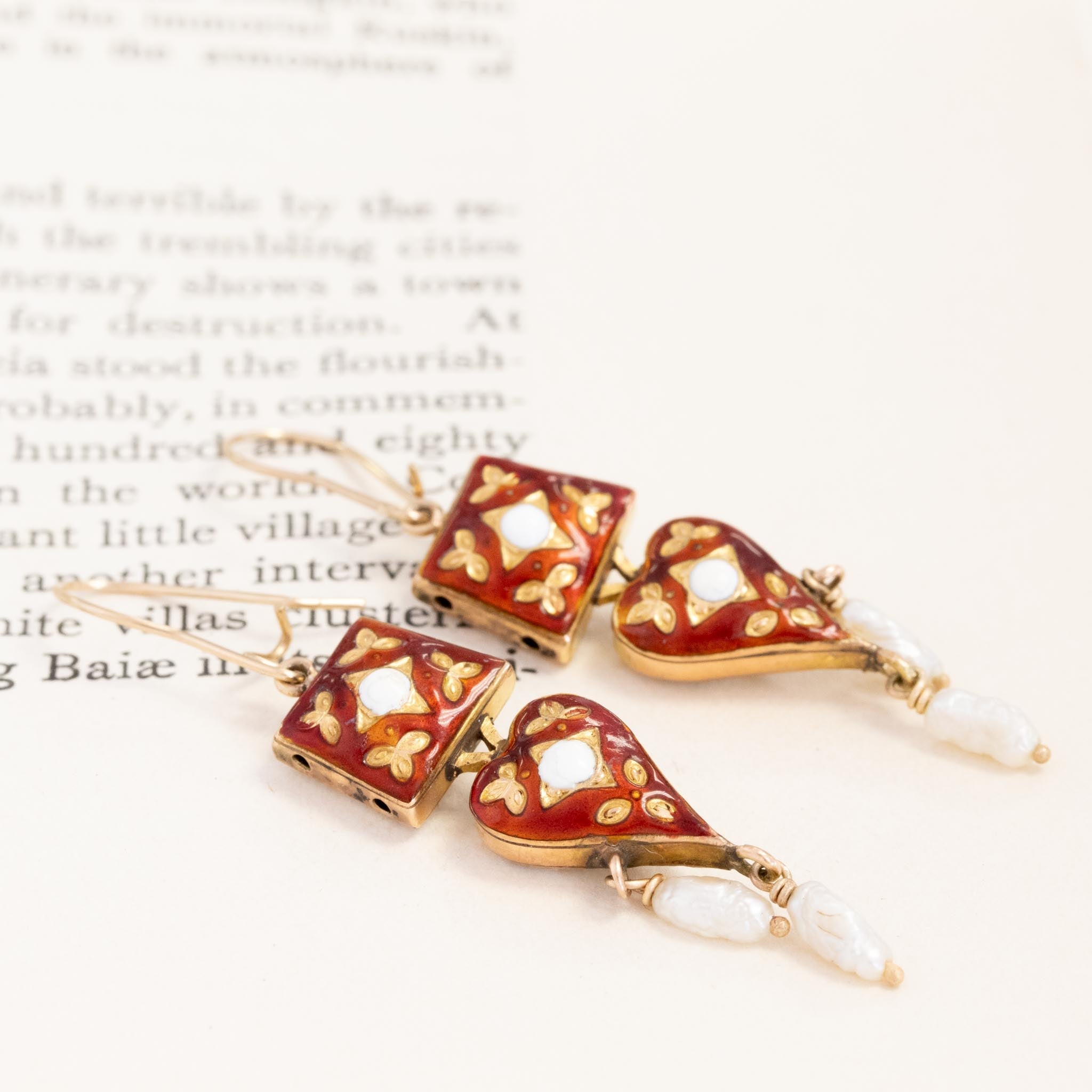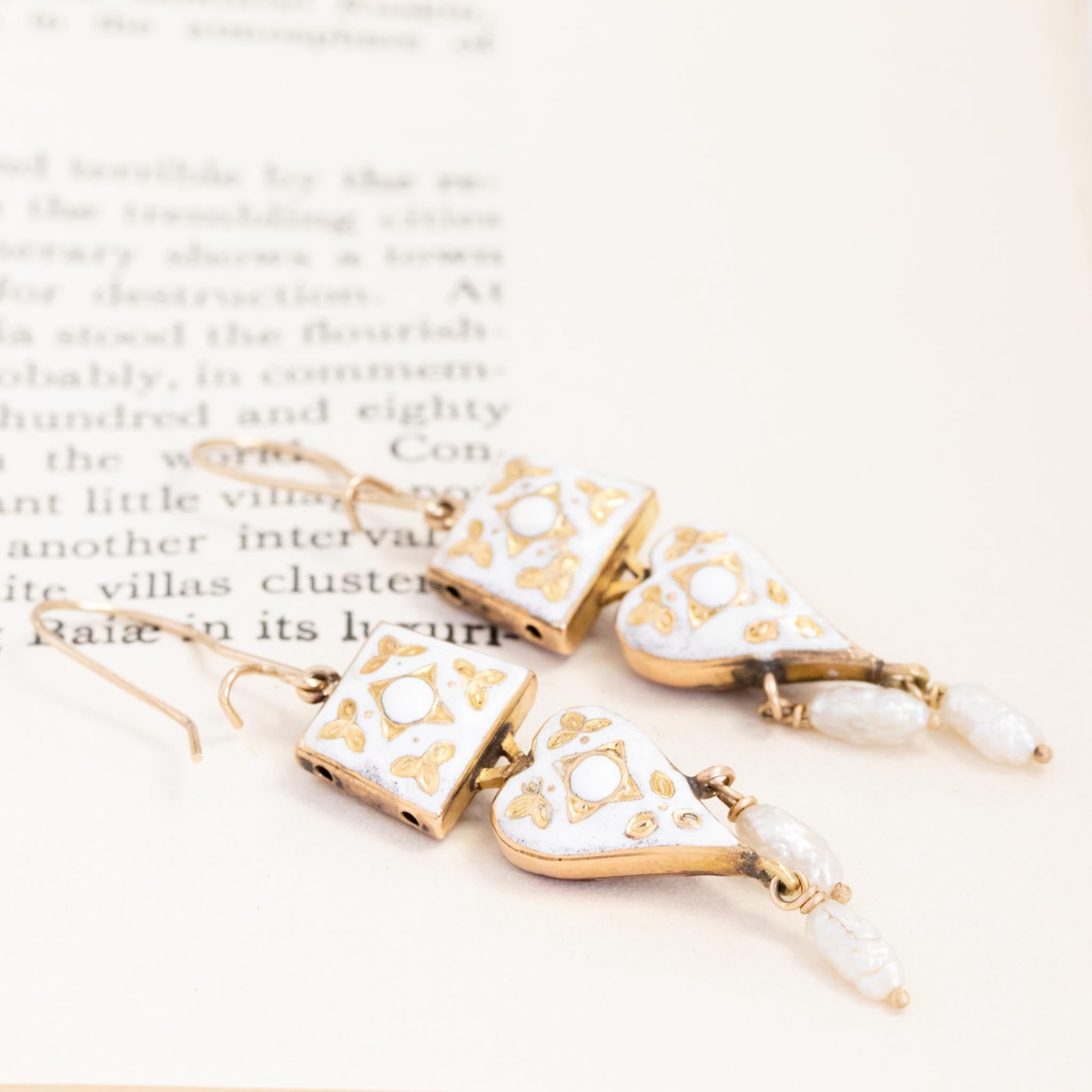 These enamel and rice pearl earrings are the CUTEST, we knew we had to have 'em. They are swingy, add a charming pop of color, and possess such charm. When worn, the red half is what shows in the front, but the drop component can easily be taken off of the wire and switched so that the white side is front-facing!