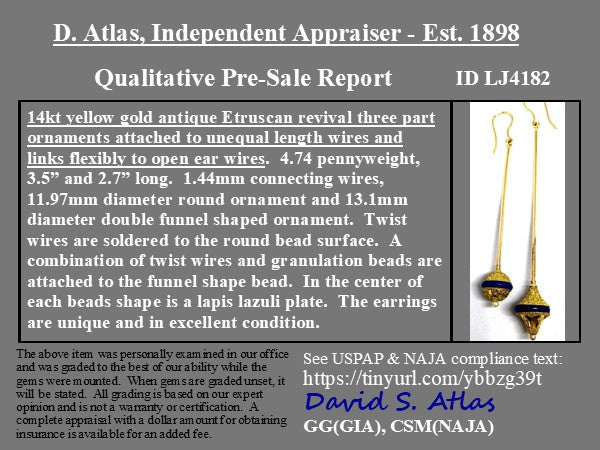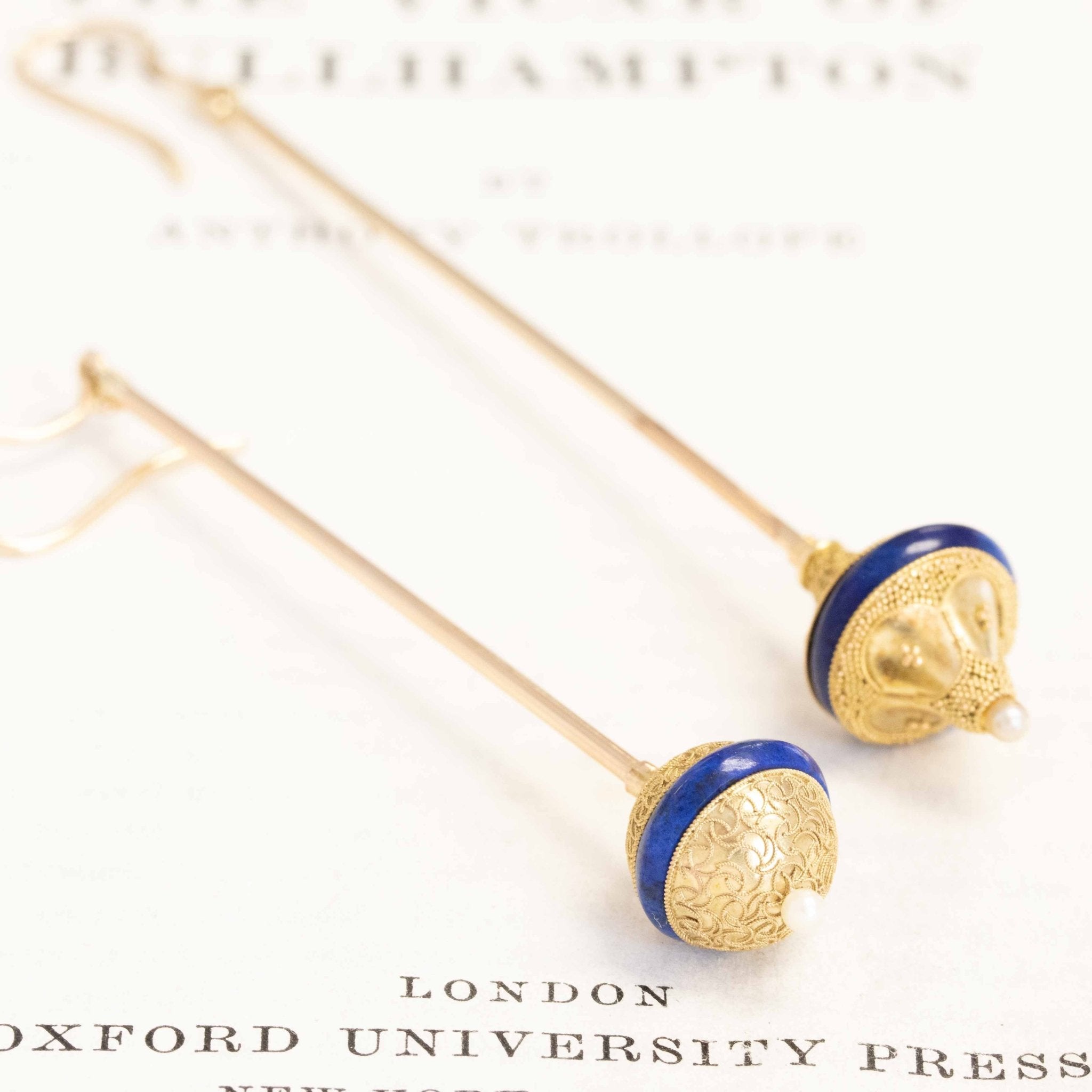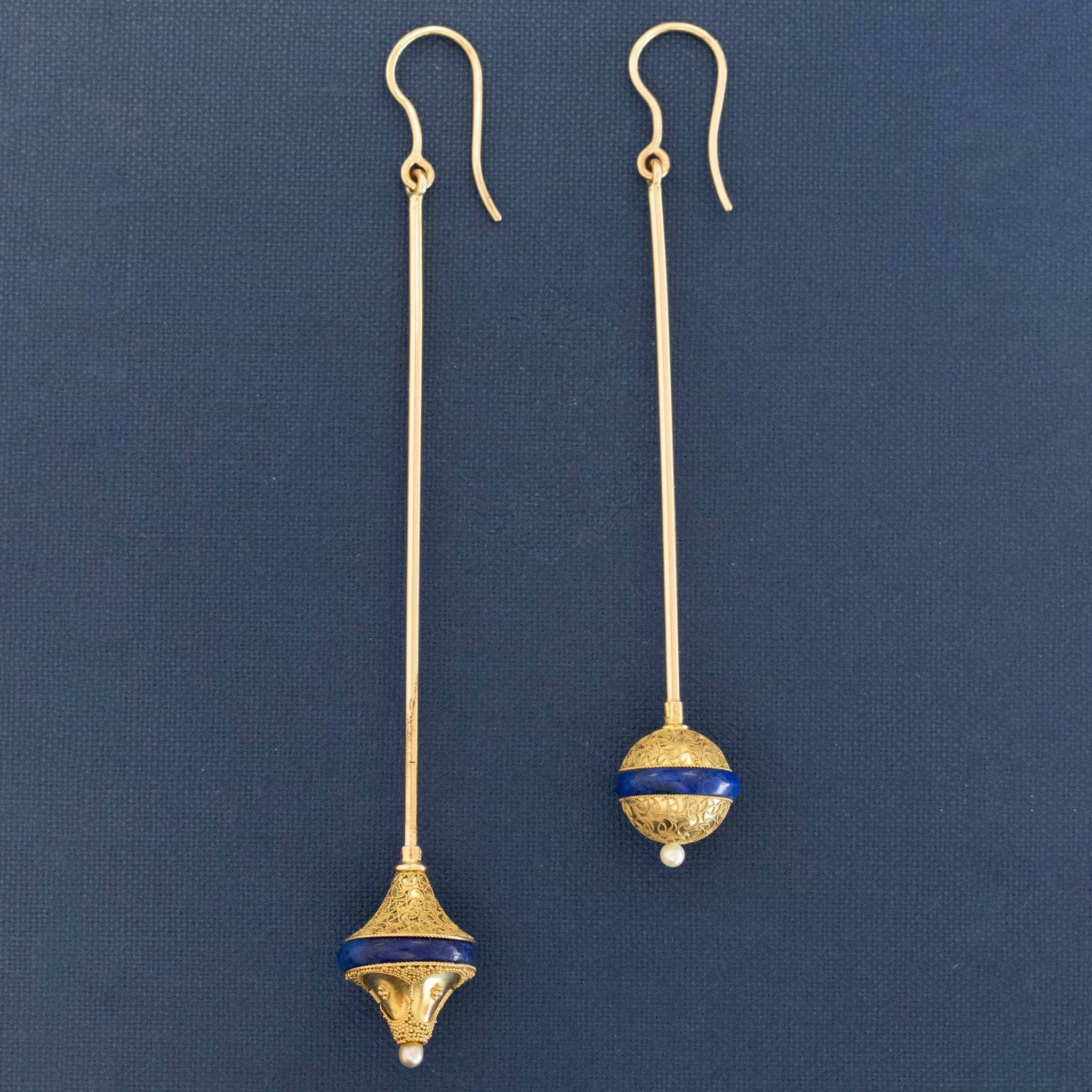 Talk about a little drama! We took this pair of Etruscan-era pins and converted them into shoulder duster earrings - the result is a pair of that earrings that are sexy, chic, and simply stunning! The blue enamel band adds that little pop of color, as the earrings swing to and for with every movement.