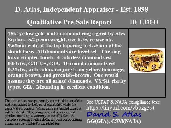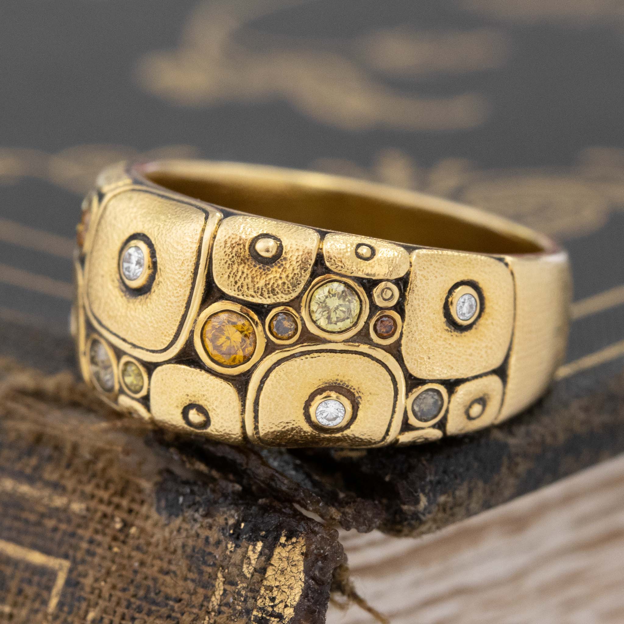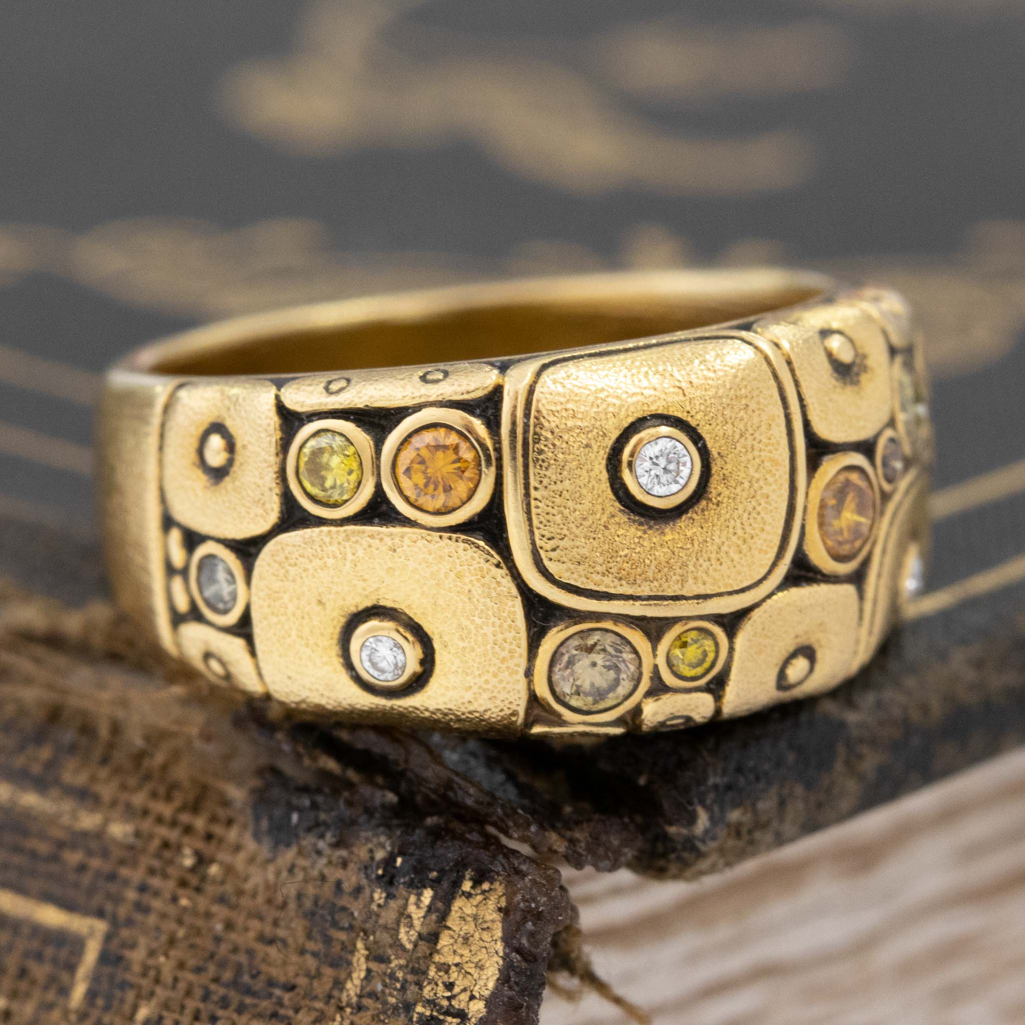 One of the more unique iterations of Alex Sepkus' "Little Windows" collection, set with a selection of different fancy colored diamonds. Classic Sepkus touches with the stipple finish and whimsical little "windows" set with the diamonds.