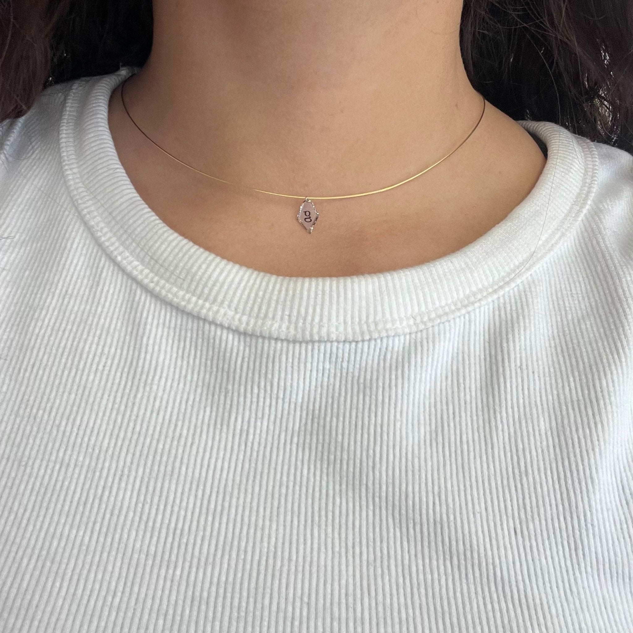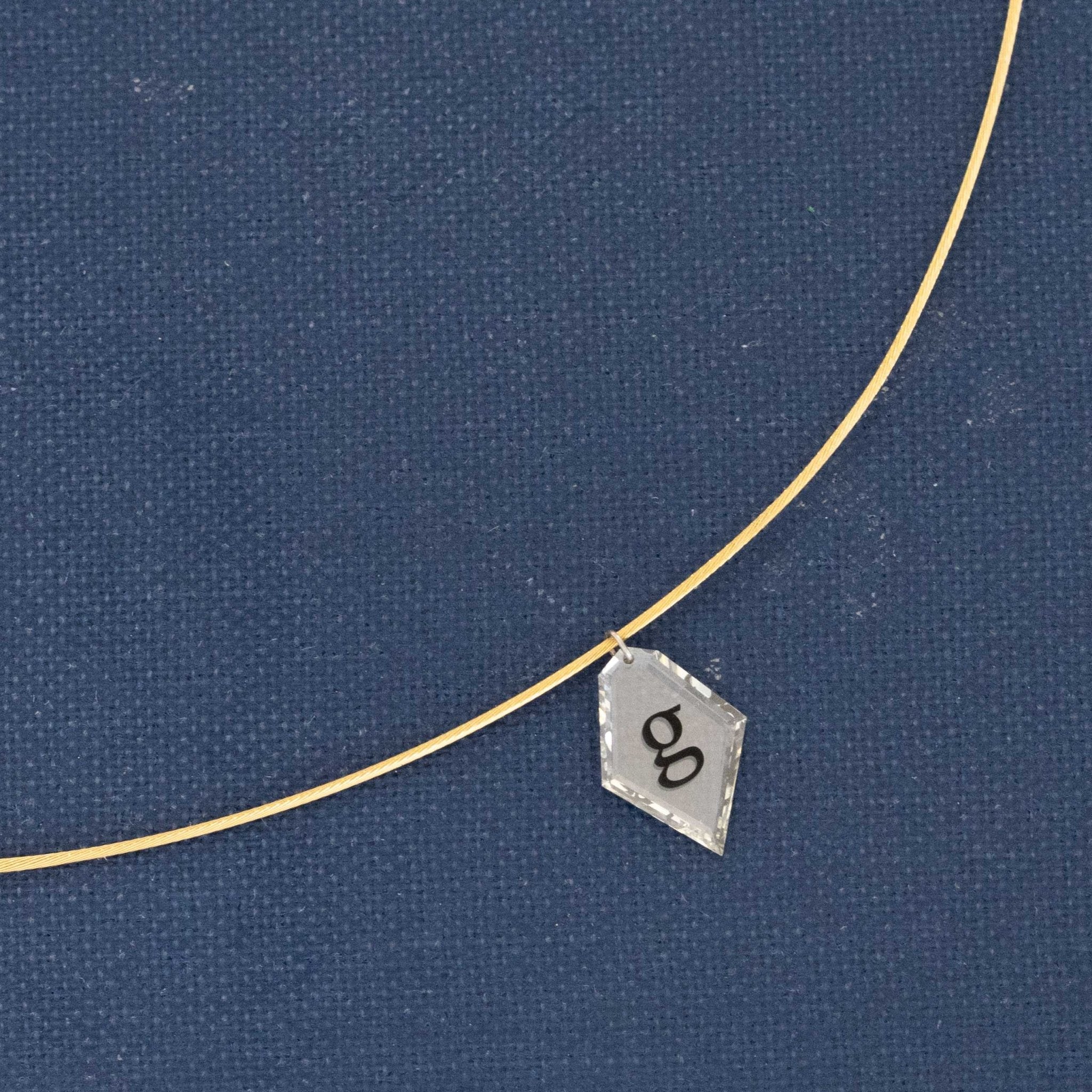 This kite shaped portrait cut diamond has that sleek geometric shape, and is strung on a vintage wire collar in yellow gold.